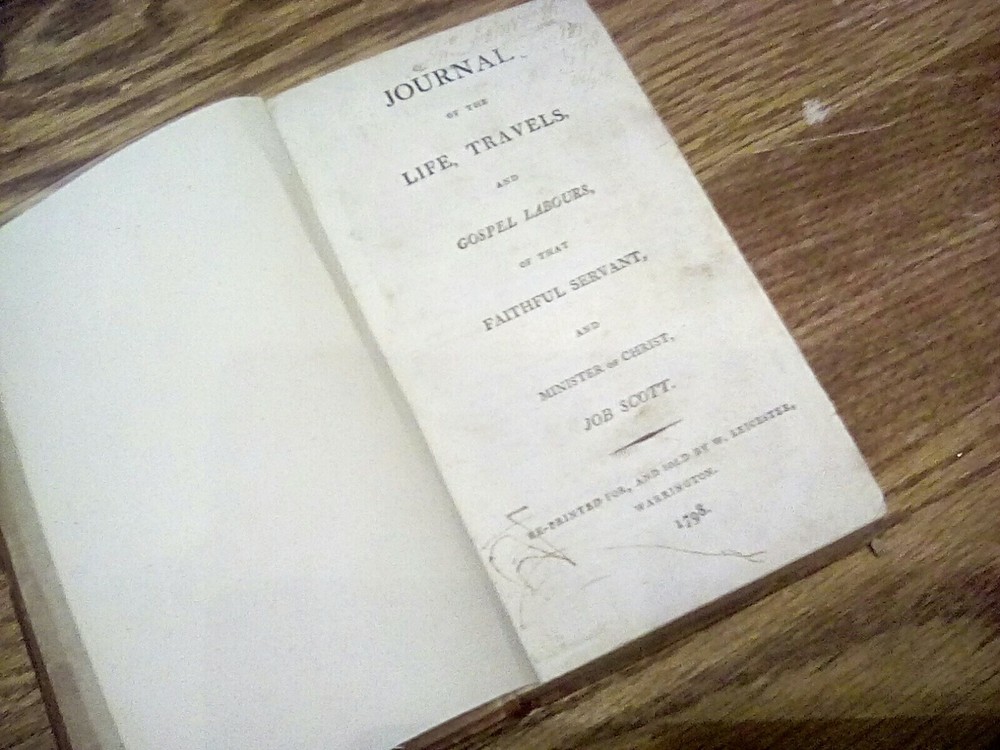 Antique leather-bound Journal of Job Scott 1798 American Quakers. Heavy wear to boards and spine. Light scribbling to title page. Light nourishing throughout, but nothing significant. Binding is sound throughout. No loose or missing pages.