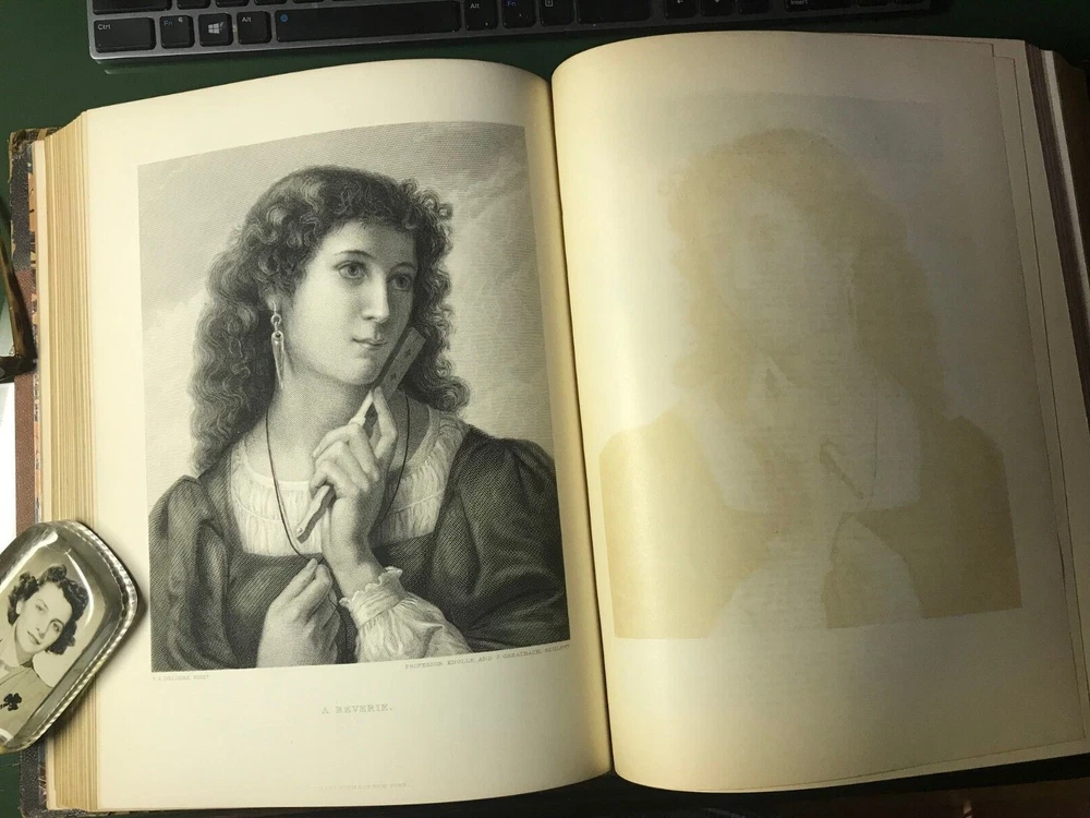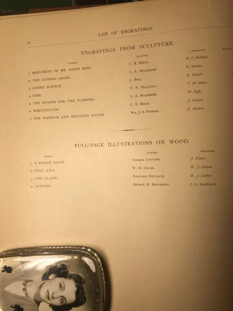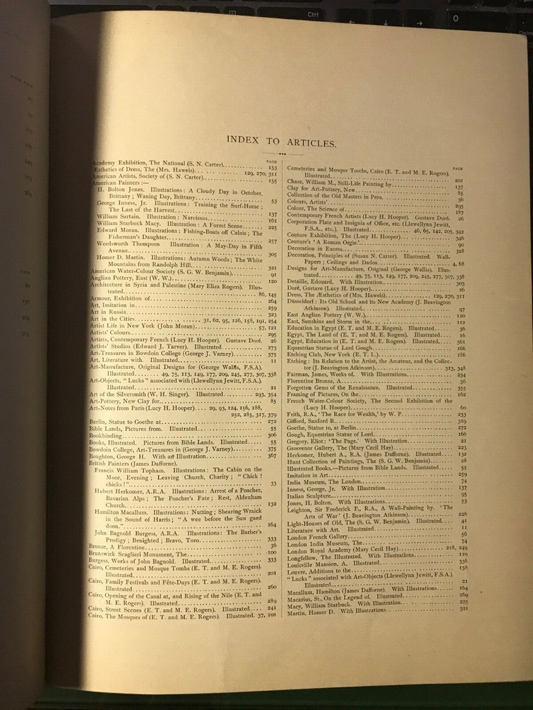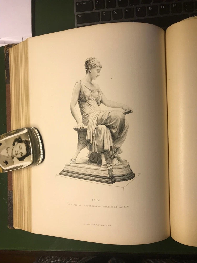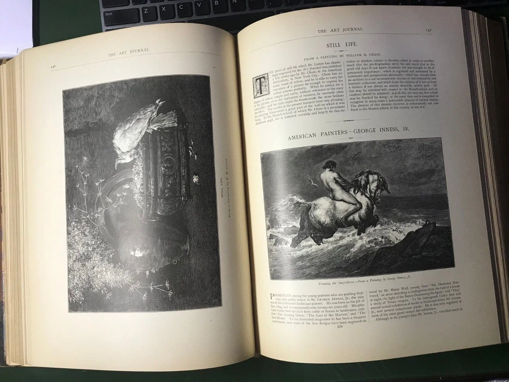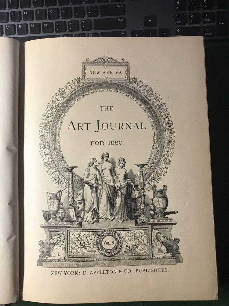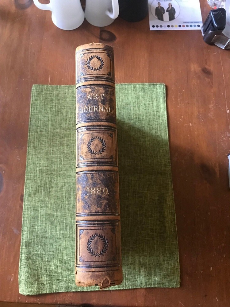 Art Journal for 1880, D. Appleton & Co. Publishers, New York. Fine leather book with many tissued engraved plates; marbled end papers and gilt to all edges and title lettering. List of engravings on steel [29], engravings from sculpture [7], and full-page illustrations on wood [4]; index to articles. Leather to spine and covers is scuffed, but no foxing to the paper and plates - - something rarely found in the bound volumes of this journal. Shipping is free to U.S. only.