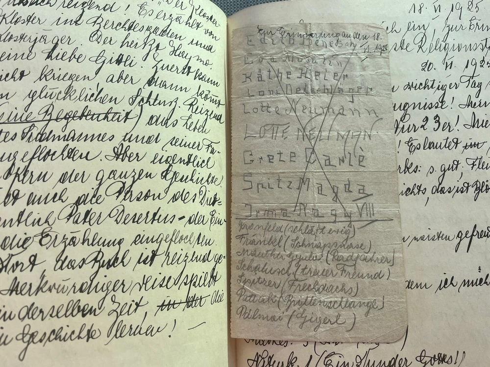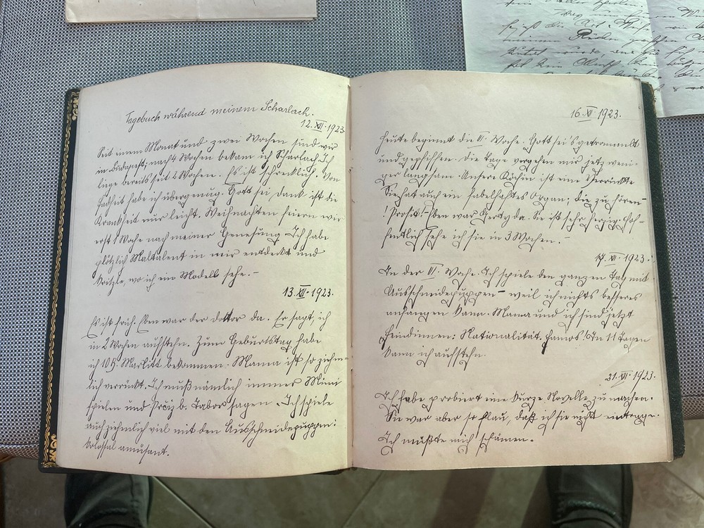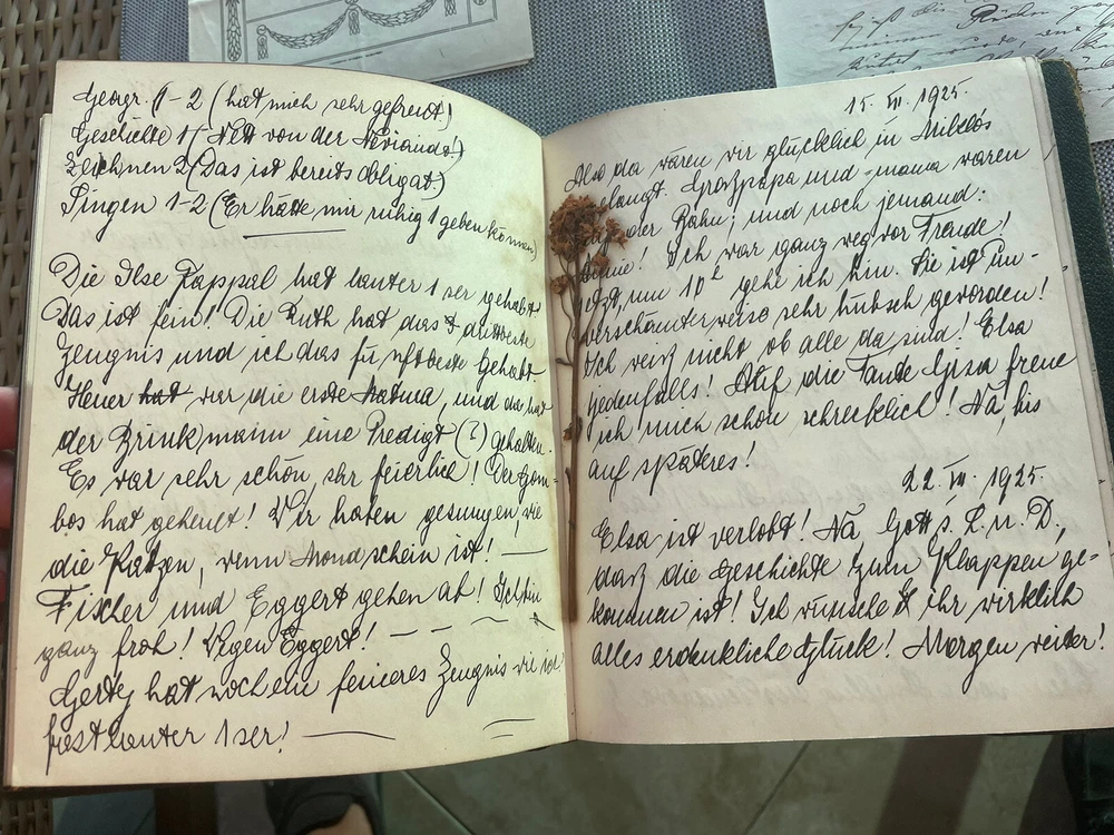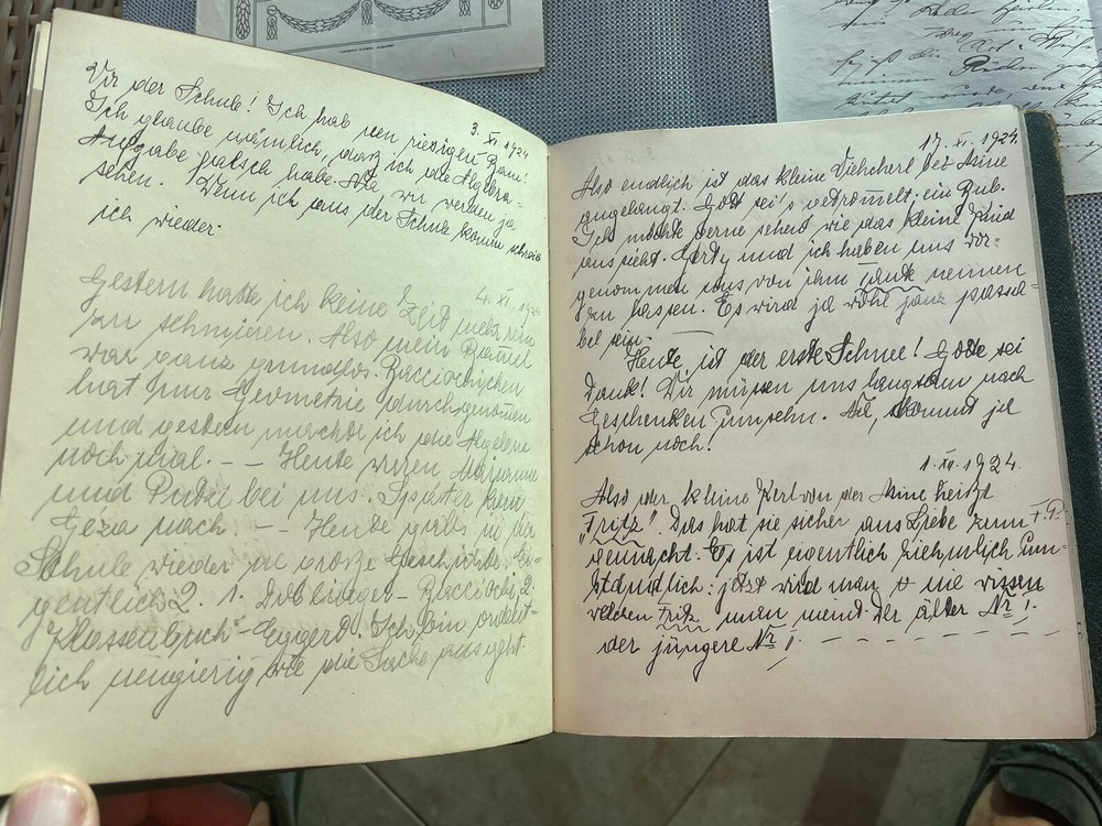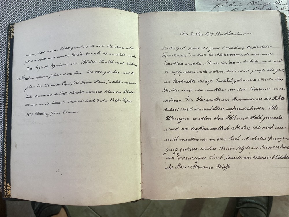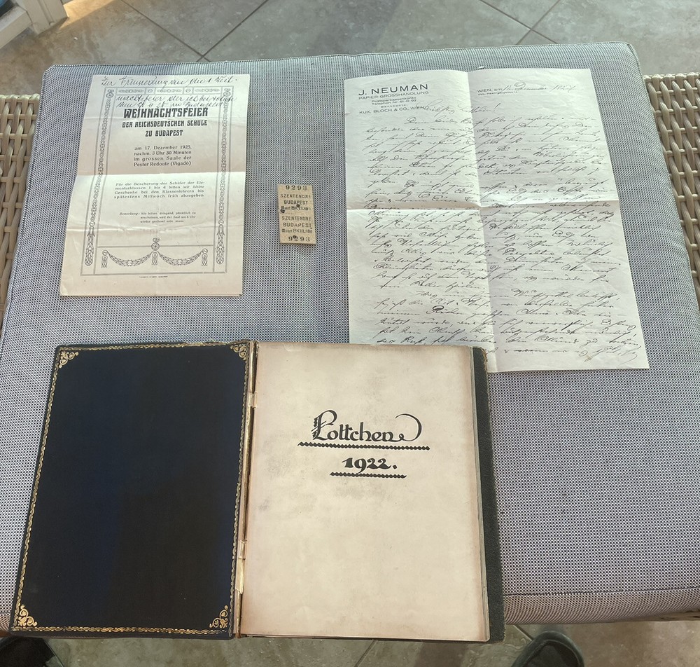Austrian Hungarian Lotte Neuman Wien Budapest Handwritten Diary 1927 up leather. From an estate in Miami Beach Florida Many additional documents found in this diary Like bookmarks in form of botanical herbs Letter from her father Budapest Theater advertisement Christmas party announcement Tickets to the theater Well educated young girl Elegant leather binding with gilt decor See images