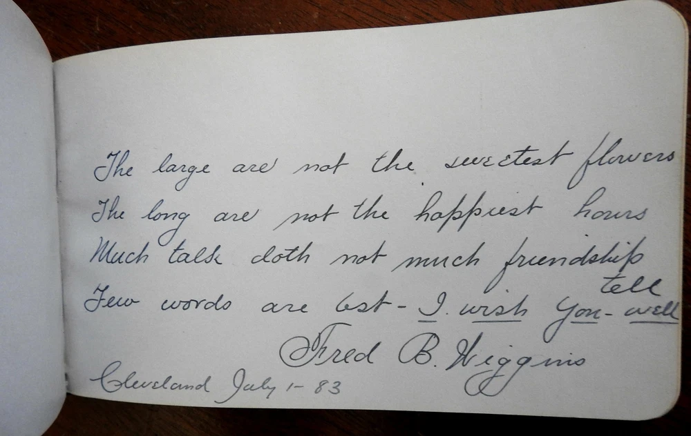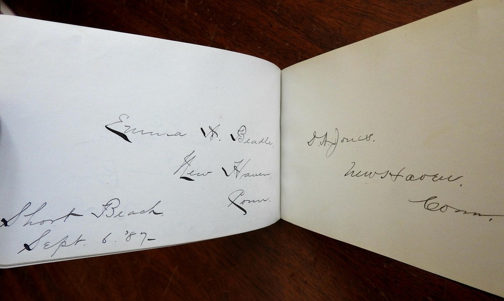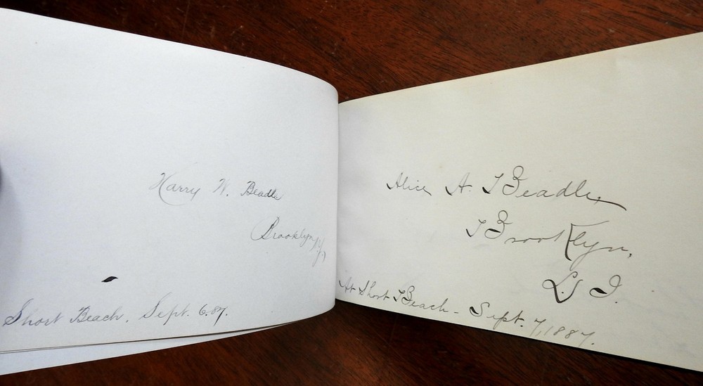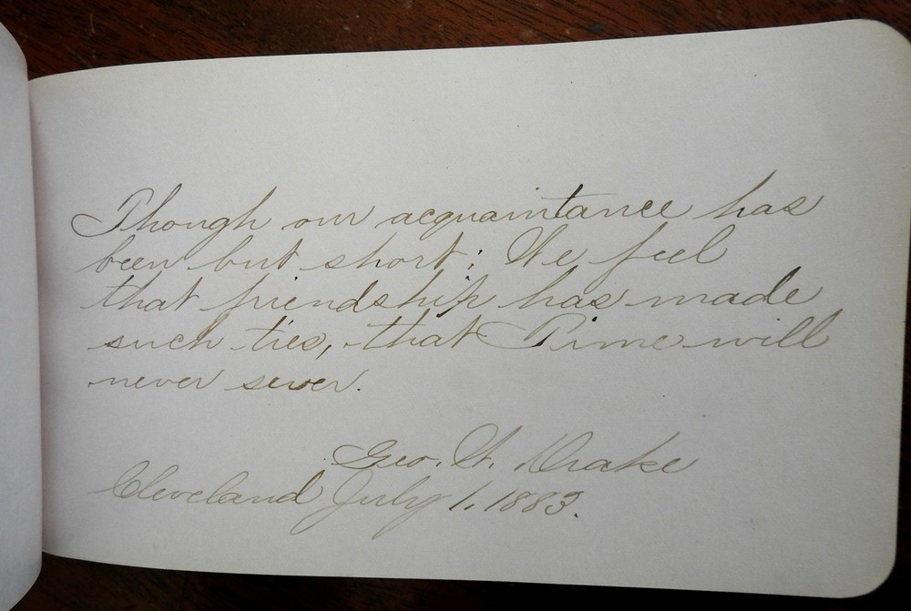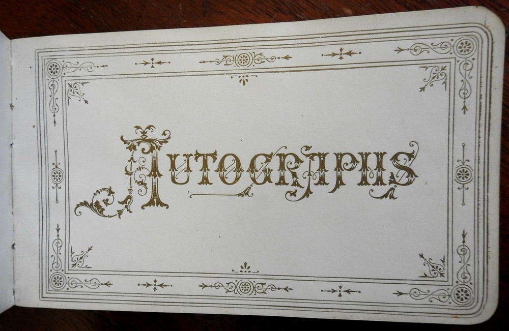 Autograph Album c. 1880's small old gilt leather oblong album book re-useable Autograph Album c. 1880's small old gilt leather oblong album book re-useable (Old Books, Leather Book Bindings, Autograph Album, Americana). Autographs. Published c.1880, United States. Period leather oblong binding, gilt cover lettering, all edges gilt. Blank pages, c. 70 pages, ornamented title page printed in gold ink. With 16 autographs inscriptions dating 1883-7. Most pages remain blank, good antique album to re-purpose for modern usages. Binding remains clean, tight, and sound. Some scuffing and age wear to leather, but leather remains supple, binding sound and sturdy, looks like what it is- an old leather album. Interior contents display a pleasing clean age patina. Book remains well preserved and attractive on the shelf. It displays a pleasing and unique age patina and is in nice antiquarian condition, the age flaws easy to overlook or forgive. Please review photos for more detail and our best attempt to convey how this antique item survives. Book Measures c. 4 1/4" H x 7" W. [B859].