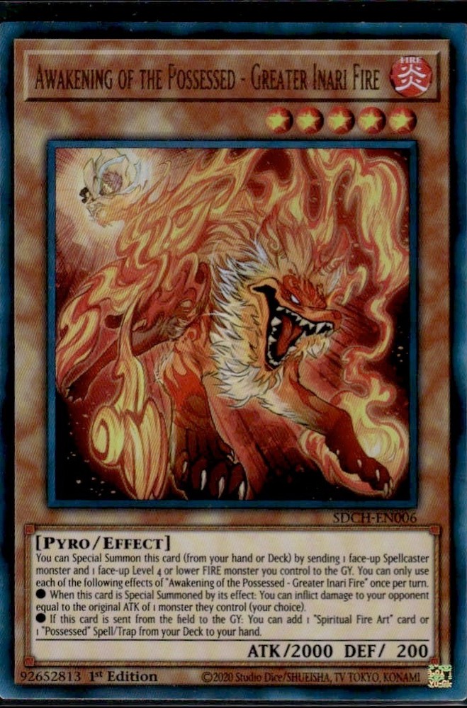 | Card Text | You can Special Summon this card (from your hand or Deck) by sending 1 face-up Spellcaster monster and 1 face-up Level 4 or lower FIRE monster you control to the GY. You can only use each of the following effects of "Awakening of the Possessed - Greater Inari Fire" once per turn. • When this card is Special Summoned by its effect: You can inflict damage to your opponent equal to the original ATK of 1 monster they control (your choice). • If this card is sent from the field to the GY: You can add 1 "Spiritual Fire Art" card or 1 "Possessed" Spell/Trap from your Deck to your hand. |