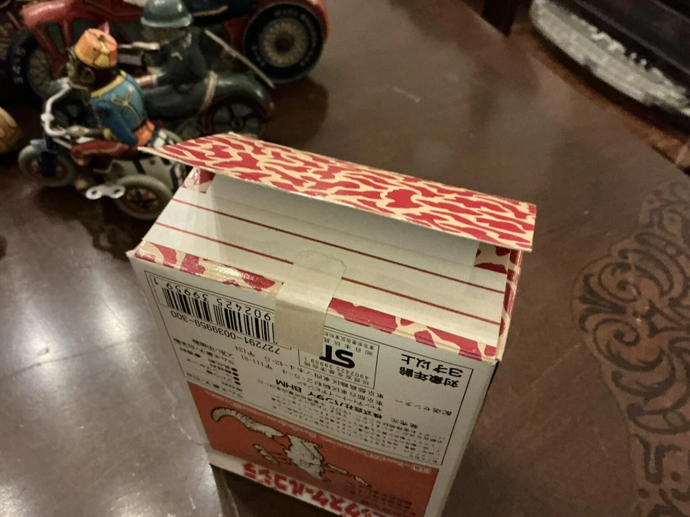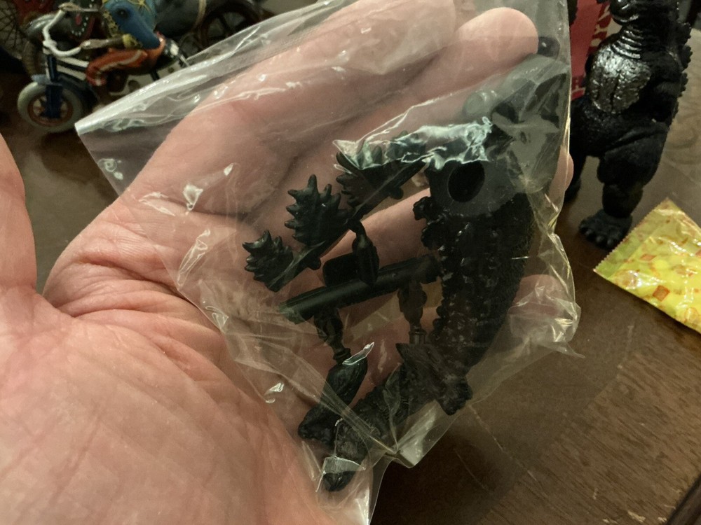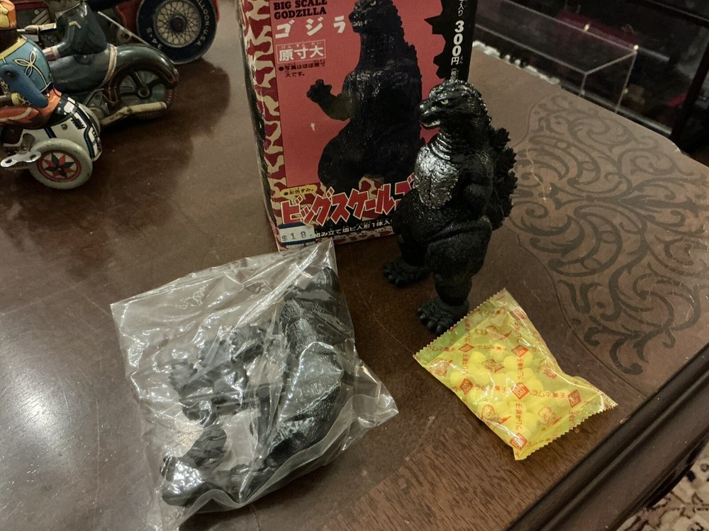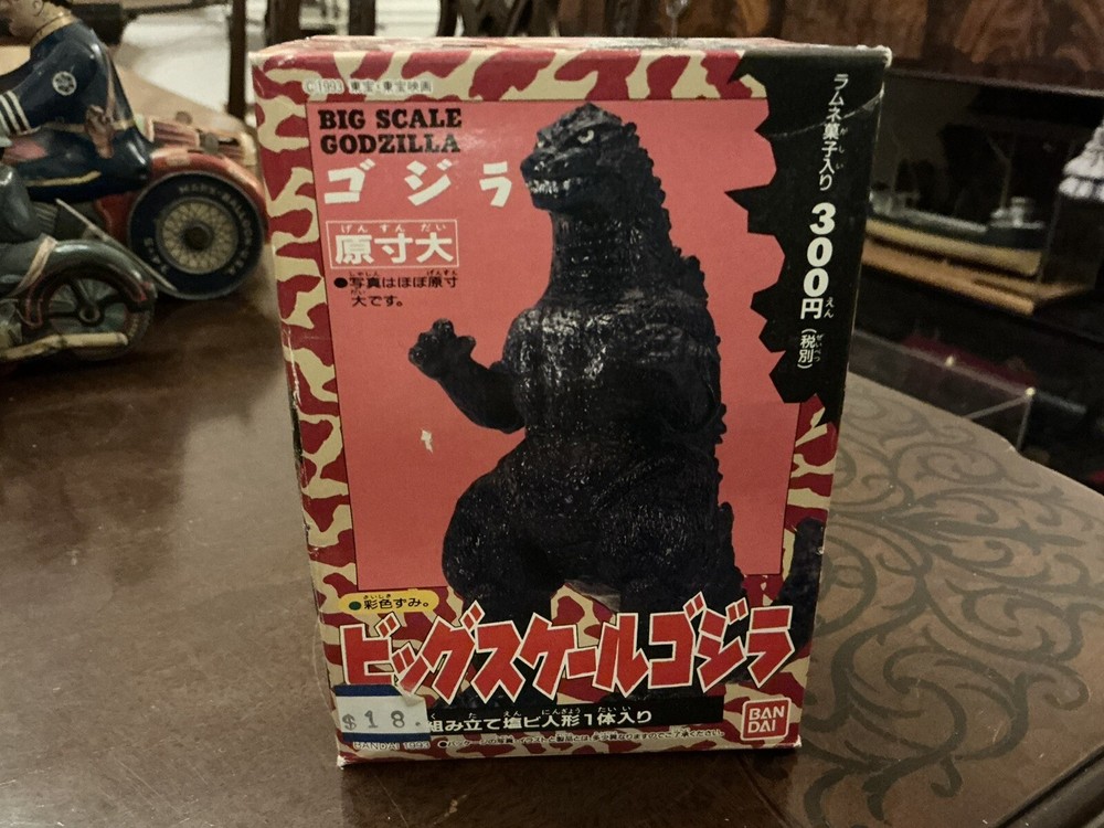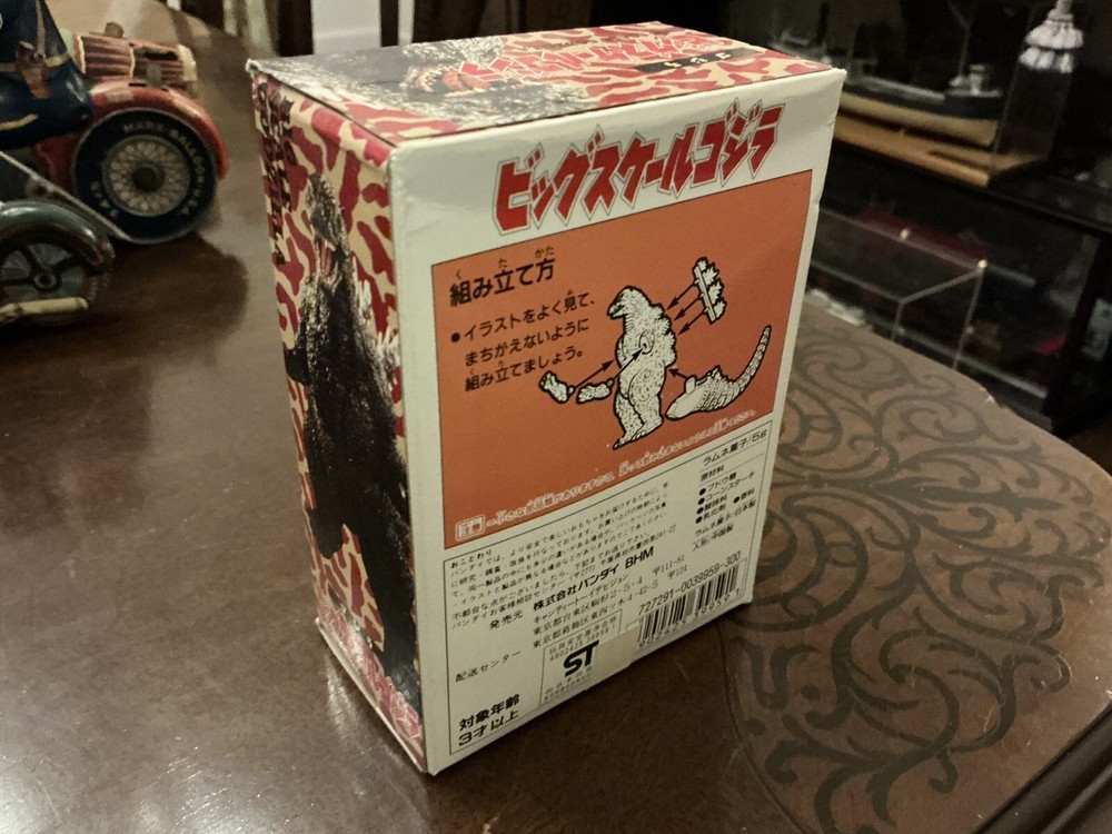 Bandai “Big Scale Godzilla” toy, new in box with unopened parts bag and candy packet. Dated 1993 Box was carefully opened at the bottom since the tape has dried out, but it is in excellent condition and without damage. The original tape flap could easily be re-affixed if desired. A cool original Godzilla collectible in mint condition! Please see my other listings, including other Japanese vintage toys and antique wind up tin toys!