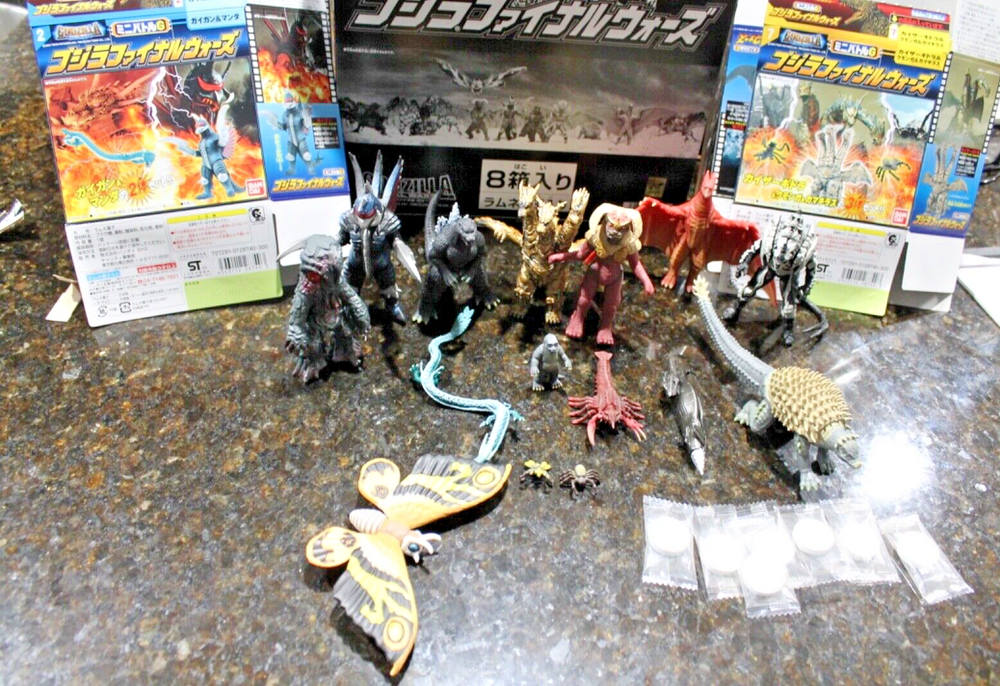 This auction is for 2004 Battle Complete Set of Mini-figures from the awesome 2004 Godzilla Final Wars movie. They come complete with Boxes and candy that came in the box(I would advise not eating it) as well as the master box. The biggest figures are round 4.5in high and the smallest around .5in. Includes: GODZILLA MANDA GIGAN KEISER GHIDORAH MINILLA KUMANGA KING CEASAR RODAN MONSTER X MORTHA EIBRAH KAMACARAS GARUDA HEDORAH AGRILLUS BUYER TO PAY $10.95 SHIPPING COMBINE AUCTIONS AND SAVE ON SHIPPING COST!