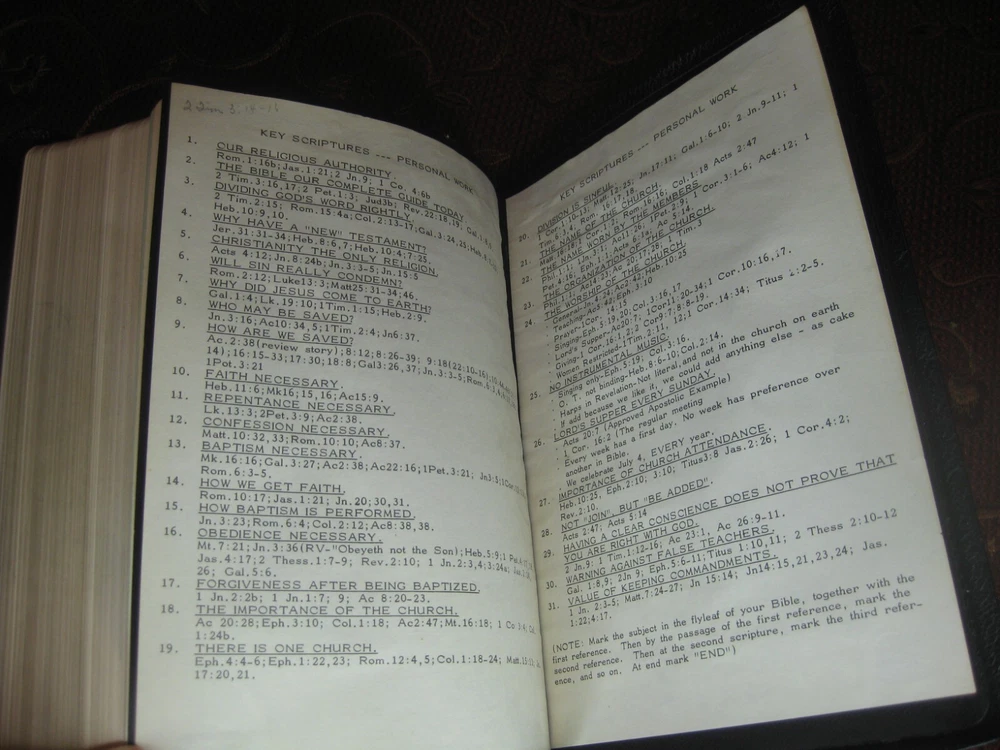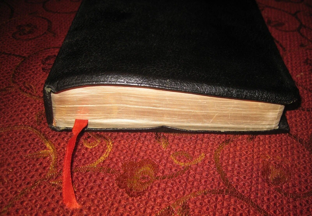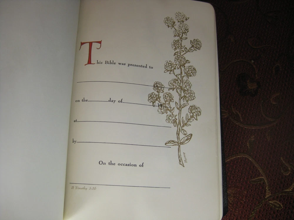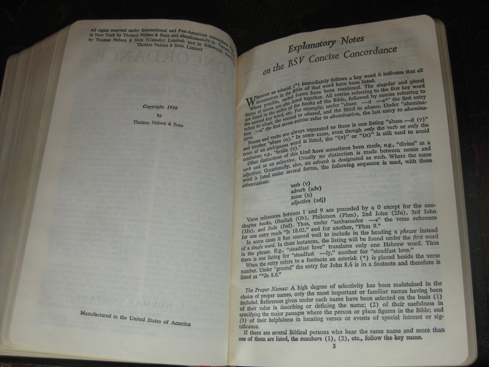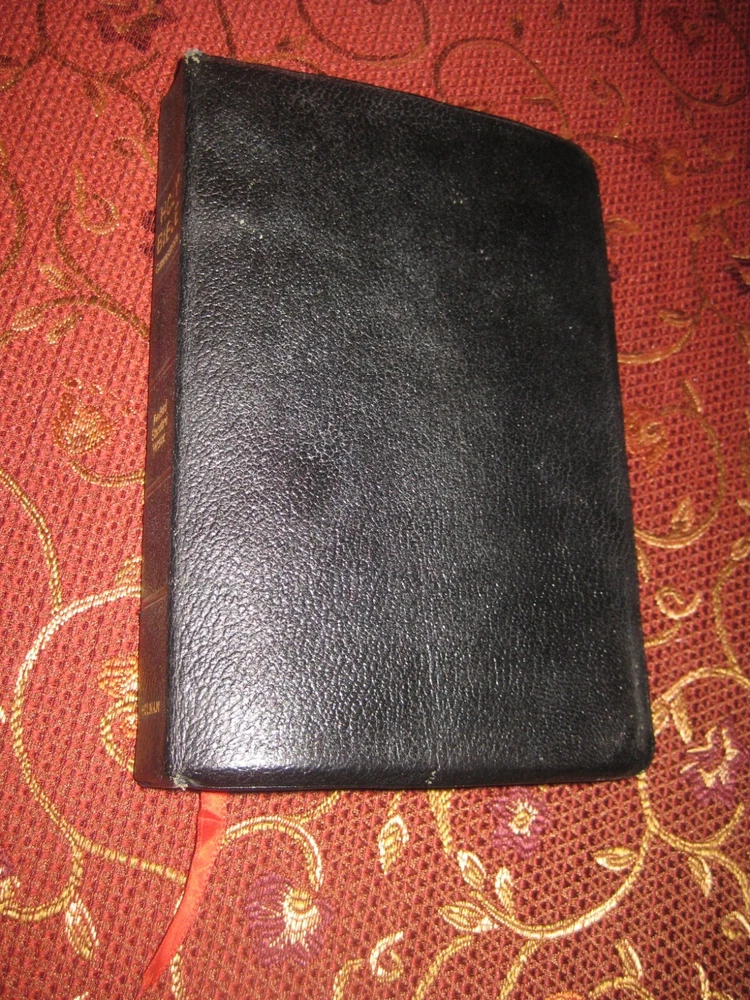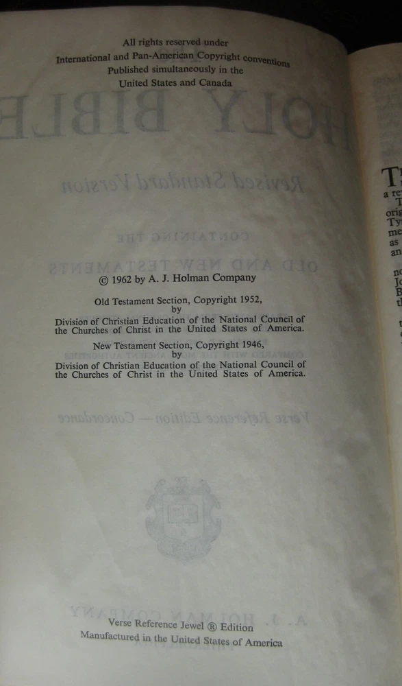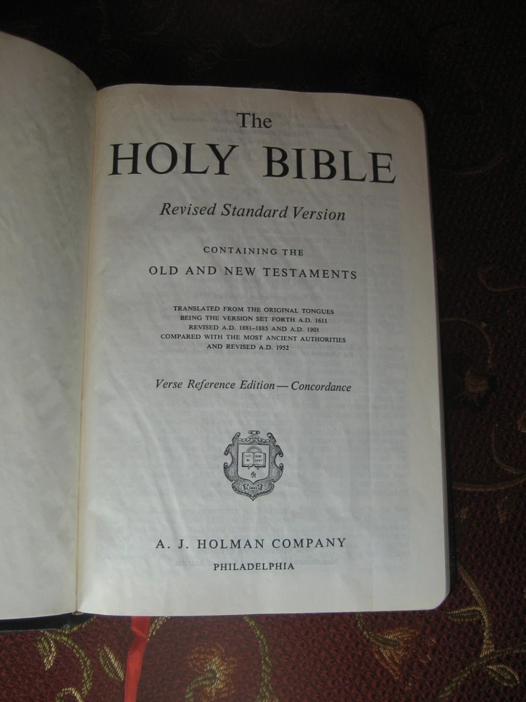 Being offered for your consideration is a Black - Genuine Leather copy of the "HOLY BIBLE - Revised Standard Version", Verse Reference Edition. Typed Key Scripture Notes tapes in the back. (photo 12) Red marks on (2) pages from the ribbon book mark. Light edge wear along the spine. No writing found. (Writing, highlighting and underlining are possible as this is a used item.) The pictures show the actual Bible that is being sold. Additional Information Published by Holman Copyright - 1962 Verse Reference Jewel Edition Pages - 1168 + Concordance Concordance One Red Ribbon Book Mark Gold Gilt Edge Paper (scuffs as pictured) 8-1/2 in. tall x 5-1/2 in. wide x 1-1/8 in. thick Smoke-free environment. Ships next business day Media Mail, Monday - Friday. Insurance available upon request for an additional charge. International shipping and paym ents are not available . Please e-mail any questions before bidding as this item is Not returnable. Once you receive an invoice from eBay, please post payment within (2) days or item is subject to being relisted. Thank you and we look forward to doing business with you.