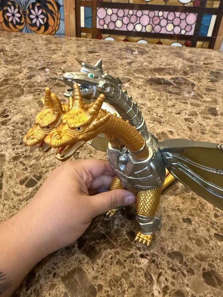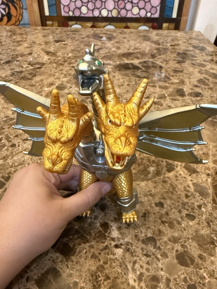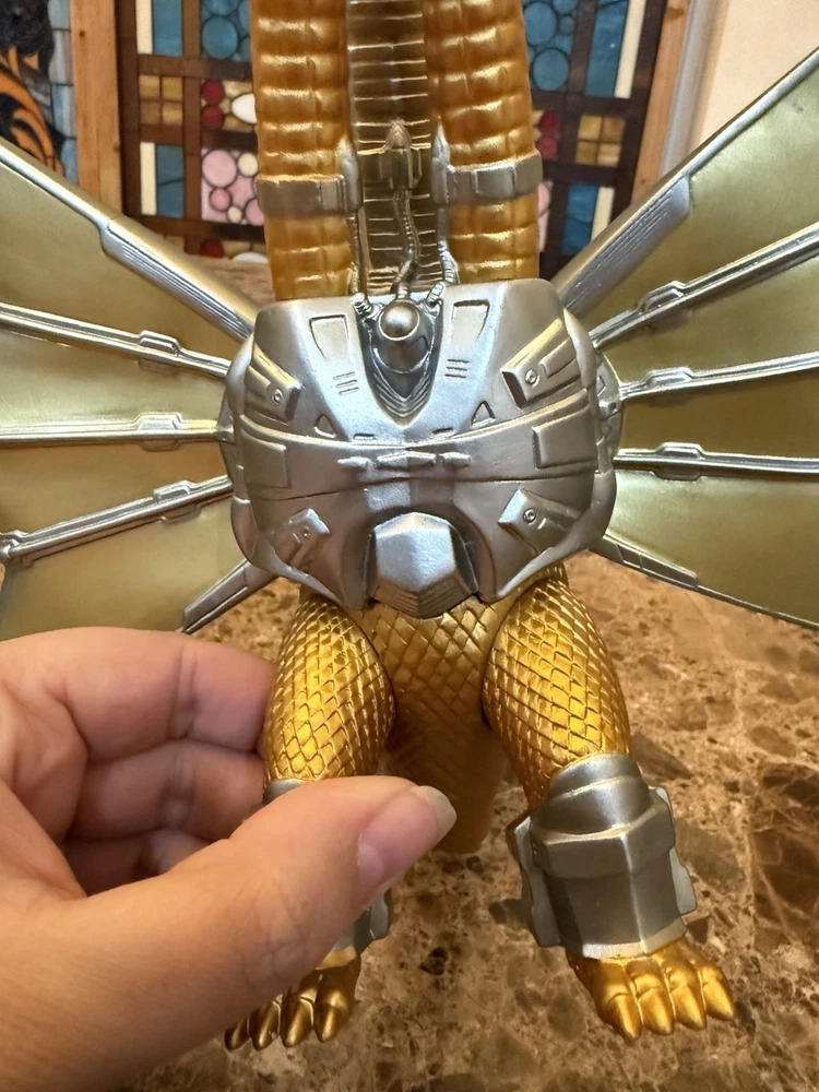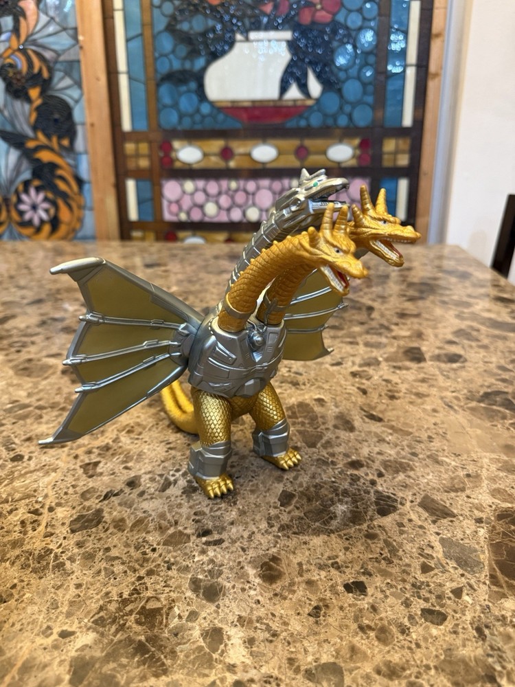 📌 ITEM DESCRIPTION: Dominate the kaiju battlefield with this Mecha-King Ghidorah action figure by Bandai! Standing 8 inches tall, this detailed vinyl figure features the iconic three-headed dragon from Godzilla vs. King Ghidorah—fully armored with silver cybernetic plating, metallic wings, and mechanical chest harness. A classic addition to any Toho monster collection, this figure blends mechanical menace with King Ghidorah’s timeless design. Features: Three-headed Mecha-Ghidorah sculpt Metallic silver armor and cybernetic detailing Poseable heads and wings Sturdy vinyl construction Collector-grade vintage kaiju figure Official Bandai Toho release Rare figure, no longer in production Perfect for Godzilla displays or collectors 🧾 CONDITION NOTE: Figure is in excellent pre-owned condition with no packaging. Displays well with minimal wear. From a smoke-free home. See all photos for detailed condition and angles.