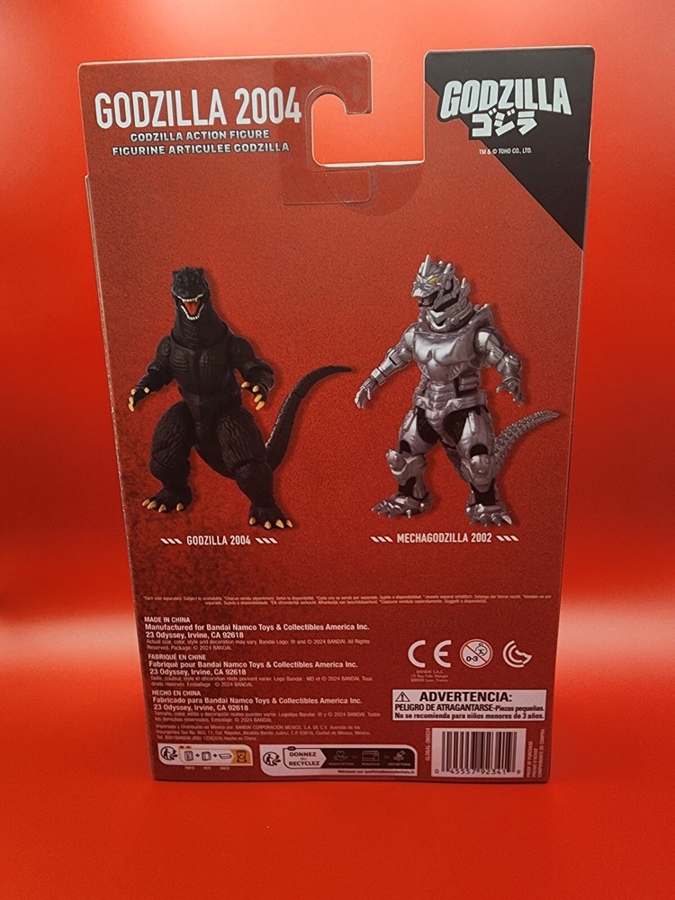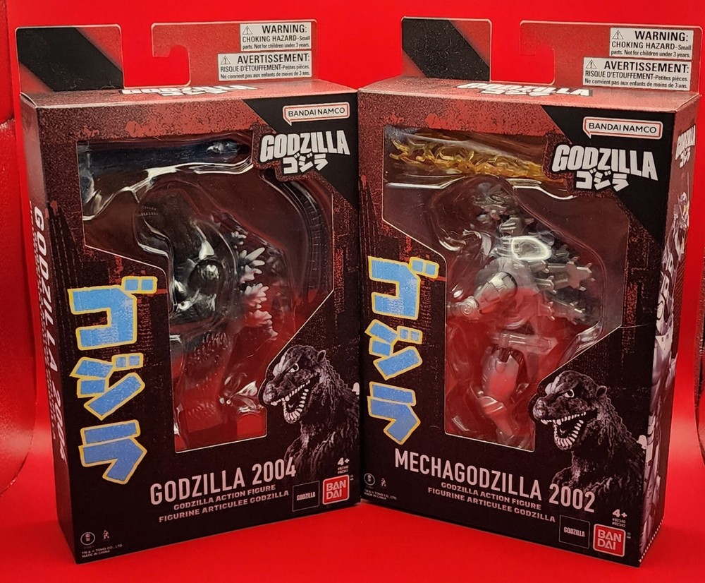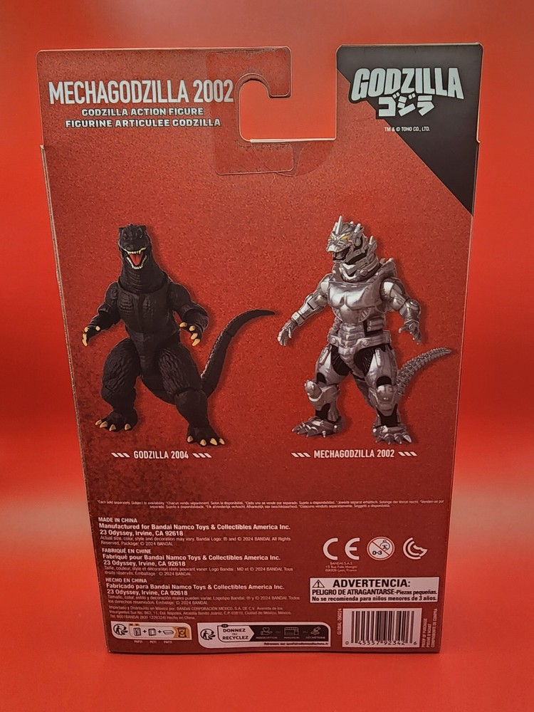 The Bandai Godzilla 2004 & Mechagodzilla 2002 6 Inch Action Figure set includes Godzilla and MechaGodzilla characters from the movie "Godzilla: Final Wars." Made of vinyl and PVC, these licensed reproduction figures feature jaw replacement accessories and articulation. Part of the Godzilla franchise, the action figures are part of the 3rd wave collection with a 6-inch height. Produced in 2024, the set is suitable for ages 4 and up, showcasing detailed craftsmanship and design inspired by the iconic monsters.