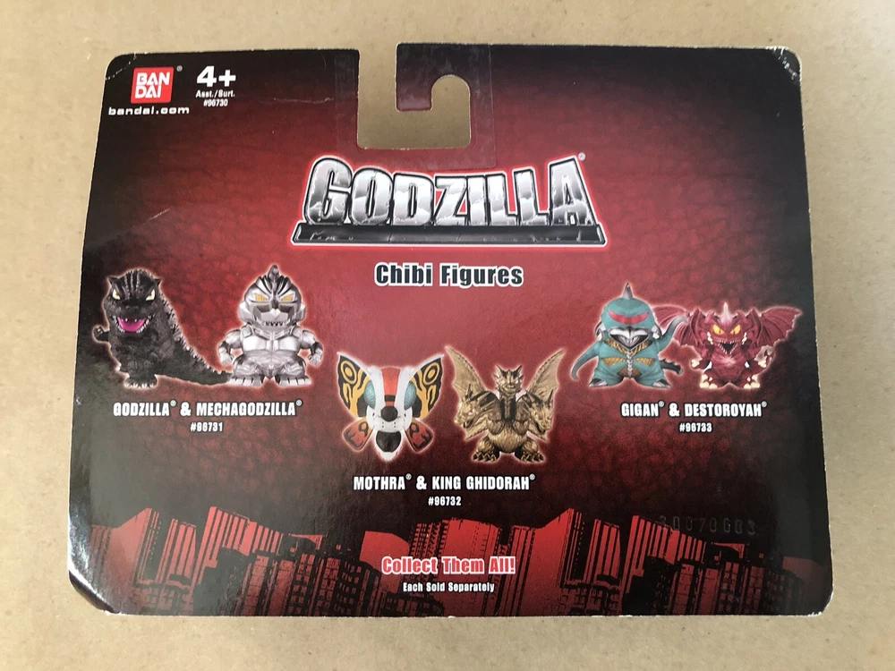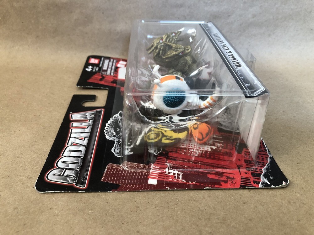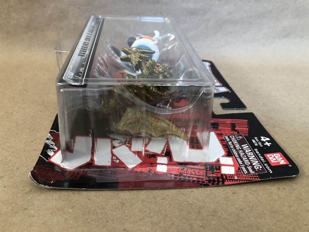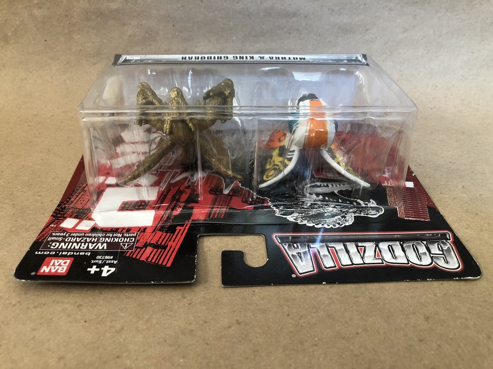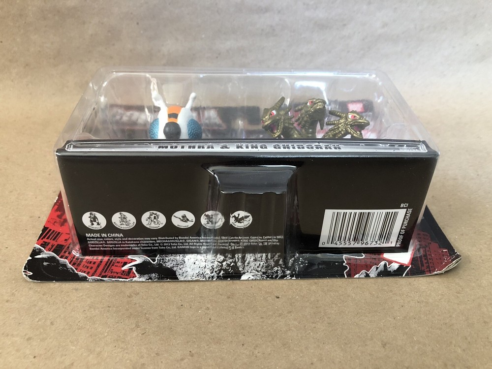 This Bandai America mini figure 2-pack features the iconic Godzilla and his rival King Ghidorah, as well as the legendary Mothra. Both figures are expertly crafted with fine attention to detail and are perfect for collectors and fans alike. The figures come new in their original packaging, making them a great addition to any toy collection. This item is brand new, unopened, and ready to ship. Please see the attached pics for the condition of the item. The bubble has pulled away slightly from the card on the top middle of the figure. I ship within 24 hours of receiving payment. Thanks for looking!
