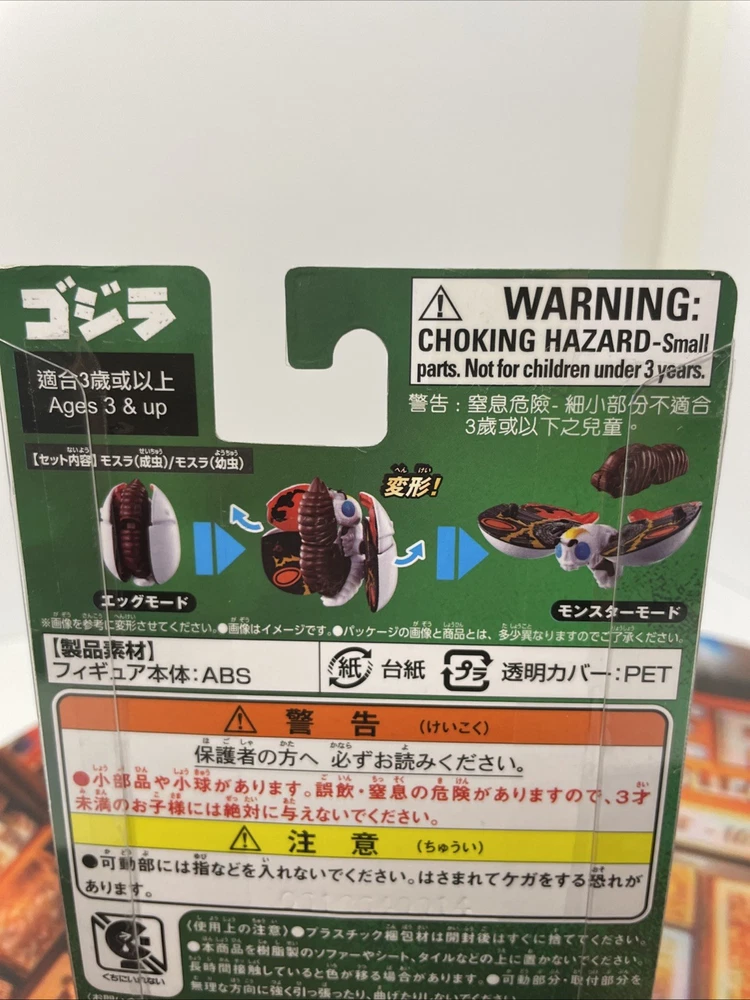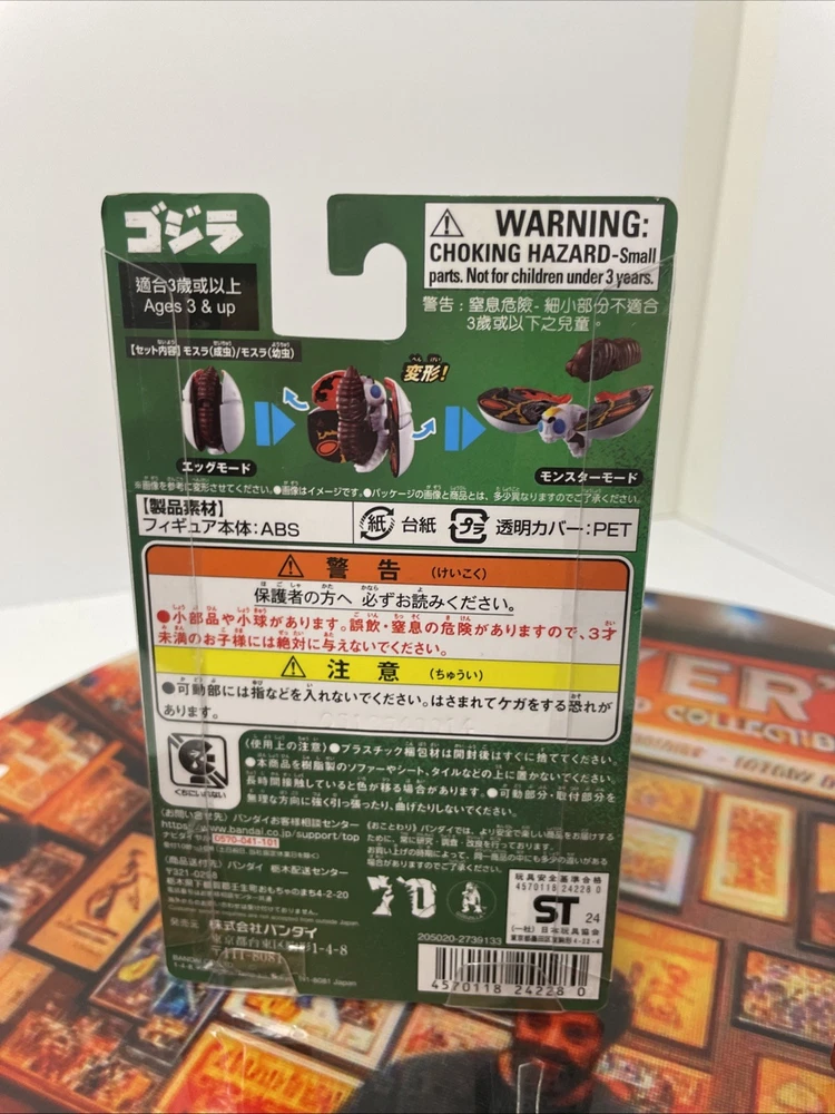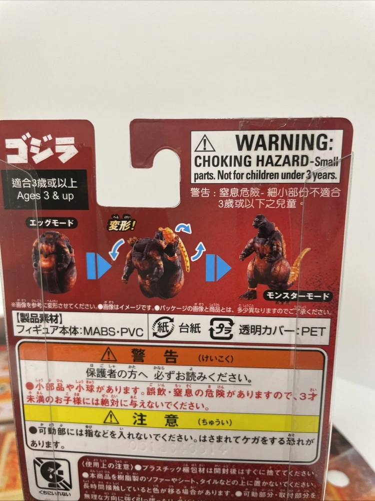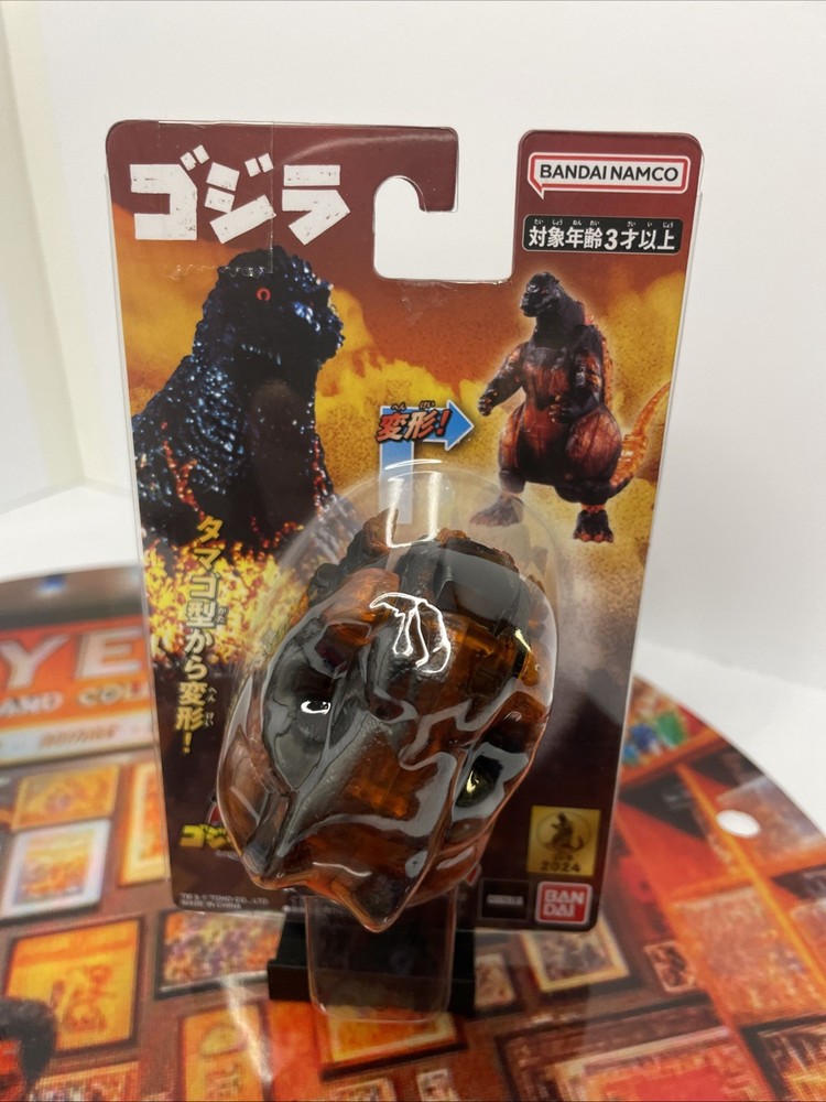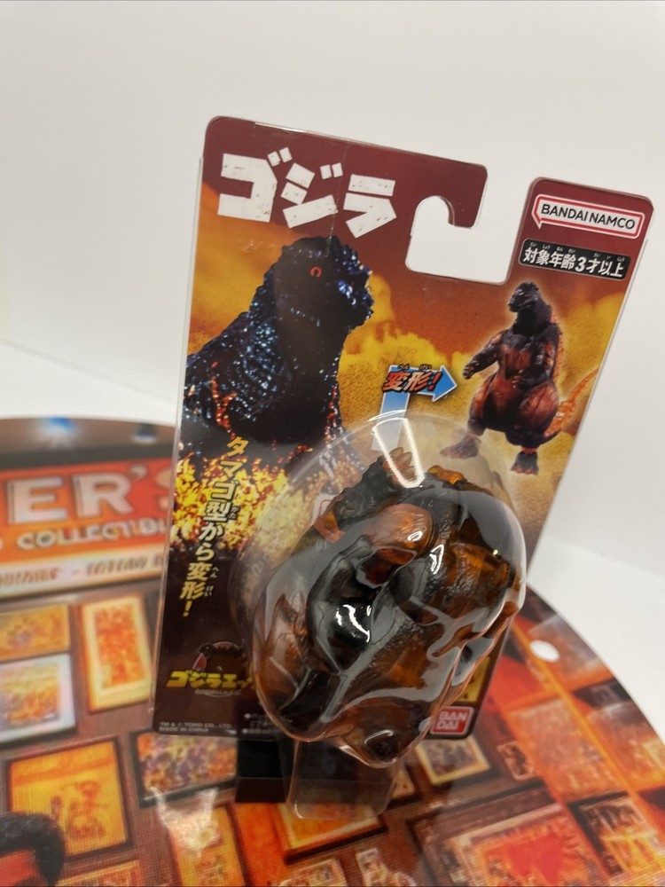 Bandai Godzilla Transforming Egg figures from the 2024 series. These figures, when in their egg form, are designed to transform into the characters Burning Godzilla and Mothra. Each figure is packaged individually, displaying both the egg form and the transformed character on the packaging. The packaging also includes the Bandai Namco logo, the Godzilla logo, and the age recommendation of 3 years and up. Burning Godzilla: The egg is primarily black and orange, representing Burning Godzilla's fiery appearance. The packaging shows the egg transforming into Burning Godzilla, with his characteristic red and orange highlights. Mothra: The egg is white with brown and yellow accents, representing Mothra's colors. The packaging illustrates the egg transforming into both Mothra's adult and larval forms. These figures are part of the "Egg Monsters Godzilla" line, where the gimmick is the ability to transform between an egg shape and a monster form. When transformed, the figures stand approximately 4.5 inches tall. This is a Bandai Godzilla Transforming Egg figure set that includes Fire Godzilla and Mothra. The figures are made in Japan and are recommended for children aged 6 and above. The set features a unique design and is part of the Godzilla theme. The figures can be transformed into different shapes and are perfect for collectors and fans of the franchise.