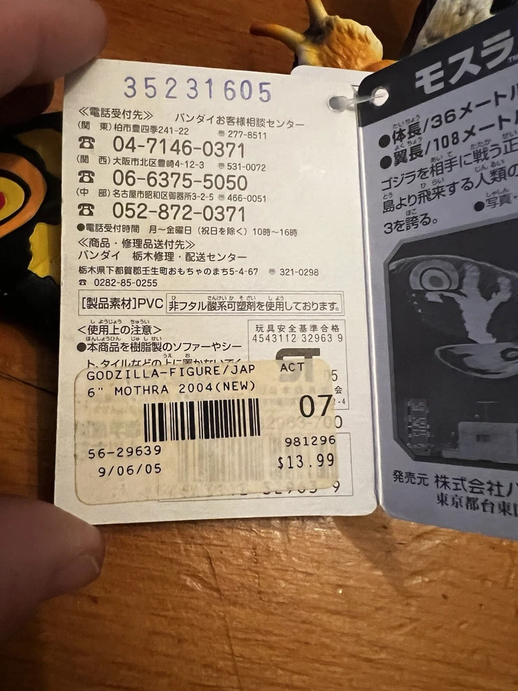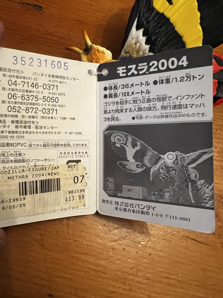 Mint - unused Mothra figure 2005 Toho - Bandai 9.5” New with tags. Great for a collector or collection. Lot CC Please let me know if you have any questions Capitol Salvage - Facebook and Instagram