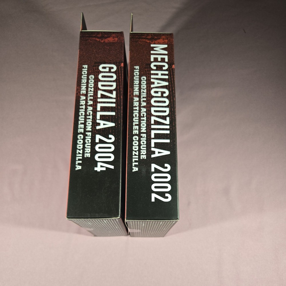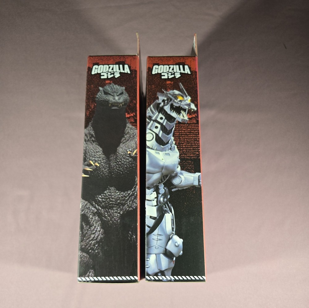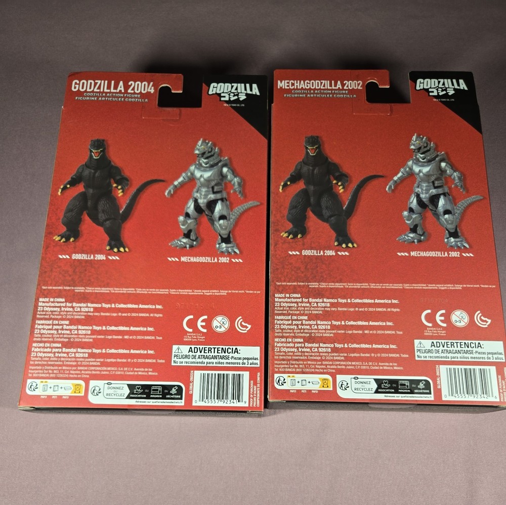 The Bandai Namco SET OF 2 Godzilla 2002 & 2024 6" Action Figure LOT includes two brand new sealed action figures of Godzilla from the movies "Godzilla Minus One" and "2024 Godzilla". These green figures come with a fire blast accessory and are made of plastic, standing at 6 inches tall. The figures are part of the Godzilla franchise and are licensed by Bandai. This collectible set is perfect for fans of the TV, movie, and video game series, and each figure is boxed for display.