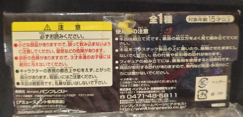 Title Banpresto UFO Catcher DX Godzilla/Prototype Soft Vinyl Figure New Century version Brand Banpresto Series Ufo Catcher DX Item Name Godzilla Item Condition You will receive the item in an unopened Package damaged /as shown in the image. SKU nytJ6771-00LH1KEQ Size Approx 14.96 x 11.02 x 4.33in (380 x 280 x 110mm) Weight Approx 21.16oz (1.323lb 600g) Import duties, taxes, and charges are not included in the item price or shipping charges. These are the responsibility of the buyer and are usually charged when the item is delivered if applicable. Please check with the customs office in your country for information about possible costs and charges. If you are eligible for free shipping, please note that taxes are not included (please do not confuse this with the domestic sales tax that eBay may charge). Please be sure to read all contents before purchasing. By placing an order with us you agree that you have read, understood, and agree everything below. While we aim to respond to inquiries within 1 to 3 working days, please be aware that there are times it may take longer. As our automated shipping process starts immediately once an order is paid for, this means that cancellation and other such requests may not be possible. Please do not place an order unless you are happy with the item. Everything that is included with this item is shown as shown in the pictures and described (as we may have more than one of this item in stock, the item shown in the pictures may not be the exact item shipped). If this item originally came with anything that is not shown in the pictures (cases, bonuses etc), then they are not included with in this listing . Please keep in mind that altho very rare, due to a data transfer delay between eBay and our warehouse, some items should have been removed from Mandarake's eBay listing. There will be times when we have to cancel an order due to this data transfer delay. Mandarake is now on eBay! Now you can find our wonderful selection of books, toys and figures from anime, manga, games, cards, cosplay goods, j-pop goods and other Japanese popular culture and more right here! We also have our fantastic dolls and old-school toys too. All of our items are shipped straight from our store in Tokyo, Japan to your door! Check out our other eBay listings here! General Conditions Since all of our items are second hand, they may have slight signs of damage, such as minor scratches. If the item has noteworthy damage it will be mentioned above. Please note that items with clear cases are likely to have discoloration that is not clear in the pictures. Everything that is included with this item is shown as shown in the pictures and described (as we may have more than one of this item in stock, the item shown in the pictures may not be the exact item shipped). If the item originally came with anything that is not shown in the pictures (cases, bonuses etc), then they are not included with in this listing . Please note that some product boxes may show other items from the same series, but they are not included unless otherwise noted. Condition Rating Details: 10-point Scale (10) Mint / Like New (9) Excellent to Near Mint / Very good condition for a used item (8) Great / Relatively good condition for a used item (7) Good / Average condition for a used item, with some minor damage (6-5) Average / Decent. Contains damage from external factors like fading, yellowing, stains, wear. (4-3) Fair/ Acceptable. Noticeable damage, including, tears, missing or damaged parts, discoloration, and wear. Suitable for enjoying as an item but not for collection. Some integral extras may be missing. (2-1) Mediocre / Poor. Not for collectors, As is. The severity of damage decreases as the score decreases, which is reflected in the price. Evaluation criteria may vary depending on the publication date, book binding, and characteristics. Actual product condition may differ slightly from the images. Regarding first editions, reprints, and the presence of dust jackets, this information is stated in the title or product description. If not specified, these details cannot be selected. Please refer to the product details section for information on included accessories. Please Keep the following in mind Items are not hand-signed unless specifically mentioned. Items that are 'Motor Powered' may not include a motor. Items that are noted as unopened/resealed have not had their condition checked beyond what we can see from outside as we cannot open the package. The size displayed on the listing includes the package of the item and is not the dimension for the item itself. If the item is inside a plastic bag, the dimensions displayed on the listing are the dimensions of the bag flattened out. Unopened items are sold as is, and cannot be returned as faulty if you open the package (you will need to contact the manufacturer for assistance). We cannot be held responsible if an unopened item is opened by your local customs office. Unopened items, especially old electronics, may no longer be working and are sold as not working. Some items, such as books, may be shown in the pictures as wrapped. This is to protect them while they are in the store, they are not brand new unless specifically mentioned. Please assume all items are in Japanese if not specifically stated as so. This includes Books, DVDs, and any other item that may be Language dependent. Conditions (More Information) Sometimes items have single word descriptions for their conditions. Please use the following guide for more information on item conditions. Unopened / Not Opened - The item is still sealed, the contents are unused. Please note that we have not checked the condition beyond what we can see from outside as we cannot open the package. Unopened items are sold as is, and cannot be returned if they are faulty if you open the package. We cannot be held responsible if an unopened item is opened by your local customs office. Box Resealed - The item has been ope