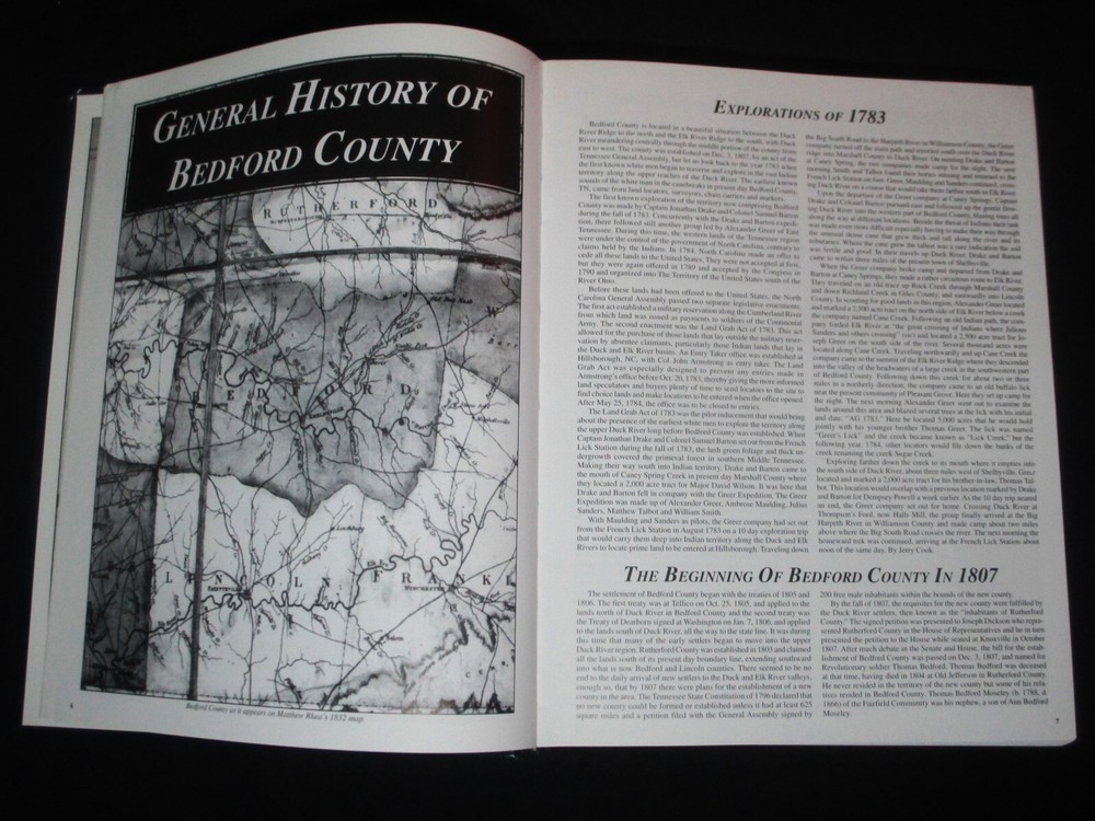 Bedford County Tennessee Family History Book Dick Poplin Editor 2002 Bedford County Historical Society Turner Publishing 552 page illustrated hardcover Dark Blue Leather with gilt graphics – black and white photos – illustrated endpapers __________________________________________ Table of contents Publishers Message Acknowledgement Bedford County Historical Society General History Bedford County Bedford County Communities Bedford County Schools Bedford County Churches Bedford County Businesses Bedford County Families Bedford County Family Album Index