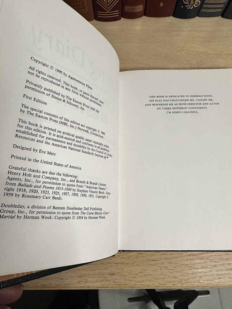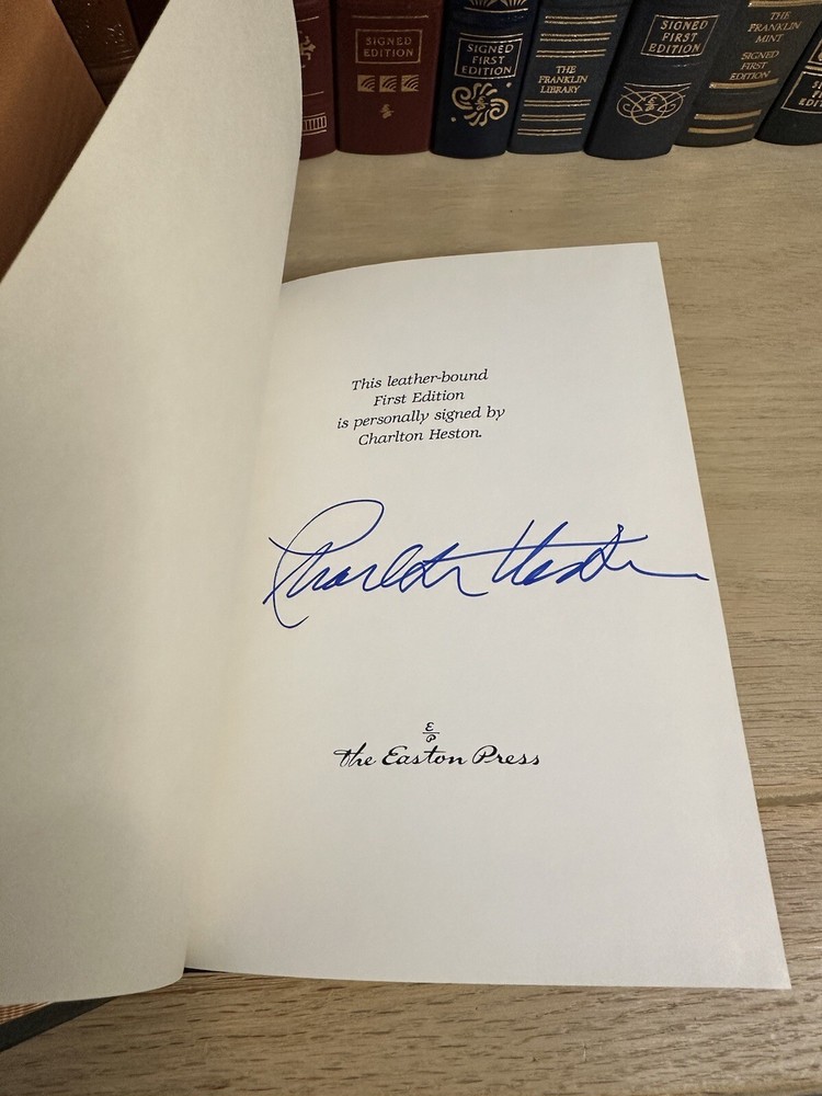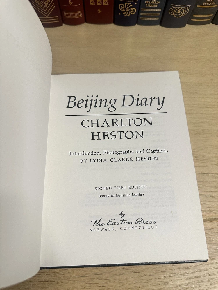 Thank you for checking out my listing! This is a rare opportunity to own a vintage signed first edition copy of "Beijing Diary" by Charlton Heston (October 4, 1923 - April 5, 2008). Published by Easton Press in 1990, the book explores Heston’s cultural exchange experiences in Beijing and is in excellent condition. Easton Press books are known for their high-quality, signed collectible editions, and this book is no exception. Modified to enhance its value and appeal, it is a one-of-a-kind item. These originally signed, limited edition books are a great investment and will increase in value for years to come. Do not miss out on this amazing opportunity! Easton Press books are known for: • Premium leather • Silk Moire end leaves • Distinctive cover design • Hubbed spine • 22KT gold accents • Satin ribbon page marker • Gilded page edges • Long-lasting, high quality acid-neutral paper • Smyth-sewn pages for strength and durability Note - This is a 35 year old book that is in excellent condition. Expedited shipping available. Please feel free to reach out with any questions! I have hundreds of Franklin Library and Easton Press books for sale, so do not hesitate to ask if you are searching for any specific title.
