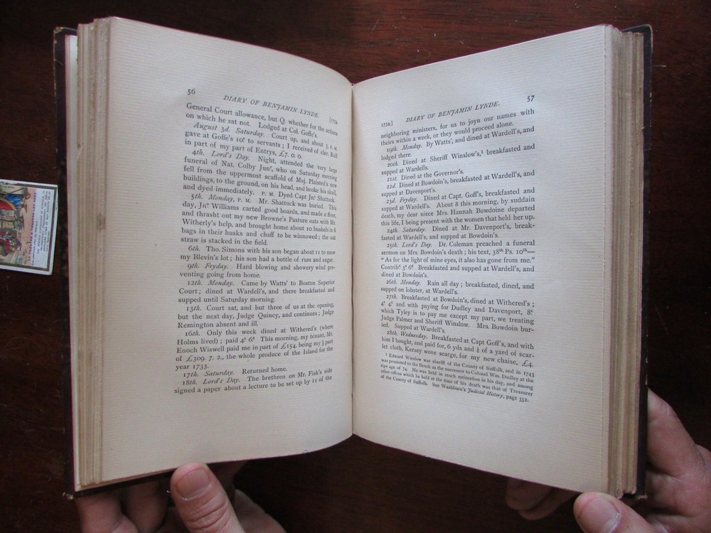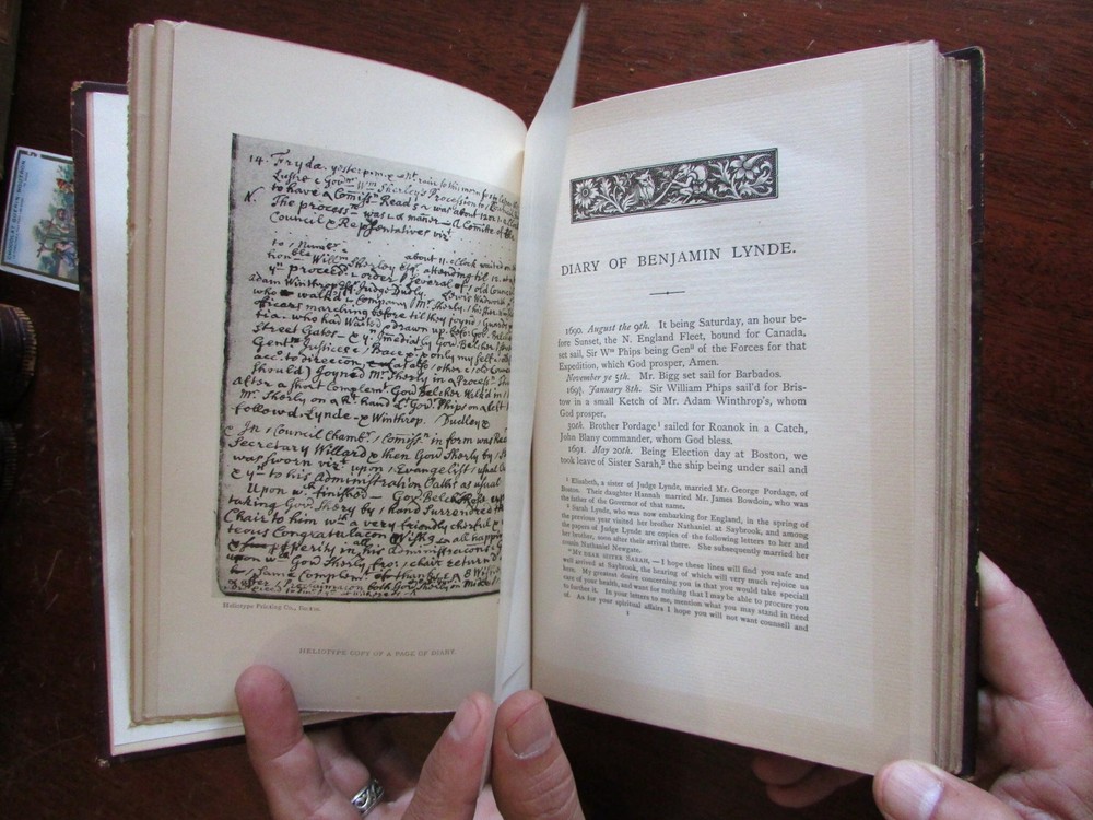 Benjamin Lynde Diaries 1880 rare leather book privately published Mass. Bay Colo Benjamin Lynde Diaries 1880 rare leather book privately published Mass. Bay Colo Click here to view a short video presentation. Short video captures condition much better than words. Please watch prior to purchase to ensure a clear understanding of the book. The Diaries of Benjamin Lynde and of Benjamin Lynde, Jr. With an Appendix. Published 1880, Boston. Privately printed. 251 pages. Period half leather binding. Raised bands, spine gilt decorated and lettered,. marbled covers and end papers, top edge gilt. Joints and corner extremities scuffed. Binding remains tight and sound. Lovely antiquarian book, tight and sound, any age flaws to binding easy to forgive or overlook. The collected and published diaries of Benjamin Lynde and his son. The Lynde family were prominent jurists in pre-Revolutionary New England. Both Benjamin and his son served as Chief Justice of the Massachusetts Supreme Court. A fascinating look into daily life of colonial New England. Book measures: 9" H X 6 1/4" W. [V1831].