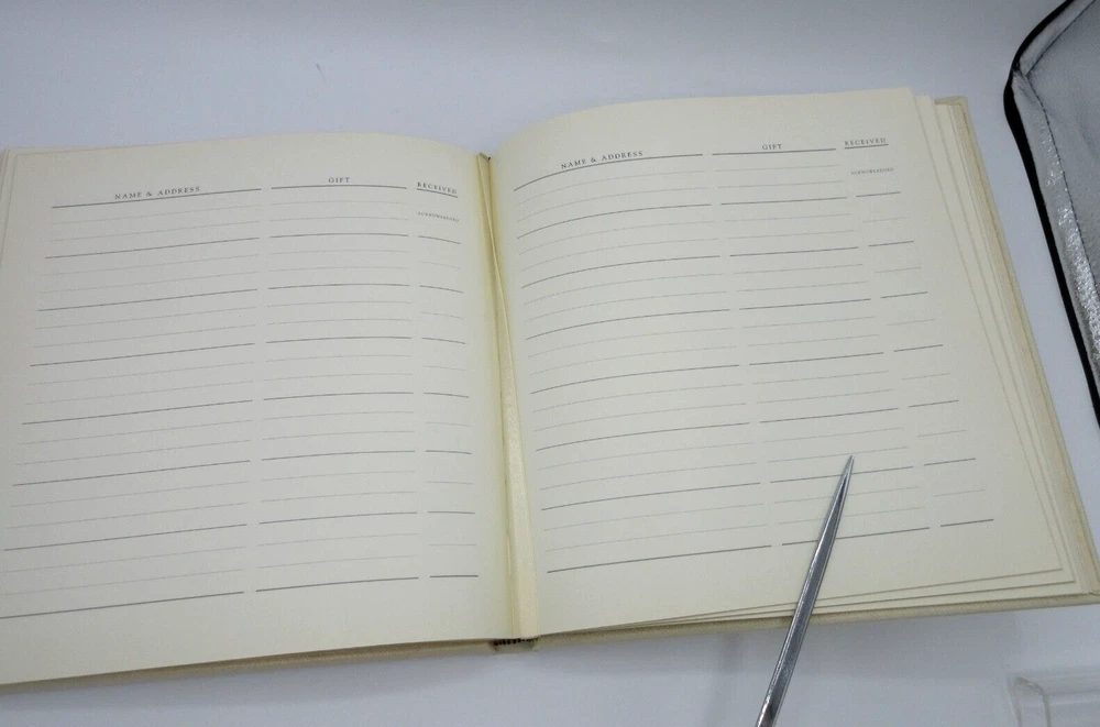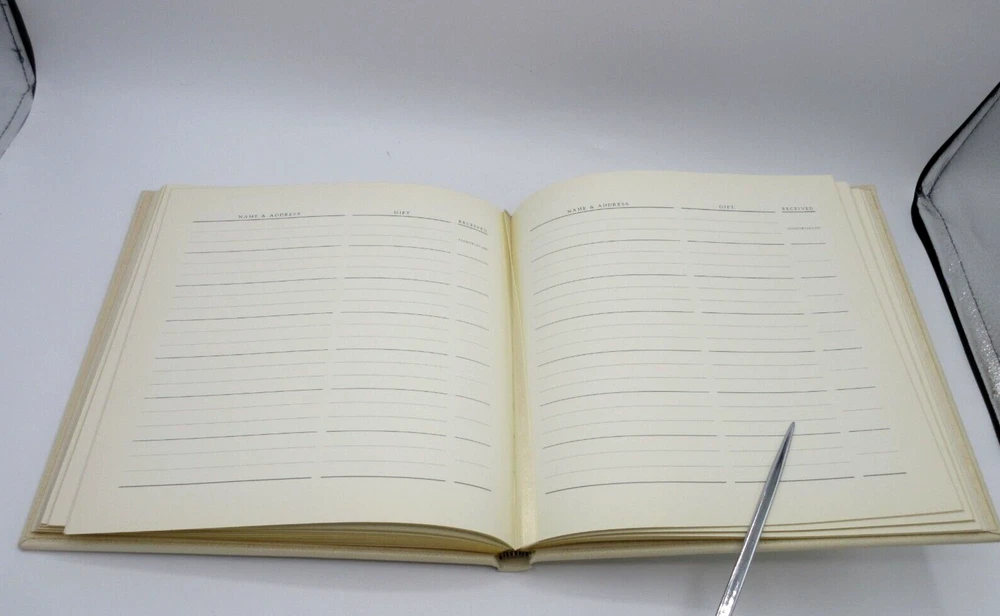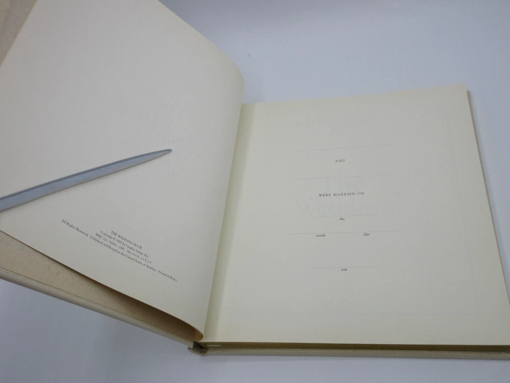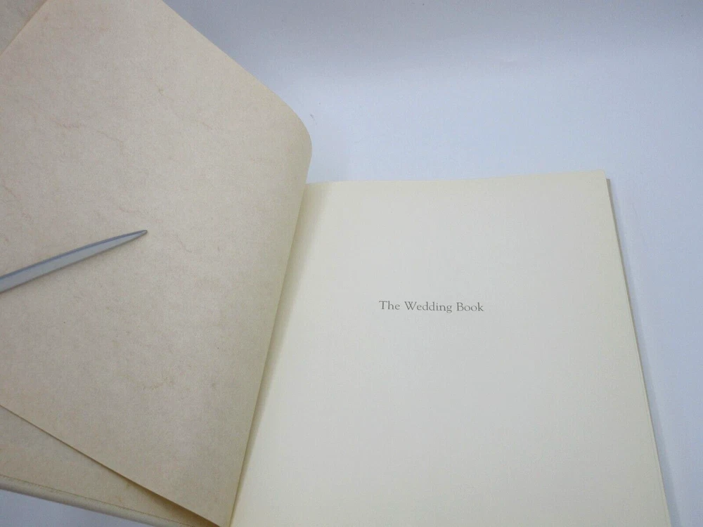 A unique wedding journal that goes from engagement to ceremony. This wedding journal is a combination guest book, gift register and ceremony record. An elegant way to document the essential details of this important occasion. Makes a lovely engagement or bridal gift. Size: 8-5/8" x 8-3/4" Hardcover, 160 lined pages with gilt edges Retails in fine stores for $135 Some scuffs from shelf wear Old inventory