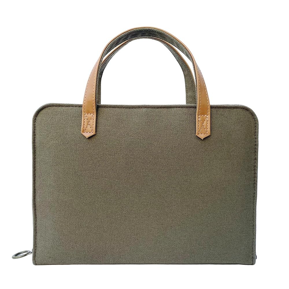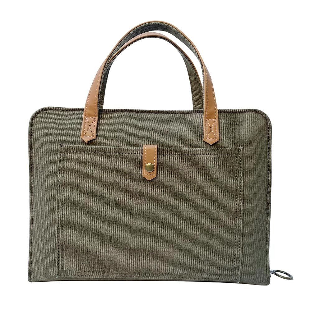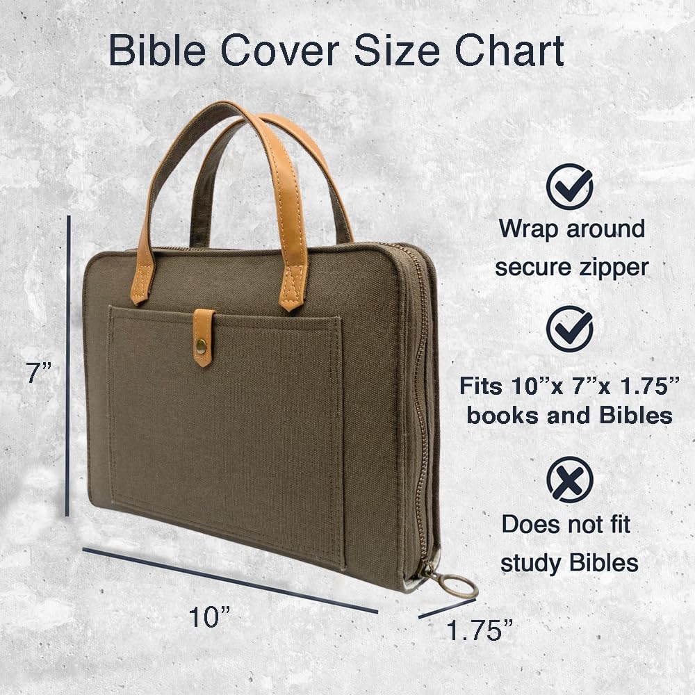 Our beloved covers protect your Bible with simplicity and style. This canvas minimalist shape fits large Bibles and features a short strap so you can carry your Bible as a purse. The Bible bag features a two-tone style with an off-white canvas cover and faux leather handles. The front-snap pocket is perfect for your or keys. With two interior pockets, the carrying case can also organize Bible study accessories. Use as a journal cover, book/textbook holder, purse, handbag, organizer, iPad carrier/case, or small Macbook laptop case. {Medium Size} 10.5 x 8 x 2 inches Note: max Bible size in order for cover to zip. {Max Bible Size} 10 X 7 X 1.75 inches. {Zippered Closure} Full zip closure with a metal pull ring. {Stylish Design} Purse style design with a front snap button pocket and two interior pencil/pockets. Soft-bound canvas material with faux leather handles. {Multi-Functional} This large bible carrying case can be used as a handbag, briefcase, bible tote bag, book cover, tablet case, Bible study bookbag, etc. Visit Storefront for more styles and size guides.