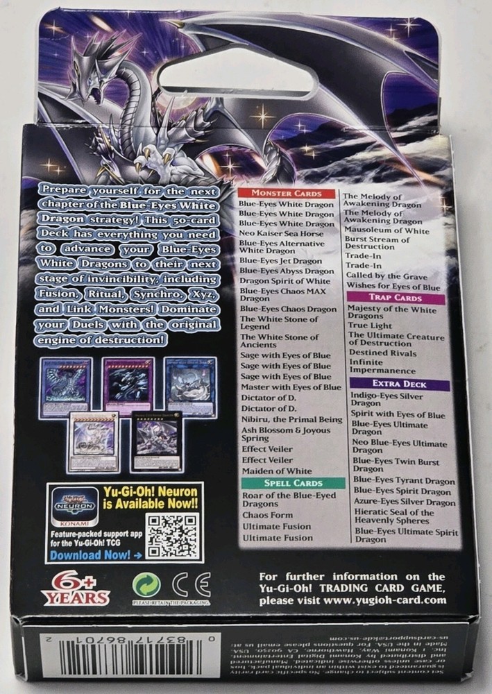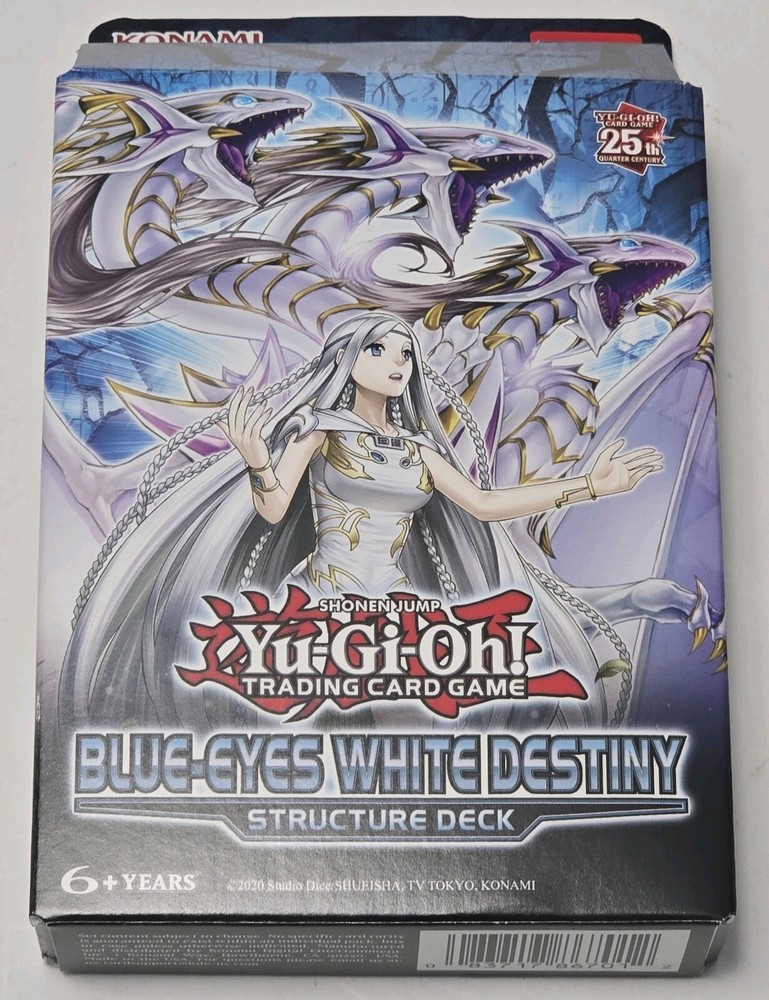 Product Details: Each structure includes a sealed deck of 50 cards. NO PROMO INCLUDED. The box has been opened, but the deck is sealed. Smoke Free Storage Shipping same or next day List of cards included: - 3 Blue-Eyes White Dragon - 1 Neo Kaiser Sea Horse - 1 Blue-Eyes Alternative White Dragon - 1 Blue-Eyes Jet Dragon - 1 Blue-Eyes Abyss Dragon - 1 Dragon Spirit of White - 1 Blue-Eyes Chaos MAX Dragon - 1 Blue-Eyes Chaos Dragon - 1 The White Stone of Legend - 1 The White Stone of Ancients - 3 Sage with Eyes of Blue - 1 Master with Eyes of Blue - 2 Dictator of D. - 1 Nibiru, the Primal Being - 1 Ash Blossom & Joyous Spring - 2 Effect Veiler - 1 Roar of the Blue-Eyed Dragons - 1 Chaos Form - 2 Ultimate Fusion - 2 The Melody of Awakening Dragon - 1 Mausoleum of White - 1 Burst Stream of Destruction - 2 Trade-In - 1 Called by the Grave - 1 Majesty of the White Dragons - 1 True Light - 1 The Ultimate Creature of Destruction - 1 Destined Rivals - 1 Infinite Impermanence - 1 Indigo-Eyes Silver Dragon - 1 Spirit with Eyes of Blue - 1 Blue-Eyes Ultimate Dragon - 1 Neo Blue-Eyes Ultimate Dragon - 1 Blue-Eyes Twin Burst Dragon - 1 Blue-Eyes Tyrant Dragon - 1 Blue-Eyes Spirit Dragon - 1 Azure-Eyes Silver Dragon - 1 Hieratic Seal of the Heavenly Spheres - 1 Maiden of White - 1 Wishes for Eyes of Blue - 1 Blue-Eyes Ultimate Spirit Dragon Thank you for supporting a small woman owned business here in the USA.