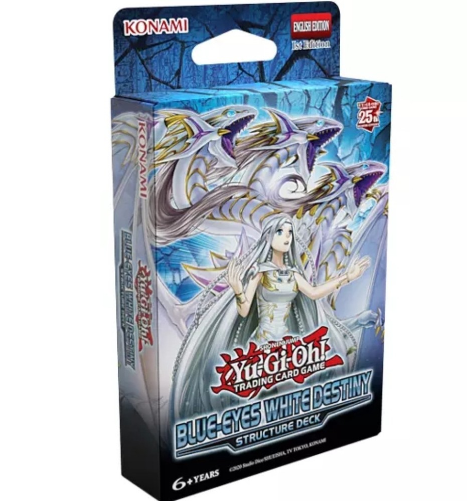 The Blue Eyes White Destiny Structure Deck is a 50-card Yu-Gi-Oh! TCG deck focused on the Blue Eyes archetype, featuring Seto Kaiba's character from the Kaiba set. Manufactured by Konami in Japan, this deck includes a mix of effect cards in English language. It is designed for players aged 6 and up, with standard-sized cards made of paperboard material. This structure deck offers a pre-built collection for fans of the game looking to enhance their gameplay experience with the iconic Blue Eyes cards.