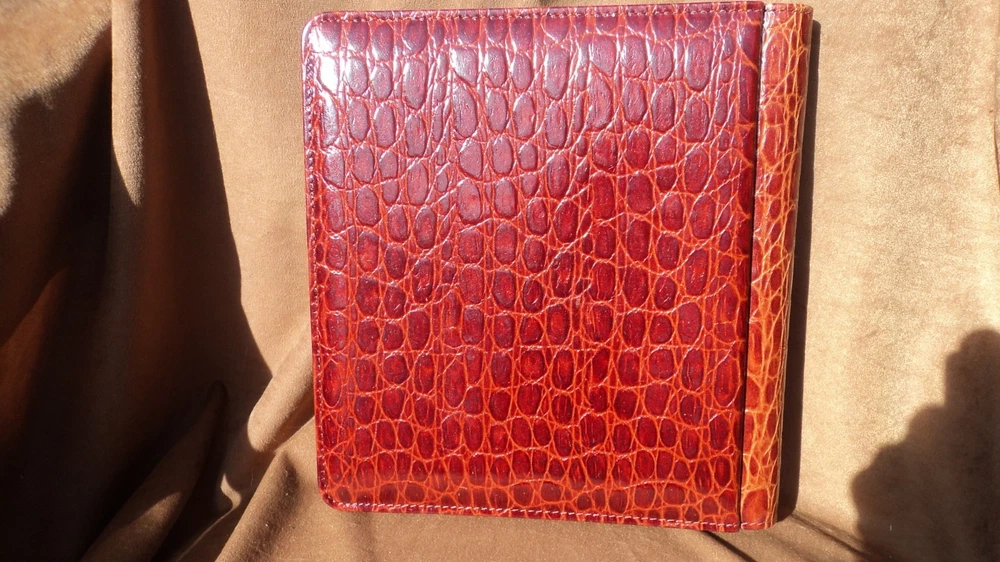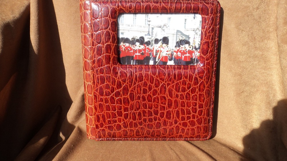 Here is a quality photo album made from a durable Alligator patterned leather. The rich leather and classic design make this one of our best photo holders ever. This picture album will hold 60 4 x 6 photos. Single picture front, a different looking album. Blvd is one of our favorite brands. Everyone is looking for something different, and we are the site with the most quality albums anywhere. This is leather, it might have a scratch or range mark in the leather. Size 9" x 9" x 1.25" Retail price 90.00