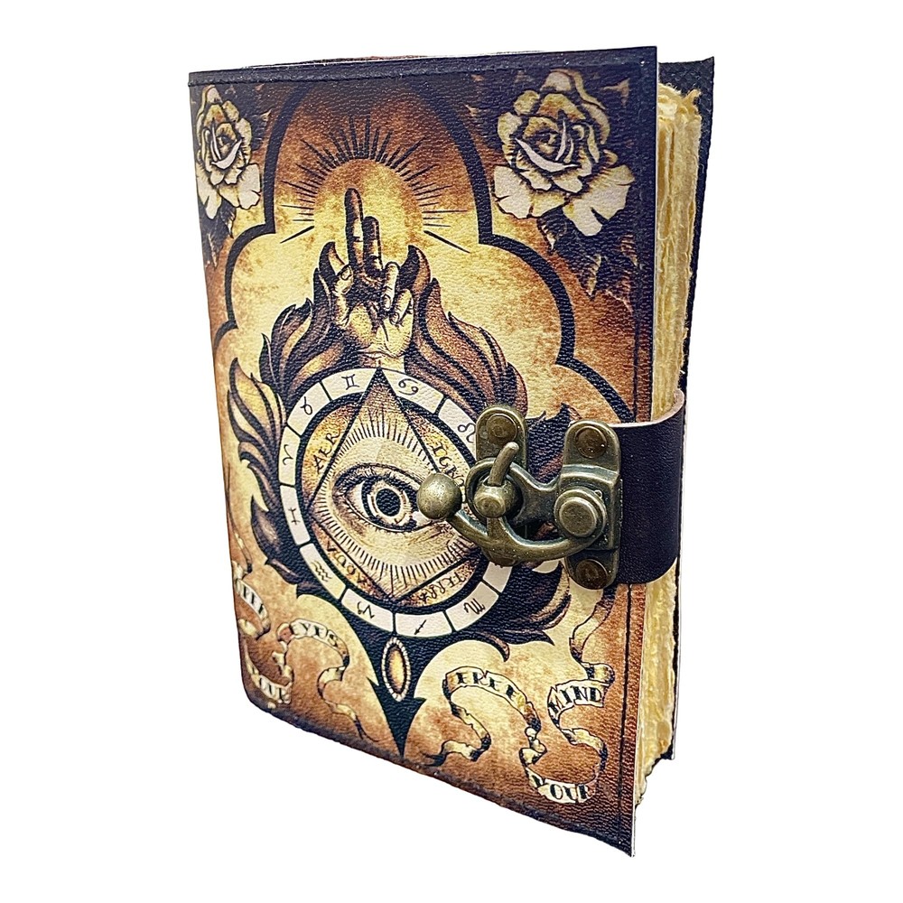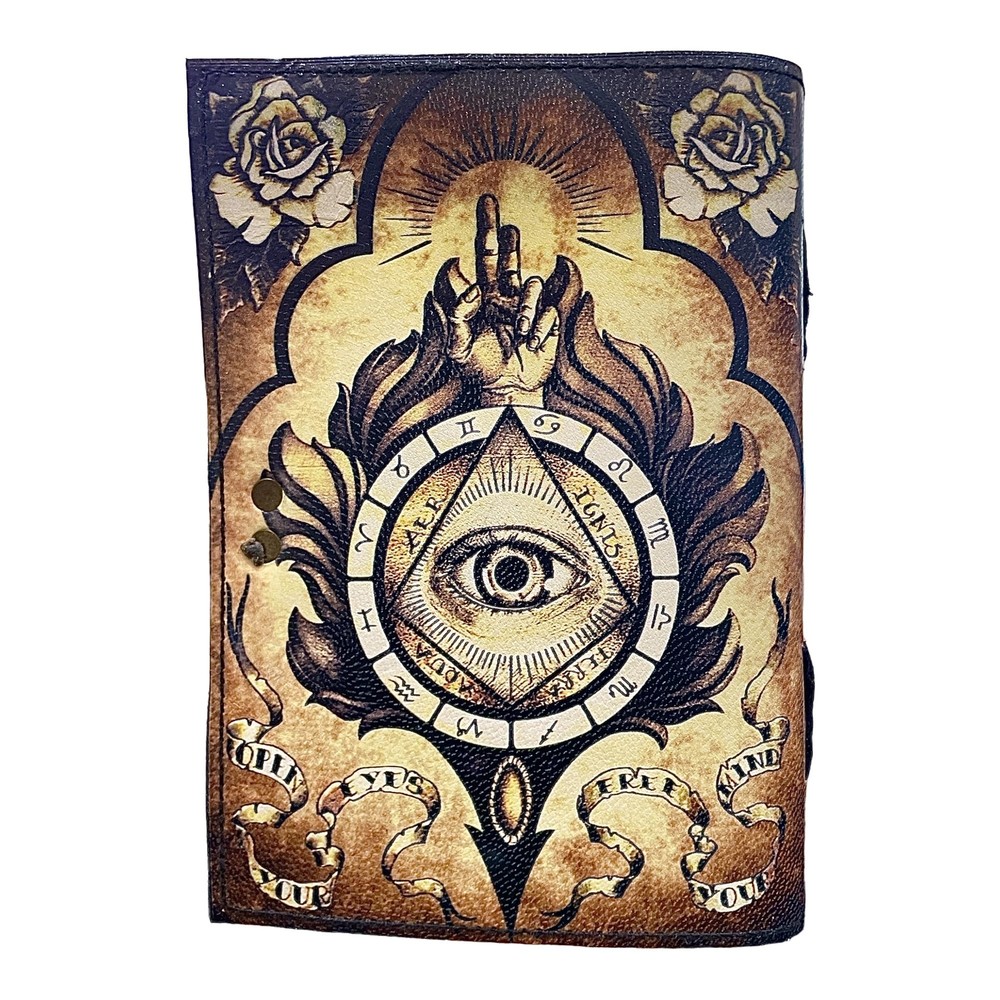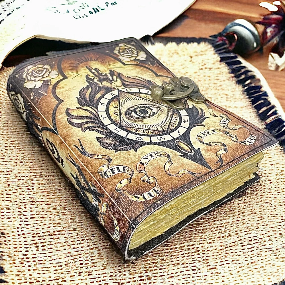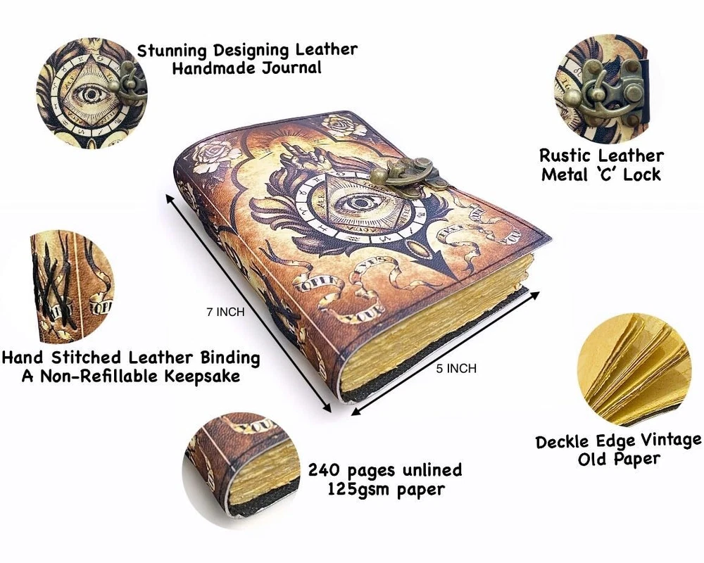 Book of Spells Leather Bound Journal Deckle Edge Paper Grimoire Printed Diary Third Eye Notebook Spiral Gothic Notebook Antique Vintage Book for Men and Women (The Third Eye) BEAUTIFULLY CRAFTED: Our handmade artisan leather bound spell book grimoire journals are crafted from genuine leather. The black colouring gives it a beautiful antique vintage feel. Being hand-made from natural leather. The cover features a beautiful gold designing. IDEAL SIZE & THICK PAPER: Compact 7X5" size, easy to carry around or slip into a bag; and not so small that you can’t express any creativity - 240 pages of smooth craft paper allowing the pen to glide effortlessly across the page. PERFECT FOR GIFTING: Suitable for both men or women to write in, this locking diary daily travelers notebook is perfect for an avid writer, or Harry Potter fan looking for a magic spell book. Ideal to give as a birthday gift, valentines, halloween, graduation or wedding anniversary present. MYSTICAL DESIGN: Immerse yourself in the world of magic with a leather-bound journal featuring a mystical design, perfect for capturing your spells, rituals, and spiritual reflections. Handcrafted to perfection by the artisans of Rajasthan, India OUR PROMISE: We are positive you will love our products, but if you don't for any quality reason, we will replace or for up to 30 days after purchase. Our friendly team are always available to answer any questions you might have. MANY USES - This aesthetic Guardian of nature Journal can be used as a Hocus Pocus gifts , the lovers tarot journal, gothic notebook, skull journal, spell books halloween decorations, book of spells halloween decor. grimoire spell book, drawing or sketching and compact for carrying in your bag. Ideal for alternative Artist Sketchbooks, Photo Album, Traveling Notes, Business Executive, Logbook, hocus pocus spell book , Journalists, Food Planner, old spell notebook, antique handmade skull journal. Shipping We ship within Three business days of payment, usually sooner. Some delivery times are longer than normal due to increased demand. We use a selection of shipping services such as UPS, FedEx, USPS etc. We only ship to the lower 48 states, no APO/FPO addresses or PO Boxes allowed. Local pickups and combined shipping options are not provided at this time. Return You can return a product for up to 30 days from the date you purchased it. Any product you return must be in the same condition you received it and in the original packaging. Please keep the receipt. Payment We accept payment by any of the following methods: PayPal Please pay as soon as possible after winning an auction, as that will allow us to post your item to you sooner! Feedback Customer satisfaction is very important to us. If you have any problem with your order, please contact us and we will do our best to make you satisfied. Contact Us If you have any queries, please contact us via ebay. We usually respond within 24 hours on weekdays. Thank you for shopping at our store.