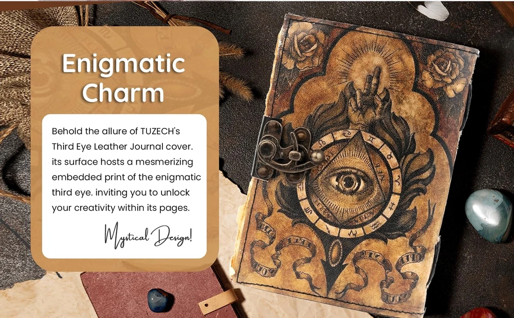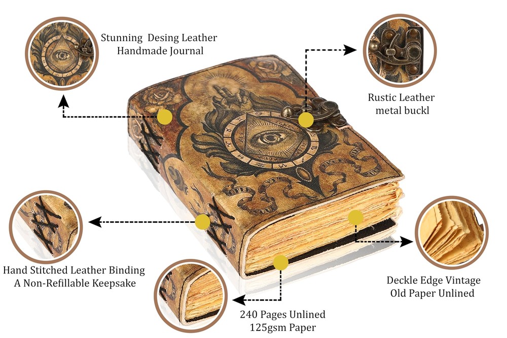 Book of Spells Leather Bound Journal Deckle Edge Paper Grimoire Printed Diary Third Eye witchcraft supply and Witch Spell Notebook Antique Vintage Book for Men and Women (The Third Eye) BEAUTIFULLY CRAFTED: Our handmade artisan leather bound spell book grimoire journals are crafted from genuine leather. The black colouring gives it a beautiful antique vintage feel. Being hand-made from natural leather. The cover features a beautiful gold designing. IDEAL SIZE & THICK PAPER: Compact 7X5" size, easy to carry around or slip into a bag; and not so small that you can’t express any creativity - 240 pages of smooth craft paper allowing the pen to glide effortlessly across the page. PERFECT FOR GIVING: Suitable for both men or women to write in, this locking diary daily travelers notebook is perfect for an avid writer, or Harry Potter fan looking for a magic spell book. Ideal to give as a birthday gift, valentines, halloween, graduation or wedding anniversary present. MYSTICAL DESIGN:Immerse yourself in the world of magic with a leather-bound journal featuring a mystical design, perfect for capturing your spells, rituals, and spiritual reflections. Handcrafted to perfection by the artisans of Rajasthan, India. OUR PROMISE: We are positive you will love our products, but if you don't for any quality reason, we will replace or for up to 30 days after purchase. Our friendly team are always available to answer any questions you might have. MANY USES - This aesthetic Guardian of nature Journal can be used as a Hocus Pocus gifts , the lovers tarot journal, gothic notebook, skull journal, spell books halloween decorations, book of spells halloween decor. grimoire spell book, drawing or sketching and compact for carrying in your bag. Ideal for alternative Artist Sketchbooks, Photo Album, Traveling Notes, Business Executive, Logbook, hocus pocus spell book , Journalists, Food Planner, old spell notebook, antique handmade skull journal. It's an Eco-friendly handmade leather journal with beautiful cover. The journal is consisting of handmade Sketch papers (khadi papers). Every page of this diary will become a gem with your precious memories. Usage: Personal journal, gift for women, gift for men, holiday gift, mother's day gift, father’s day gift, birthday gift, Valentine’s Day gift, vintage collection. Product Details: Dimensions: Length - 7 inches x Width - 5 inches Handcrafted out of the finest quality of leather . Embrace the essence of the natural world with the Guardian of Nature Diary, a sanctuary for capturing your thoughts, observations, and reflections on the wonders of the earth. A metal lock & 240 pages of unruled handmade papers Highly durable & functional, this decorative record book can be used for writing, noting & jotting, sketching, doodling or recording personal as well as professional activities Handcrafted to perfection by the artisans of Rajasthan, India Safety and Precautions: The journal is made of leather and drawing papers which should be protected from water. Its not Refillable Shipping We ship within Three business days of payment, usually sooner. Some delivery times are longer than normal due to increased demand. We use a selection of shipping services such as UPS, FedEx, USPS etc. We only ship to the lower 48 states, no APO/FPO addresses or PO Boxes allowed. Local pickups and combined shipping options are not provided at this time. Return You can return a product for up to 30 days from the date you purchased it. Any product you return must be in the same condition you received it and in the original packaging. Please keep the receipt. Payment We accept payment by any of the following methods: PayPal Please pay as soon as possible after winning an auction, as that will allow us to post your item to you sooner! Feedback Customer satisfaction is very important to us. If you have any problem with your order, please contact us and we will do our best to make you satisfied. Contact Us If you have any queries, please contact us via ebay. We usually respond within 24 hours on weekdays. Thank you for shopping at our store.