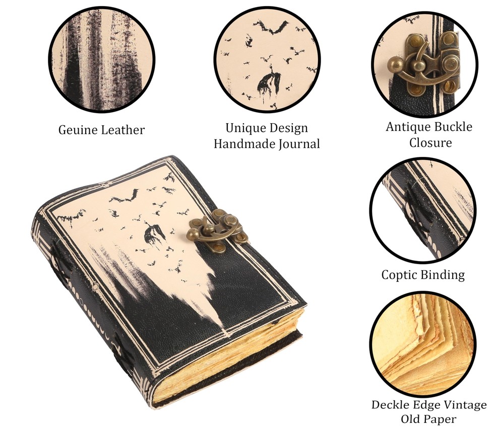 Welcome to our stores! We guarantee you will be satisfied. Book of Spells Leather Bound Journal Deckle Edge Paper Grimoire Printed Diary Third Eye Notebook Spiral Gothic Notebook Antique Vintage Book for Men and Women (The Necromancy) Product Overview It's an Eco-friendly handmade leather journal with beautiful cover. The journal is consisting of handmade Sketch papers (khadi papers). Every page of this diary will become a gem with your precious memories. Usage: Personal journal, gift for women, gift for men, holiday gift, mother's day gift, father’s day gift, birthday gift, Valentine’s Day gift, vintage collection. Product Details: Dimensions: Length - 7 inches x Width - 5 inches Handcrafted out of the finest quality of leather . Embrace the essence of the natural world with the Guardian of Nature Diary, a sanctuary for capturing your thoughts, observations, and reflections on the wonders of the earth. A metal lock & 240 pages of unruled handmade papers Highly durable & functional, this decorative record book can be used for writing, noting & jotting, sketching, doodling or recording personal as well as professional activities Handcrafted to perfection by the artisans of Rajasthan, India Safety and Precautions: The journal is made of leather and drawing papers which should be protected from water. Its not Refillable Key Features BEAUTIFULLY CRAFTED: Our handmade artisan leather bound spell book grimoire journals are crafted from genuine leather. The black colouring gives it a beautiful antique vintage feel. Being hand-made from natural leather. The cover features a beautiful gold designing. IDEAL SIZE & THICK PAPER: Compact 7X5" size, easy to carry around or slip into a bag; and not so small that you can’t express any creativity - 240 pages of smooth craft paper allowing the pen to glide effortlessly across the page. PERFECT FOR GIVING: Suitable for both men or women to write in, this locking diary daily travelers notebook is perfect for an avid writer, or Harry Potter fan looking for a magic spell book. Ideal to give as a birthday gift, valentines, halloween, graduation or wedding anniversary present. MYSTICAL DESIGN:Immerse yourself in the world of magic with a leather-bound journal featuring a mystical design, perfect for capturing your spells, rituals, and spiritual reflections. Handcrafted to perfection by the artisans of Rajasthan, India. OUR PROMISE: We are positive you will love our products, but if you don't for any quality reason, we will replace or refund for up to 30 days after purchase. Our friendly customer service team are always available to answer any questions you might have. MANY USES - This aesthetic Guardian of nature Journal can be used as a Hocus Pocus gifts , the lovers tarot journal, gothic notebook, skull journal, spell books halloween decorations, book of spells halloween decor. grimoire spell book, drawing or sketching and compact for carrying in your bag. Ideal for alternative Artist Sketchbooks, Photo Album, Traveling Notes, Business Executive, Logbook, hocus pocus spell book , Journalists, Food Planner, old spell notebook, antique handmade skull journal. Payment Information ■ Secure payments through eBay. ■ We accept PayPal and all major credit cards. ■ Immediate payment required upon purchase. ■ For any payment issues, please contact our support team. Shipping Information ■ Orders are shipped to the address provided during checkout. Please verify your address. ■ We process orders within 1 business day (excluding weekends and holidays). ■ Standard delivery time is 3-5 business days. ■ We use trusted carriers like UPS, FedEx, and USPS. ■ Shipping is only available within the contiguous United States. No shipping to Alaska, Hawaii, Puerto Rico, or PO Boxes. ■ If there are any shipping delays, please contact us for support. Return Policy ■ We offer a 30-day return policy. ■ If you are not satisfied with your purchase, you can return it within 30 days for a full refund. ■ Please contact us to obtain the return address before sending back any items. ■ Items must be returned in their original condition and packaging.