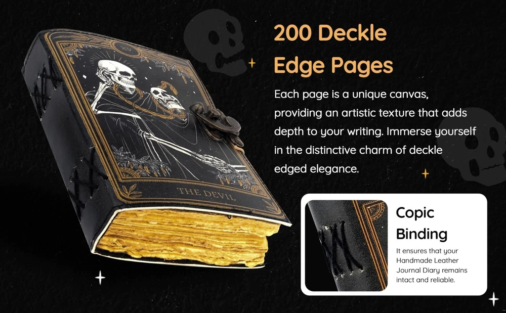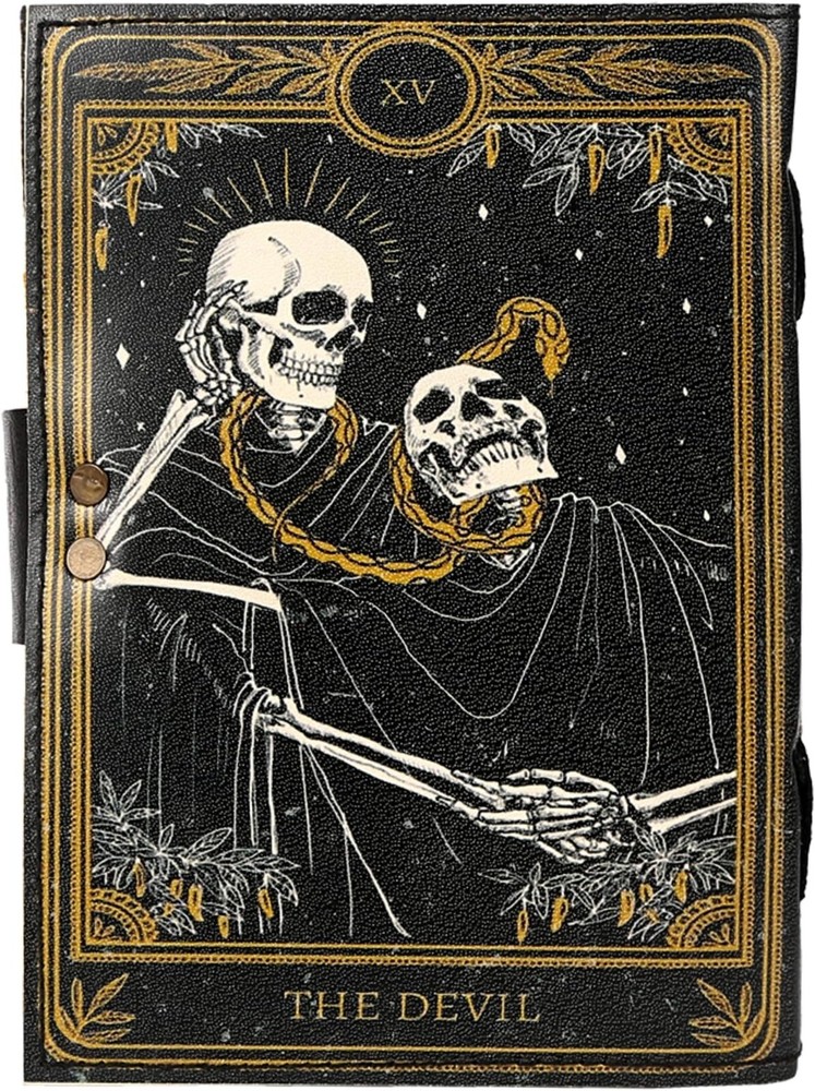 ✅ BEAUTIFULLY CRAFTED: Our handmade artisan leatherbound spellbook grimoire journals are crafted from genuine leather. The black colouring gives it a beautiful antique vintage feel. Being hand-made from natural leather. The cover features a beautiful gold designing.. ✅ IDEAL FOR TAROT ENTHUSIASTS:Perfect for tarot enthusiasts and practitioners, providing a special space to connect with The Devil Tarot symbolism and record your tarot-related experiences. ✅ PERFECT GIFT:A thoughtful and visually striking gift for both men and women, especially those interested in tarot, divination, and the mystical arts. ✅ TAROT REFLACTIONS SECTION:Dedicated section for Tarot reflections, allowing you to explore and document insights related to The Devil Tarot card and your personal journey with tarot readings Handcrafted to perfection by the artisans of Rajasthan, India ✅ OUR PROMISE: We are positive you will love our products, but if you don't for any quality reason, we will replace or refund for up to 30 days after purchase. Our friendly customer service team are always available to answer any questions you might have. ✅ MANY USES - This aesthetic Lovers Journal Can be used as a Hocus Pocus gifts , the lovers tarot journal, gothic notebook, skull journal, spell books halloween decorations, book of spells halloween decor. grimoire spell book, drawing or sketching and compact for carrying in your bag. Ideal for alternative Artist Sketchbooks, Photo Album, Traveling Notes, Business Executive, Logbook, hocus pocus spell book , Journalists, Food Planner, old spell notebook, antique handmade skull journal Avoid:- grimoire notebook nature's colorful spell natures colorful spell luna moth journal book of shadow journal leather spell book journal spell journal pagan gifts for men moth diaries larp gifts secret grimoire of plant and crystal magic pagan gifts pagan gifts for women khamsa hocus pocus diary with lock and keys journal eco friendly spiritual notebook moth journal earth journal spiritaul celestial leather journal the lovers journal journal leather tree of life spell notebook spiritual wizard spell book cool note books earth's embrace a mother's love eye of the ouroboros tree of life journal spirtual butterfly leather journal eco friendly journal spell bound book grimm book of wesen leather celtic tree of life book of shadows hearth and hand journal steampunk journal grimorio voice activated diary ancient journal horror journal vintage spell books earth spells are easy spell bound chaweon koo tree of life leather journal journal tree of life mother earth ecofriendly journal hippy journal spellbook journal grimoire journal ancient grimoire large bound journal antique handmade leather bound daily notepad leather grimoire journal triquetra leather journal spellbook blank spell book of shadows journal pagan spell book billfold tree of life journal leather book of shadows blank emo journal uncharted journal replica leather grimoire 3 moon blue lapiz embossed vintage leather journal green kind of witch death note notebook journal book of shadows journal blank spellbook billfold witcher notebook a colorful life journal spiretual blank books of shadows antique journal lock moon phase studios journal leather tree of life journal deathnote notebook journal spell journal blank goddess journal goth journal hocus pocus journal holtz leather journal antique leather bound journal witches journal leather tree life journal the shadow journal book spiritual journals sanderson sisters spell book halloween sketchbook black leather grimoire parchment paper book grimoire spell book authentic journal book of spells leather tree journal sacred spiral book leather journal tree of life leather journal tree book bound journal vintage journal notebook meditation journal spiritual vintage journal with lock and key pirate journal talisman book witcher journal leather spell book vintage leather book antique diary journal bungie grimoire leather spell book with spells mother earther modest goods vintage leather journal blank book of shadows leather journal moonster vintage journal with lock spell book journal grimoire blank you are a badass journal limitless earth tree of life journal for women novelty notebook antique sketchbook antique sketch book dnd grimoire viking notebook grimiores old notebook journal witch journals for writing grimoire journal large vintage leather bound journals vintage leather bound journal edge of the earth punk journal used journals leatherbound notebook leather bound recipe book notebook antique evil eye journal real book of shadows necronomicon journal speel book antique journals hocus-pocus spell book embossed leather dual dragons 120 leaf journal by things2die4 ticket stub diary satanic bible hardcover pages book of shadows spell book old sketchbook a year of pagan prayer cool notebooks sketch book leather bound vampire hunting kit charmed book of shadows spell paper deckle edge books medieval book gifts for pagans small decorative journal book of shadows pen tarot grimoire waiting for the night reading journal necronomicon cookbook book journal for book celestial moon large leather notebook moonster leather journal large tree of life leather journal spells book tree of life notebook libra journal john winchester's journal leatherbound notebooks notepad men tree of life shadow journal for women third eye code gothic journal naruto notebook india notebook wolf journal leather vegan leather journal terra cotta thoughts - designworks ink shadow book journal for women hocus pocus leather journal the grievance journal book of shadows pages torn from a travel journal spiritual journal celestial journal book of shadows spell book journal natural hardcover grimoire blank grimoire digital journal tandy leather journal prayer journal for women blank gothic stationery set bound leather journal meditation journal for men shadow spell smash book vintage book horror notebook grimore mens leather prayer j