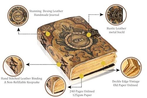 Return Policy Fast Delivery Trusted seller Book of Spells Leather Bound Journal Deckle Edge Paper Grimoire Printed Diary Third Eye witchcraft supply and Witch Spell Notebook Antique Vintage Book for Men and Women (The Third Eye) Product Description BEAUTIFULLY CRAFTED: Our handmade artisan leather bound spell book grimoire journals are crafted from genuine leather. The black colouring gives it a beautiful antique vintage feel. Being hand-made from natural leather. The cover features a beautiful gold designing. IDEAL SIZE & THICK PAPER: Compact 7X5" size, easy to carry around or slip into a bag; and not so small that you can’t express any creativity - 240 pages of smooth craft paper allowing the pen to glide effortlessly across the page. PERFECT FOR GIVING: Suitable for both men or women to write in, this locking diary daily travelers notebook is perfect for an avid writer, or Harry Potter fan looking for a magic spell book. Ideal to give as a birthday gift, valentines, halloween, graduation or wedding anniversary present. MYSTICAL DESIGN:Immerse yourself in the world of magic with a leather-bound journal featuring a mystical design, perfect for capturing your spells, rituals, and spiritual reflections. Handcrafted to perfection by the artisans of Rajasthan, India. OUR PROMISE: We are positive you will love our products, but if you don't for any quality reason, we will replace or refund for up to 30 days after purchase. Our friendly customer service team are always available to answer any questions you might have. MANY USES - This aesthetic Guardian of nature Journal can be used as a Hocus Pocus gifts , the lovers tarot journal, gothic notebook, skull journal, spell books halloween decorations, book of spells halloween decor. grimoire spell book, drawing or sketching and compact for carrying in your bag. Ideal for alternative Artist Sketchbooks, Photo Album, Traveling Notes, Business Executive, Logbook, hocus pocus spell book , Journalists, Food Planner, old spell notebook, antique handmade skull journal. Shipping Returns Payment Shipping Shipping is FREE to all addresses other than APO/PO boxes in the lower 48 states. All our stock ships from US-based warehouses. Shipped via USPS or UPS (depending on location and package weight) Unless stated otherwise, all orders will ship within 24-72 hours of your payment being processed. Check our feedback to see the great reviews of FAST shipping we offer. Returns Seller does not accept returns Payment We currently accept payment via eBay managed payments only. Once payment is cleared, we will dispatch your shipment within 1-3 business days. Please refer to the "Shipping" tab for more information regarding shipping speed to your destination.