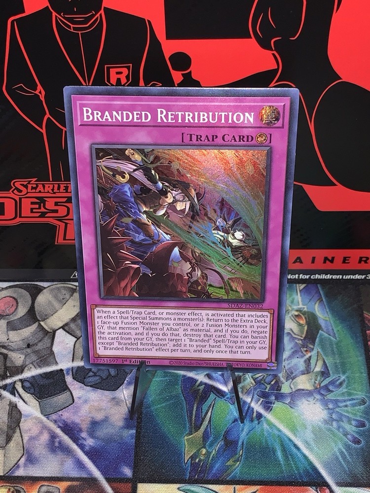 | Card Text | When a Spell/Trap Card, or monster effect, is activated that includes an effect that Special Summons a monster(s): Return to the Extra Deck, 1 face-up Fusion Monster you control, or 2 Fusion Monsters in your GY, that mention "Fallen of Albaz" as material, and if you do, negate the activation, and if you do that, destroy that card. You can banish this card from your GY, then target 1 "Branded" Spell/Trap in your GY, except "Branded Retribution"; add it to your hand. You can only use 1 "Branded Retribution" effect per turn, and only once that turn. |