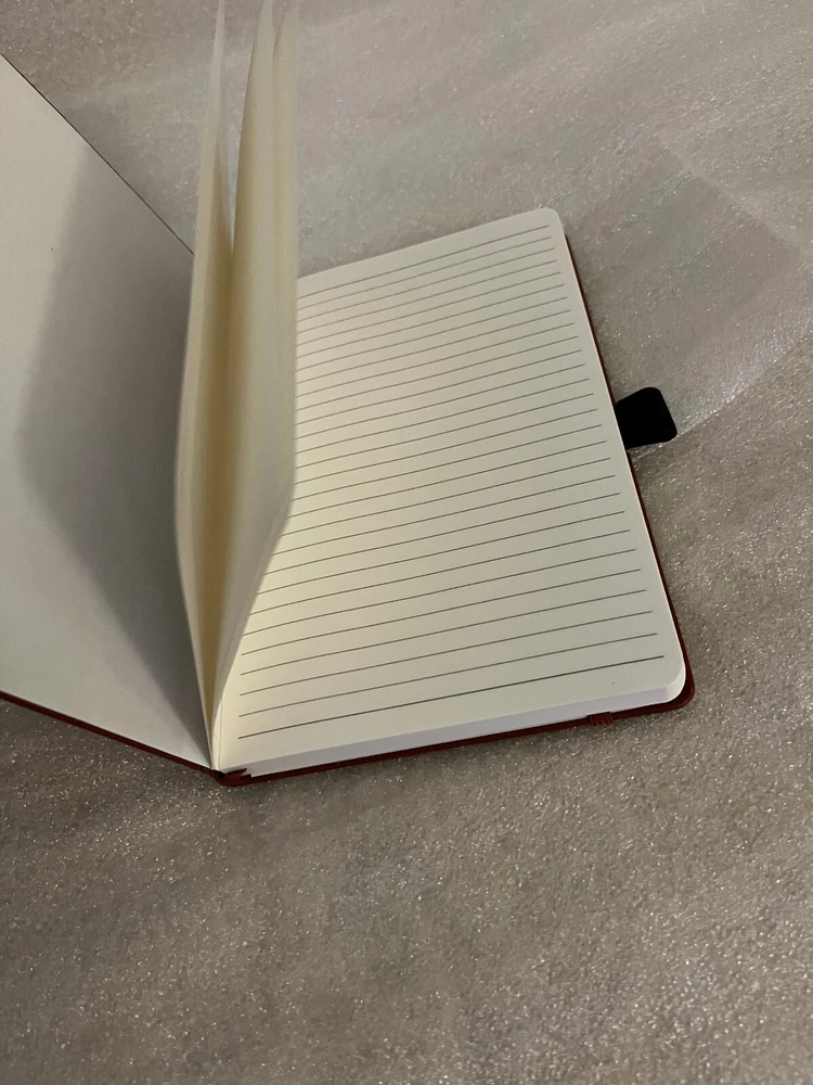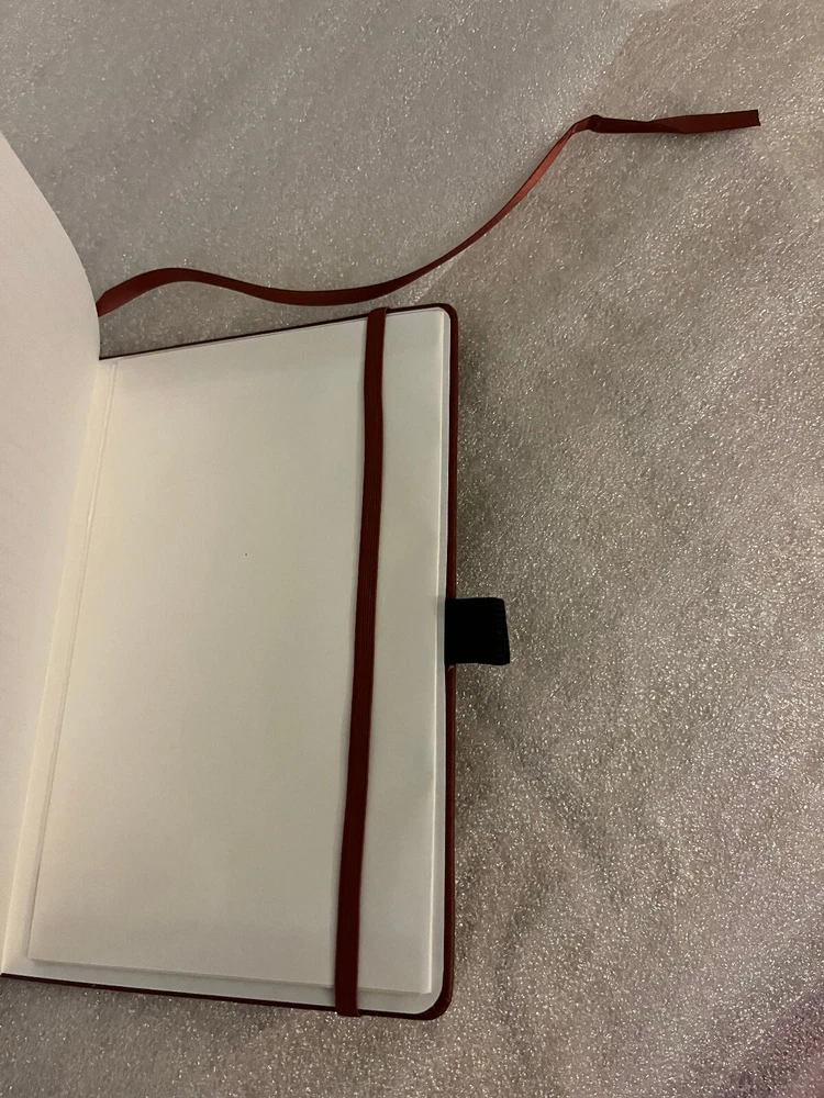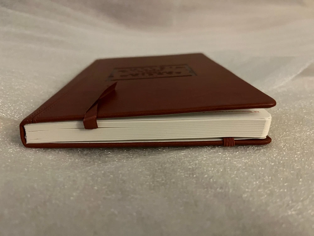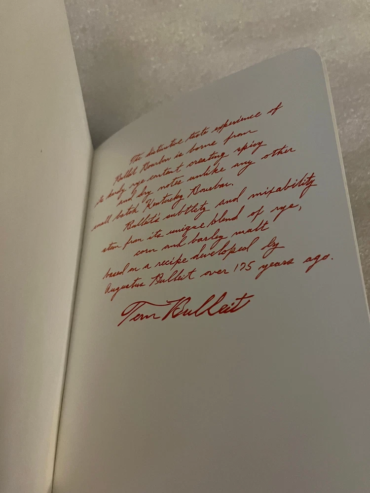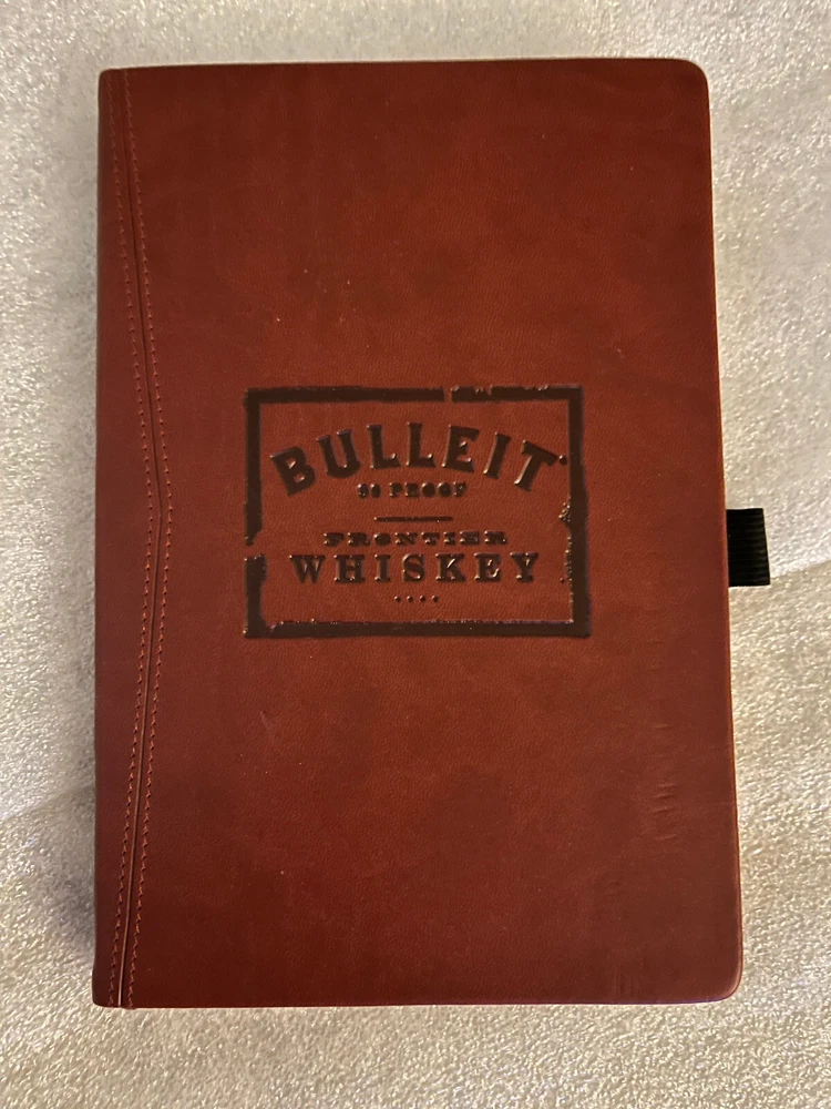 "Bulleit 90 Proof Frontier Whiskey" is "branded" into the front of this elegant, leather-bound journal. It has a soft hardcover, ribbon bookmark/page keeper, loop for a pencil or pen, and strap on the inside back cover to hold it closed if you like to put notes or photos in the pages. Measures about 8"H x 6"W. Pages are lined. Looks like it may be 100 pages. Great for a collector or even just someone who wants a quality notebook for journaling. Book is new but the last photo shows some damage to the top of the back cover. Please check "Seller's other items" to see my other listings!