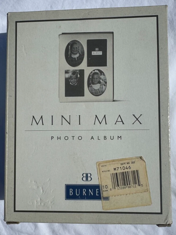 The Burnes 4x6 Mini Max Photo Album in Silver features a post-bound format with a family theme. It has 4 photo slots on the front cover for personalization. This mini album is designed to hold and display your cherished memories in a compact and stylish way. New in Box - Burnes of Boston 40 double pages