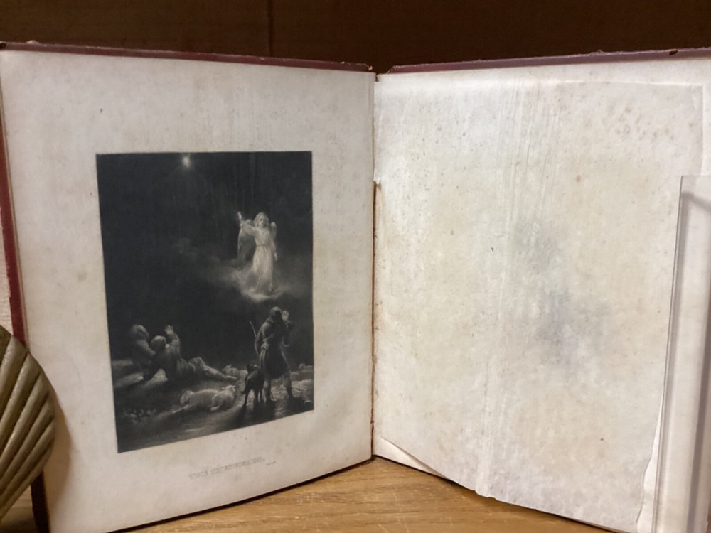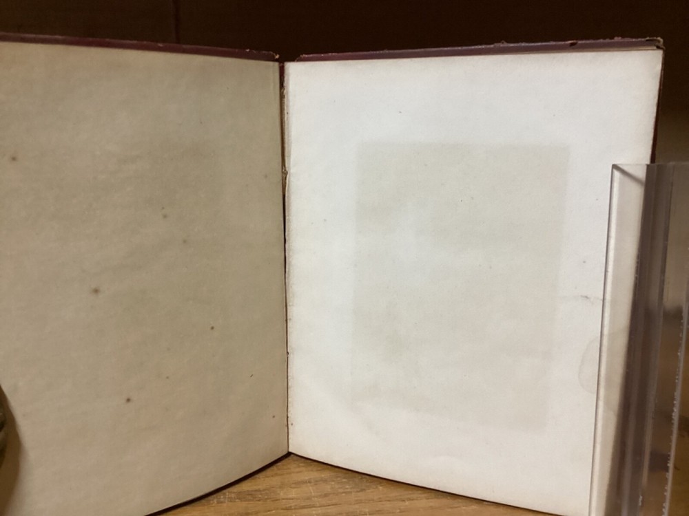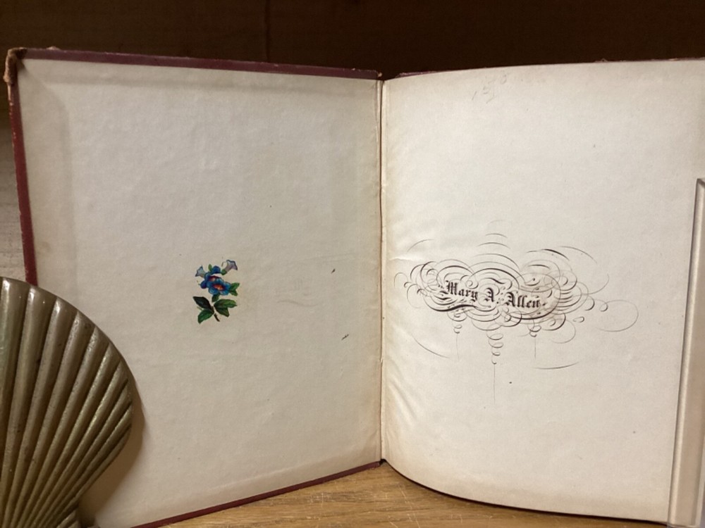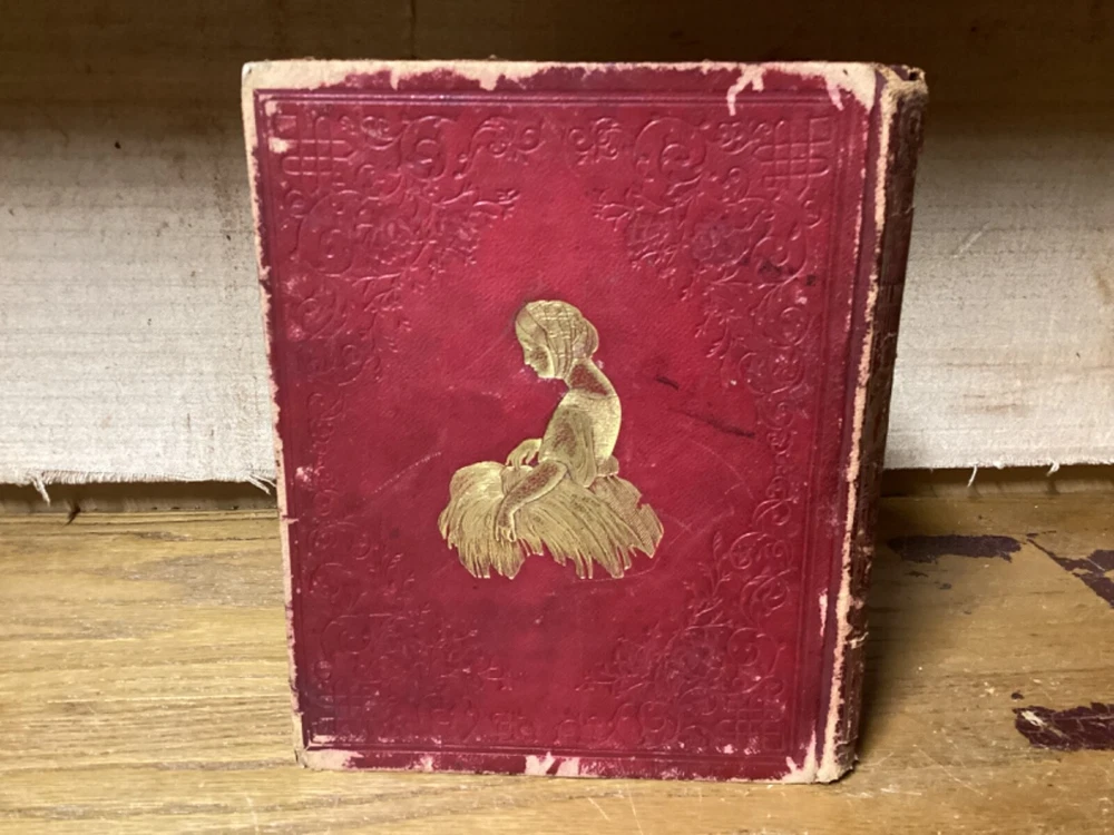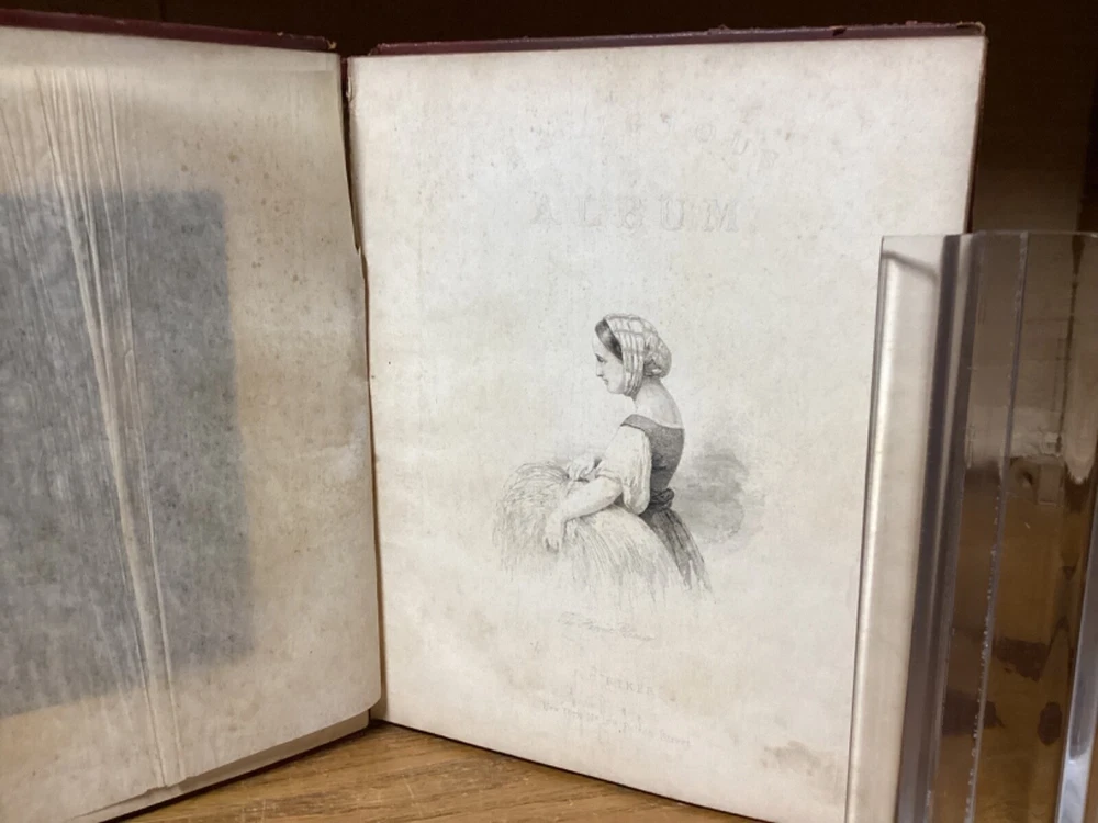“Religious Album.” Published in New York City by J.C. Riker. Includes around 15 pages of writing, along with several black-and-white plates with tissue guards. 7.75” x 6.25”. 12mo. Hardcover decorative full leather. In fair condition, with rubbing and wear to boards, primarily along edges and corners. Losses and looseness to spine. Cracking to front hinge, with frontispiece plate partially loose. Some wear and creasing to tissue guards. Some staining remnants. General age-related toning to pages, along with periodic foxing and wear. Please see photographs and ask any questions prior to purchasing. A scarce friendship album, being then property of Mary A. Allen, likely of Philadelphia. Includes an assortment of inscriptions to Mary, with dates ranging from 1856 to the early 1860s. A rare look at Victorian-era literature, along with elegant displays of handwriting and penmanship. A wonderful candidate for restoration. COLM1856BJKX