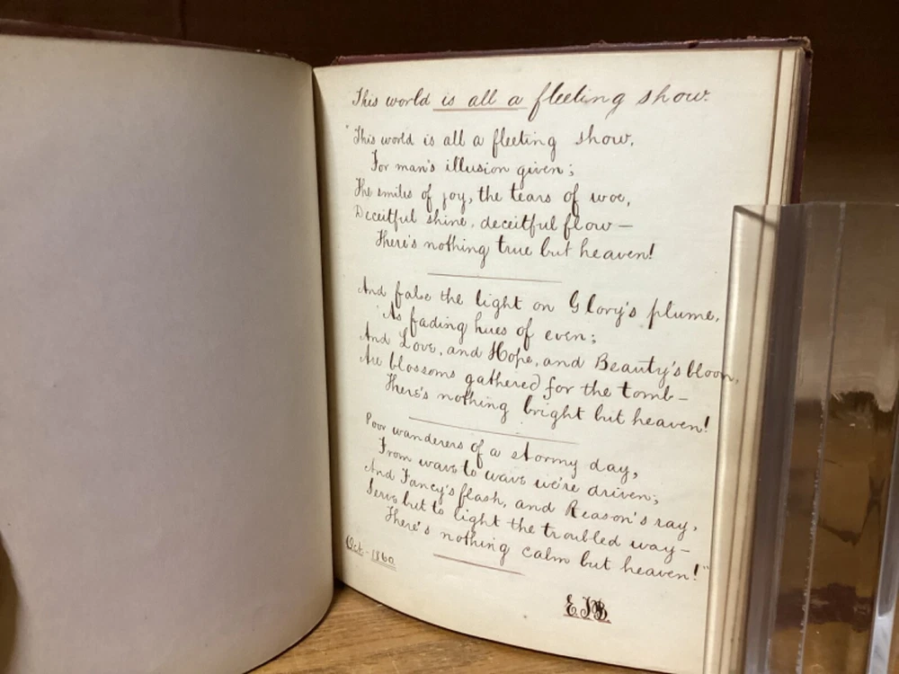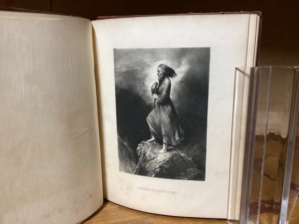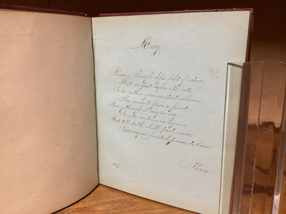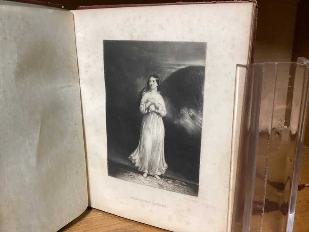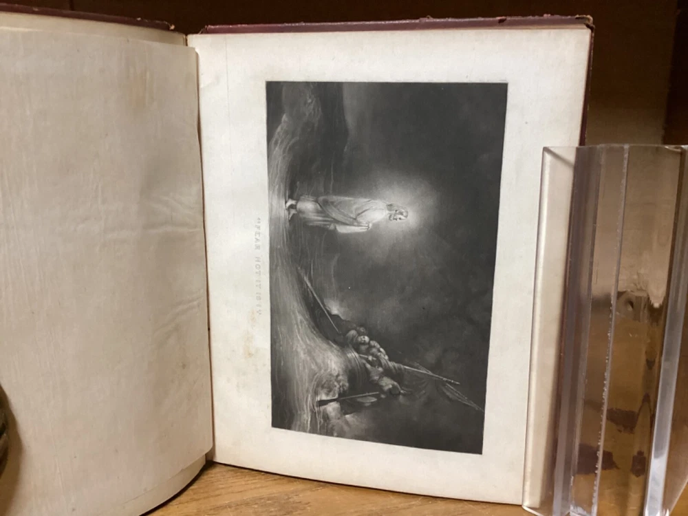 “Religious Album.” Published in New York City by J.C. Riker. Includes around 15 pages of writing, along with several black-and-white plates with tissue guards. 7.75” x 6.25”. 12mo. Hardcover decorative full leather. In fair condition, with rubbing and wear to boards, primarily along edges and corners. Losses and looseness to spine. Cracking to front hinge, with frontispiece plate partially loose. Some wear and creasing to tissue guards. Some staining remnants. General age-related toning to pages, along with periodic foxing and wear. Please see photographs and ask any questions prior to purchasing. A scarce friendship album, being then property of Mary A. Allen, likely of Philadelphia. Includes an assortment of inscriptions to Mary, with dates ranging from 1856 to the early 1860s. A rare look at Victorian-era literature, along with elegant displays of handwriting and penmanship. A wonderful candidate for restoration. COLM1856BJKX