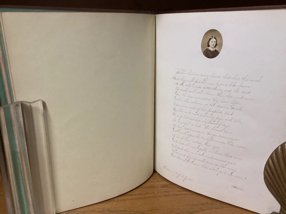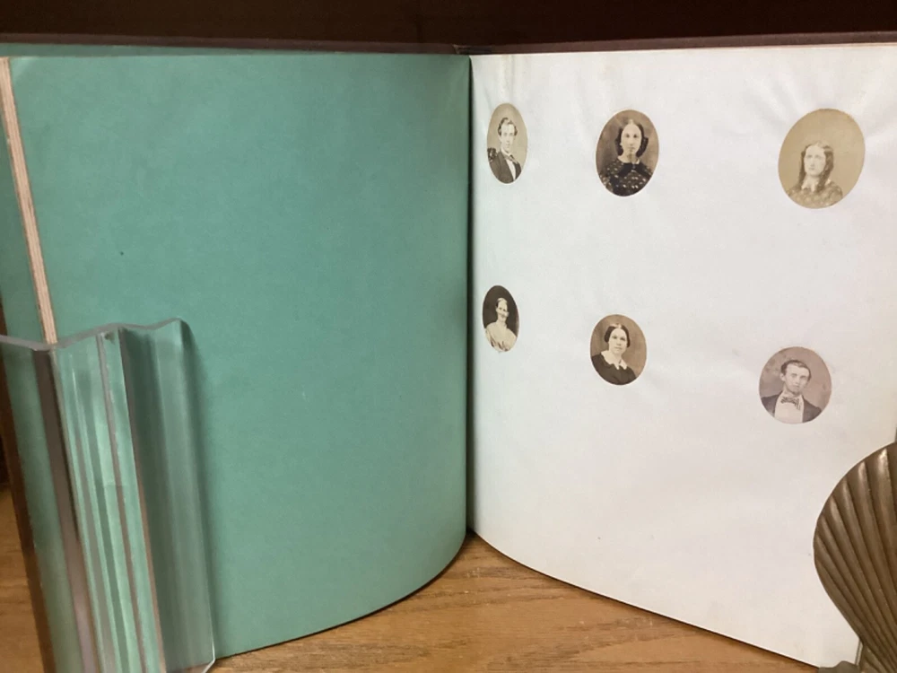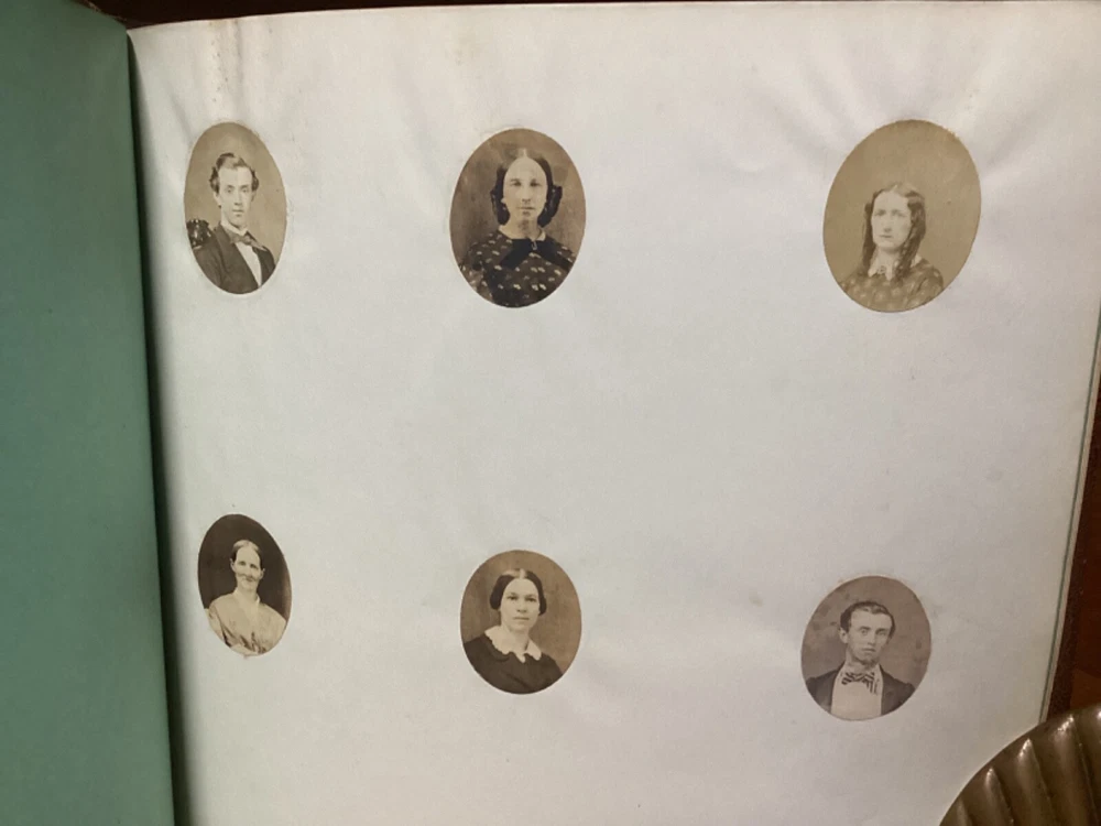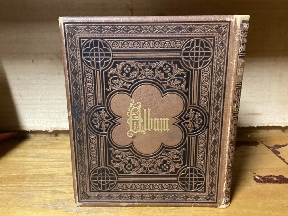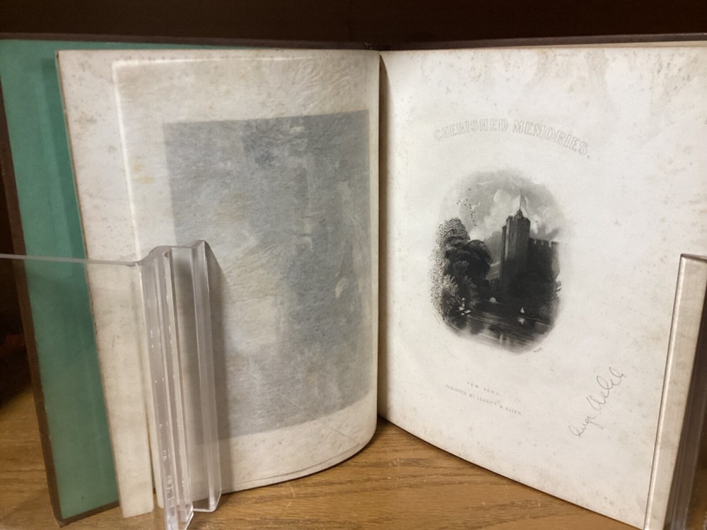 Cherished Memories. Circa 1861 journal produced in New York City by Leavitt and Allen. Decorative full leather with approximately 15 touched pages. 9.75” x 8.25”. Overall very good. Exterior nicely preserved, with light rubbing and wear along edges and corners of boards and spine. Hinges remain in good condition and text block remains bound well. Light markings at front. Images and plates remain in good condition. General age-related toning to pages, along with periodic foxing and wear. Please see photographs and ask any questions prior to purchasing. A scarce piece, comprising of several letters and plates. Additionally includes a page with six small cut-out photographs of men and women. Also includes a letter from a woman named Maria, with her image featured at top. A beautifully look at a larger Civil War-era keepsake, with some of the letters being from 1861 and Hudson, New York. COLM1861AFGC-0724-aj1945