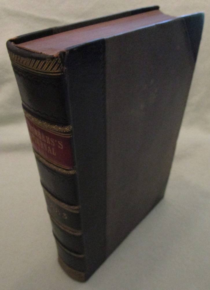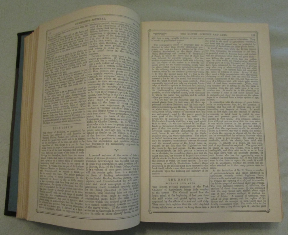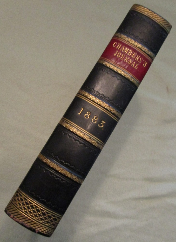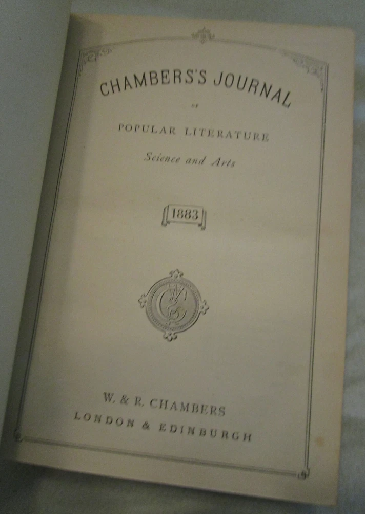 "Chambers's Journal of Popular Literature, Science, and Art" - 1883 Published by W. & R. Chambers (London & Edinburgh) "Fourth Series" Conducted with William and Robert Chambers Half-Leather Bound Includes 52 weekly issues Approx. 10" x 7" 832 pages Condition is GOOD: Cover stains and corner bumps End papers are separating at the hinges Erased pencil writing on half-title page A bit of moisture spotting on first few pages