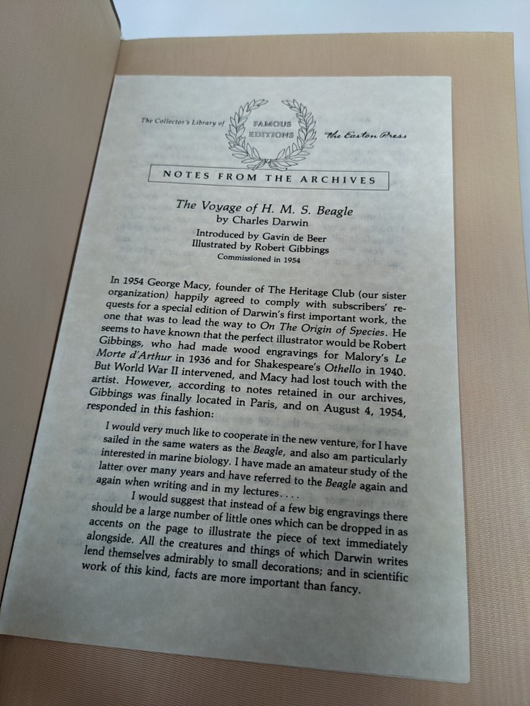 This listing is for a lot of two Easton Press books by Charles Darwin. Both used, but good condition. Voyage of the HMS Beagle includes booklet. See pictures for exact details. Will ship quickly after payment is received!