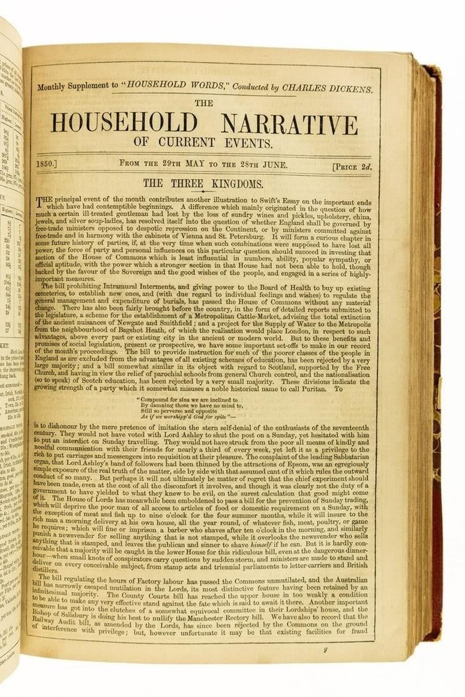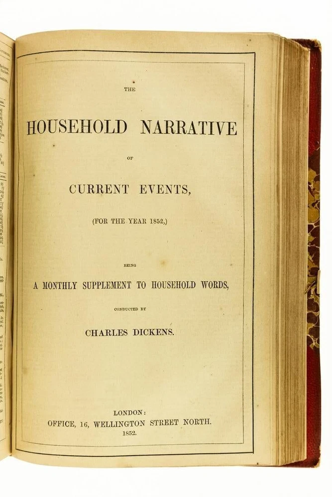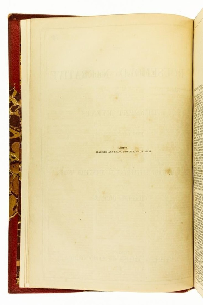 THE HOUSEHOLD NARRATIVE OF CURRENT EVENTS 1850â€1855 Author: (Charles Dickens) Title: THE HOUSEHOLD NARRATIVE OF CURRENT EVENTS 1850â€1855 Publication: London: [Uncredited publisher], 1850â€1855 Edition: First - Bound from parts Description: ″ The Household Narrative of Current Events [was] a twopenny monthly retrospect of national, international news, and other information, published from April 1850 to December 1855 (including numbers for January †March 1850) [… It] aimed to extend the scope of the main journal in new directions, making the suite of publications a complete, cheap and widely available compendium to the life of the times An advertisement for the Narrative called it 'a complete and carefullyâ€digested ANNUAL REGISTER,′ indicating Dickens′s hope that in its bound volume form it would emulate Burke and Dodsley′s famous Annual Register … [of] History, Politicks, and Literature, which he himself found so useful as a reference work for his journalism and historical fiction Dickens′s frontâ€page announcement of the new venture reminded readers of 'the intimate connexion between the facts and realities of the time, and the means by which we aim, in Household Words, to soften what is hard in them, to exalt what is held in little consideration, and to show the latent hope there is in what may seem unpromising′ The Narrative would thereby be another means 'to bear the world′s rough cast events to the anvil of courageous duty, and there beat them into shape′ If the Victorian reporter is often figured as Asmodeus, the strange compound metaphor here casts the Victorian editor as Vulcan The Narrative′s nine subdivisional headings †'Parliament and Politics,′ 'Law and Crime,′ 'Accident and Disaster,′ 'Social, Sanitary and Municipal Progress,′ 'Obituaries, Colonies and Dependencies,′ 'Foreign Events,′ 'Commercial Record,′ 'Stocks and Shares,′ and 'Emigration Figures′ †clearly signalled a continuation of the special interest shown by Household Words in all these topics, presented in a more regimented, heavily factual and statistical format To the extent that it provided the kind of corroborative detail and data on which the parent magazine based its arguments and reform campaigns, the Narrative acted as a guarantor of the integrity of opinion in Household Words″ (Courtesy Dickens Journals Online) This set contains the entire publication run, from January, 1850 to December, 1855 The books are one of several of our Dickens-related listings, all originally from a private estate library All are uniformly bound in fancy threeâ€quarter crimson leather with deep red marbled paper for endpapers and over the balance of the boards Gilt all around The materials used for the bindings date the binding to around 1890, and the bookplate of Julius Franke (1868â€1936) is present on the front pastedown Franke was a prominent New York City architect, whose work included designing the Wurlitzer Building, and it seems likely that he commissioned the bindings This volumes shows only slight shelfwear The bindings and text block are sound The pages are age toned, but clean The ink name "Baker" is at the top of a flyleaf in each volume, but there are no other marks or damage. Near Fine. Seller ID: AA1674 Baykorp Books Selling quality books and related items at reasonable prices. Terms All orders ship within two business days. Standard mail is USPS Media Mail. Expedited and international shipping are also available. We offer combined shipping on multiple orders. All items are guaranteed to be as described or they may be returned within 30 days of receipt for a full refund. This listing was created by Bibliopolis.