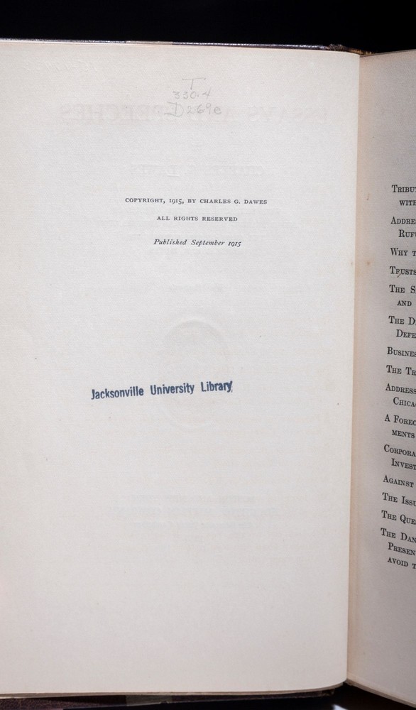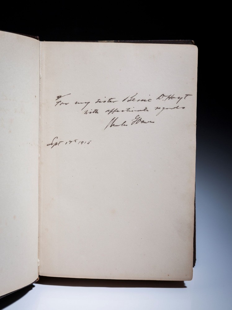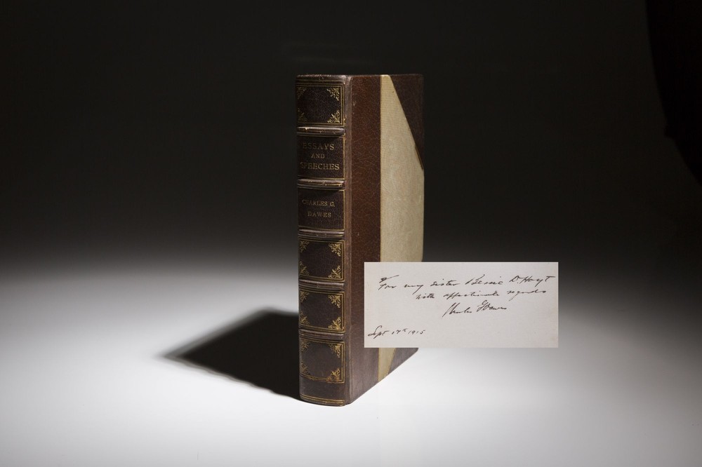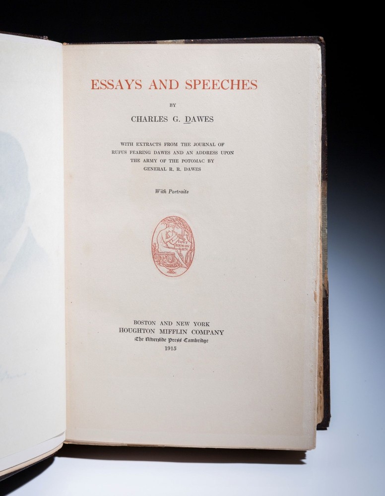 Essays and Speeches; With Extracts From The Journal of Rufus Fearing Dawes And An Address Upon The Army of the Potomac by General R.R. Dawes. With Portraits Author: Dawes, Charles G. Title: Essays and Speeches; With Extracts From The Journal of Rufus Fearing Dawes And An Address Upon The Army of the Potomac by General R.R. Dawes. With Portraits Publication: Boston: Houghton Mifflin Company, 1915 Edition: First Edition, First Printing Description: First edition of Essays and Speeches by Charles G. Dawes, inscribed to his sister. Leather bound. Octavo, 427pp. Three quarter brown morocco, title in gilt on spine, raised bands. Reinforced hinges. Decorative binding done by The Riverside Press. Frontispiece portrait opposite title page. Top edge gilt. Ex-library copy, with bookplate affixed to front endpaper. Inscribed by Vice President Dawes to his sister, with the following inscription: "For my sister Bernie D. Hoyt, with affectionate regards. Charles G. Dawes. Sept 17th, 1915." Very good. Charles G. Dawes was the 30th Vice President of the United States under President Calvin Coolidge and Ambassador to Great Britain under President Herbert Hoover. This book details the speeches of Rufus Dawes, the father of Charles Dawes and military officer during the American Civil War. Rufus Dawes was known for his service with the Iron Brigade at Gettysburg. Seller ID: 1221 Subject: U.S. Politics The First Edition The First Edition offers collectors the finest selection of notable rare books by important world figures. Located in Cincinnati, Ohio and Vero Beach, FL, we take great pride in carrying books that are important around the world, but also in our local community . We’re proud members of the Independent Online Booksellers Association (IOBA), the Midwest Antiquarian Booksellers Association, the Northern Ohio Bibliophilic Society and the Better Business Bureau of Cincinnati. Terms All orders ship within two business days. Standard mail is USPS Media Mail. Expedited and international shipping are also available. We offer combined shipping on multiple orders. All items are guaranteed to be as described or they may be returned within 30 days of receipt for a full refund. This listing was created by Bibliopolis.