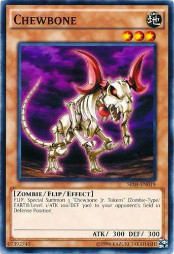 This unique Chewbone card from the Structure Deck: Dinosmasher's Fury set is a must-have for any Yu-Gi-Oh! TCG collector. With an attack/power of 300 and a defense/toughness of 300, this Zombie creature type card is a fierce addition to any deck. The card is a Common/Short Print rarity and features the Unlimited|Unlimited Edition. It is an Effect, Flip card with an Earth attribute/MTG color, and is in English language. The card number is SR04-EN019 and is manufactured by Konami. Add this versatile card to your collection today!