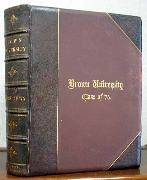 BROWN UNIVERSITY. Class of '75. [Cover title] Author: [Class Photograph Album]. Barker, C. F. - Former Owner Title: BROWN UNIVERSITY. Class of '75. [Cover title] Publication: [Providence, RI]: [1875] Edition: 1st edition thus Description: 85 leaves of stiff-stock mounting board. Album contains 86 original albumen photographs, portraits 6" x 4", mounted recto-only, on a 13" x 9 mount, one photograph per leaf. The scene photographs are ~ 6" x 8". A complete list of photographs supplied on request. 13-7/8" x 10-1/4" x 2-5/8". 3/4 brown leather album with gilt stamped title lettering to front board. Bevelled edges. AEG. Marbled eps. Front board professionally reattached. A VG+ album. The album begins with a photographic image of a portrait of Nicholas Brown, a college alum, early benefactor & for whom the college was renamed in 1804, followed by 15 photographs of important Brown alumni & professors, including past presidents Francis Weyland & Ezekiel Robinson. Then comes 39 individual photographic portraits of the 1875 graduating class, the preponderance holographically signed underneath, followed by a group photograph & 3 more individuals. The album concludes with 27 captioned [save 2] images of divers college & town landmarks/scenes, such as the "Library Interior", "Hope College - East", "Butler's Exchange" [which was new in 1875], "Bay from University Hall" & "Labratory". Included in these 27 are 2 large class group photographs of the class of 1875; one of these group photographs is set on the steps of Rhode Island Hall, werein each class member is holding a stuffed animal, no doubt from the Taxidermy class. A rare item, which not only visually documents this Ivy League school & the '75 class, but also the town during this year. Seller ID: 39748 Subject: Photography Tavistock Books, ABAA Reno, NV Established in 1989, Tavistock Books has recently moved from its former long-time Alameda CA location to Reno NV. We are a general antiquarian business, with material ranging from Aviation to Zoology, from the 16th C to the 21st. We have specialties in Dickens, History of Nursing, Children's Serial Fiction & Western Americana. Visits may be arranged by appointment, generally 10 am to 3 pm, Pacific Time. Guarantee We guarantee everything we sell and any item may be returned for any reason within 30 days of receipt. If the return is due to an error on our part, we will reimburse you the cost of your return. Please do exercise the same care in packaging, as we do in shipping all items purchased from us. We are members of the Antiquarian Booksellers' Association of America (ABAA), and the International Online Booksellers Association (IOBA). Shipping We are happy to ship to buyers outside of the United States. Please contact us for an exact shipping quote. All books shipped to US destinations are usually sent US Post Office Media Mail, with despatch usually within 72 hours of payment receipt. Delivery typically takes a week, but may be longer, especially during the holidays. Faster shipping is available, please contact us for a price quote. We will combine shipping on items purchased at the same time. We prefer PayPal. Feedback We leave feedback for buyers once they have posted feedback for us. If you are unhappy with any aspect of a transaction with us, please contact us immediately. We work hard to keep buyers happy and to promptly resolve the rare problem that may arise. This listing was created by Bibliopolis.