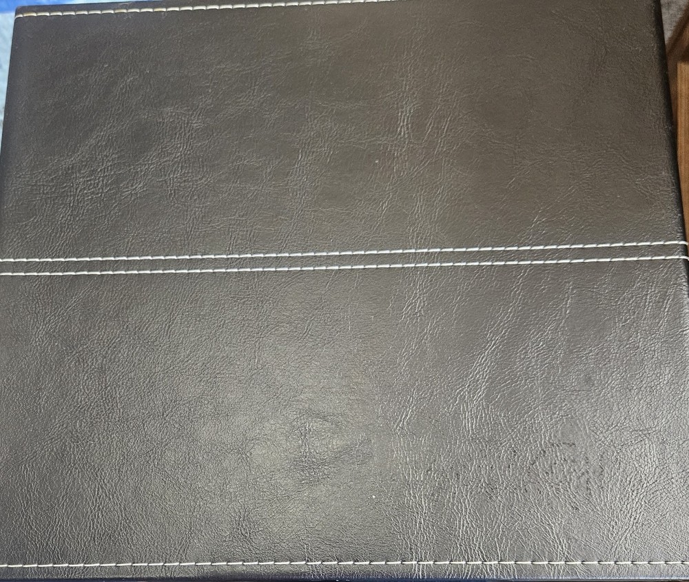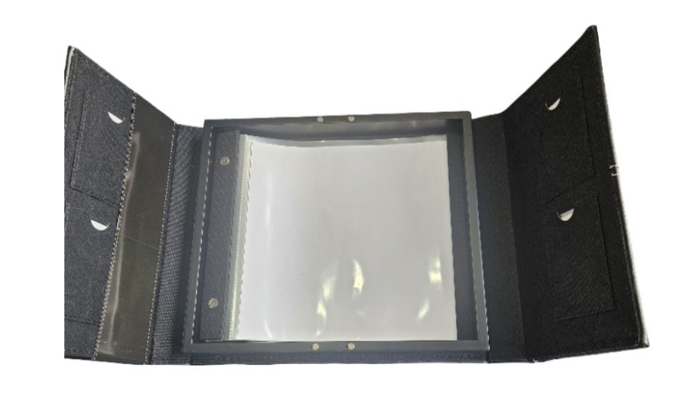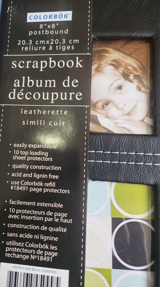 The Colorbök Leatherette Scrapbook Album is a postbound album with a gatefold front opening and four windows. It is black in color and has a size of 8x8 inches. The album features 10 top loading sheet protectors and is designed with black and white stitching. It is brand new and suitable for scrapbooking and paper crafts.