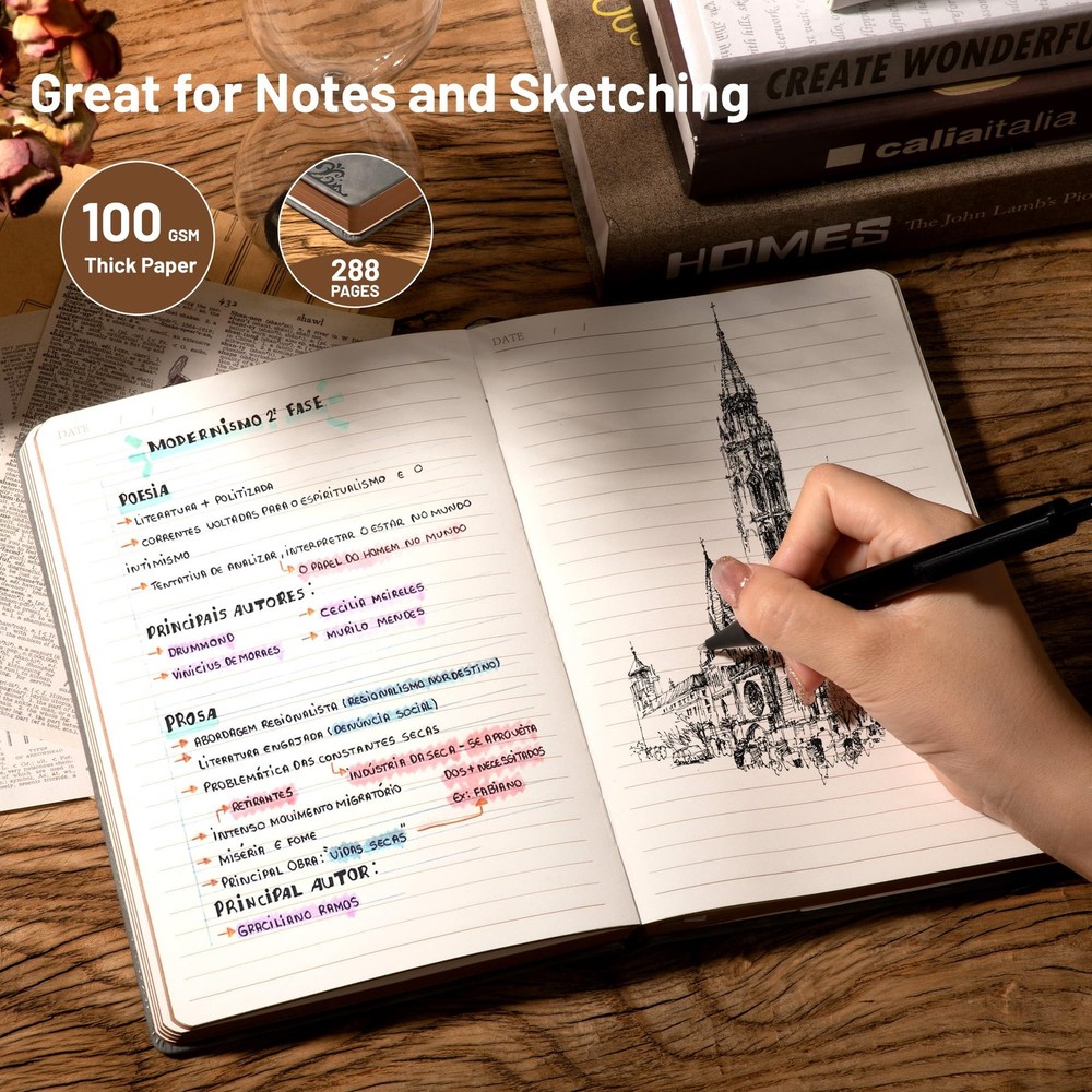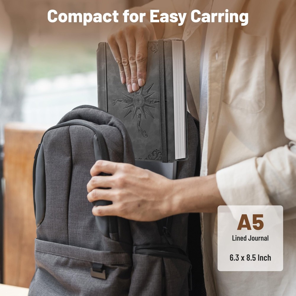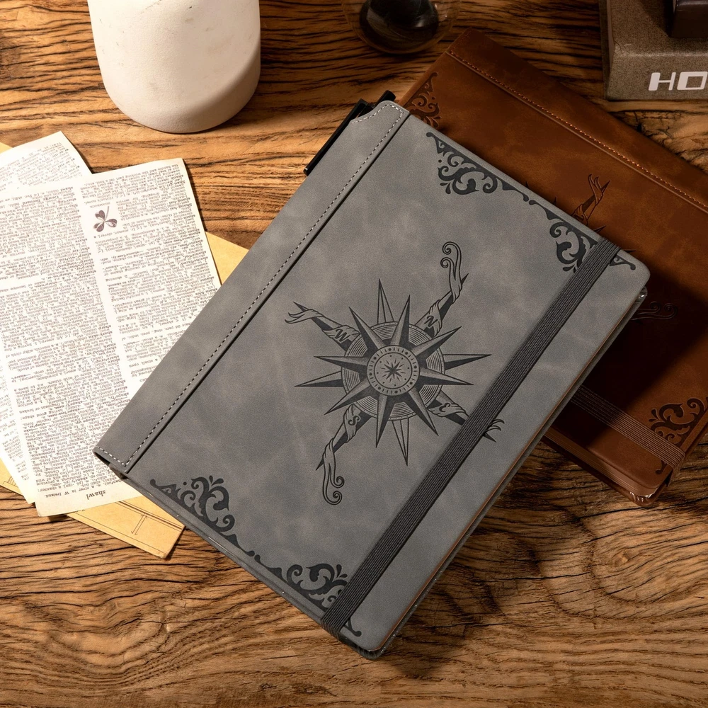 Compass Leather Notebook Journal for Men, Vintage Daily 288 Pages 100 GSM Lined Journals for Writing, Hardcover Journaling Notebooks Gift Set with Pen for Travel Office School Home Writing 【Vegan Leather Bound Journal】 : Vintage notebook with compass embossed, cruelty-free vegan leather cover, fine stitching, and unique spine as pen holder. 6.3"x8.5", compact for easy carry. 【Sturdy Binding】: Hardcover journal strong stitching process and extra layer of leather is sewn to prevent spine damage and pages falling out, The stitched leather on the spine can be used as a pen holder. 【Premium Quality Paper】: Daily journal features 100 gsm 288 pages of premium acid-free paper that prevents ink bleed, erasures, ghosting and shadows while protecting your eyes. 【180°Lay Flat Journal Notebook】: The writing journal 180° lay flat design makes writing easier, reading more convenient, and taking notes more efficient and making it easier to write for both right and left-handed users. 【Notebook Features】: Leather bound notebook has 2 Exquisite ribbon bookmarks to help you find content faster; 1 Elastic closure strap to keep the notebook closed; 1 leather stitched pen holder, can hold most pens; 1 Inner pocket for appointment cards, notes, receipts and more. 【Versatile Use】: Leather notebook is suitable for a variety of occasions, including work, reading, studying, journaling and personal use. this journaling notebook is a reliable companion for capturing ideas, taking notes and unleashing creativity.