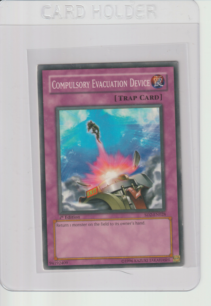 Up for sale is a rare and highly sought-after Yu-Gi-Oh! TCG card - Compulsory Evacuation Device (SD2-EN028) from the Structure Deck: Zombie Madness set. This Trap-Normal card is a must-have for any serious collector or player, and is listed as a 1st Edition Common / Short Print by Konami. This card features an attack power of 0 and defense toughness of 0, and is in English language only. It is perfect for those looking to enhance their gameplay or complete their collection. Don't miss out on the opportunity to own this amazing card!