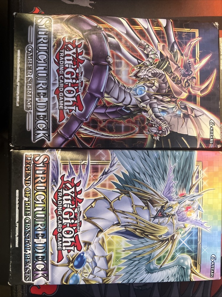 All decks are sealed and new but boxes show definite wear. One of the boxes is open, but deck inside is sealed. The product is a set of two Japanese Yu-Gi-Oh! TCG structure decks - Cyber Strike and Legend of the Crystal Beasts. Each deck contains 48 English cards featuring Crystal as the character. Manufactured by Konami, these 1st Edition decks come in a deck configuration and are part of the - Yugi - set. The decks are sealed, making them collectible and suitable for fans of the game looking to expand their card collection or enhance their gameplay strategies.
