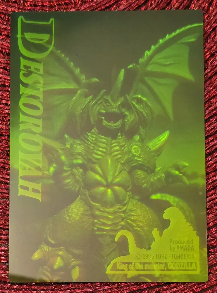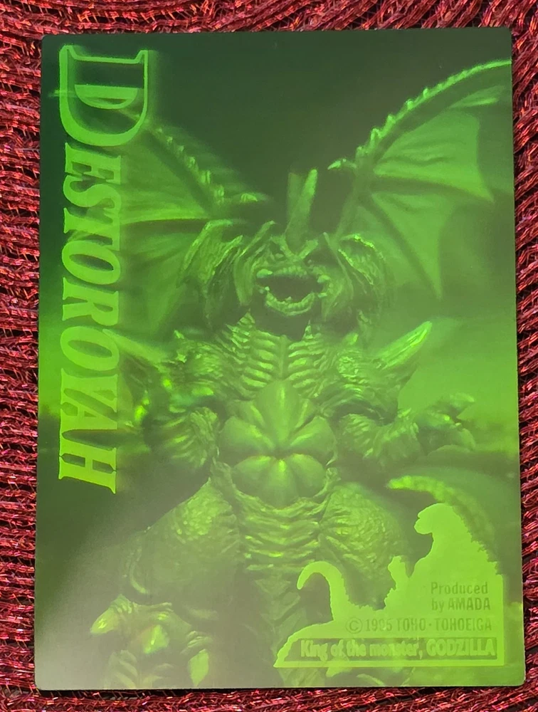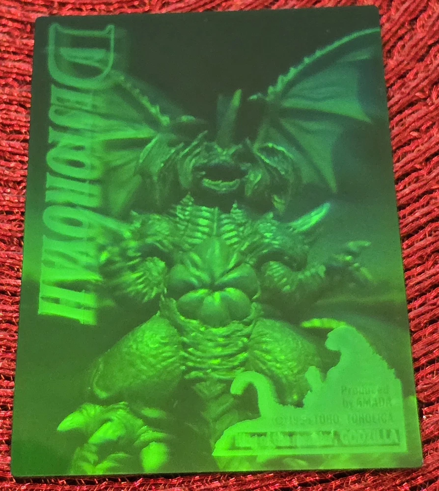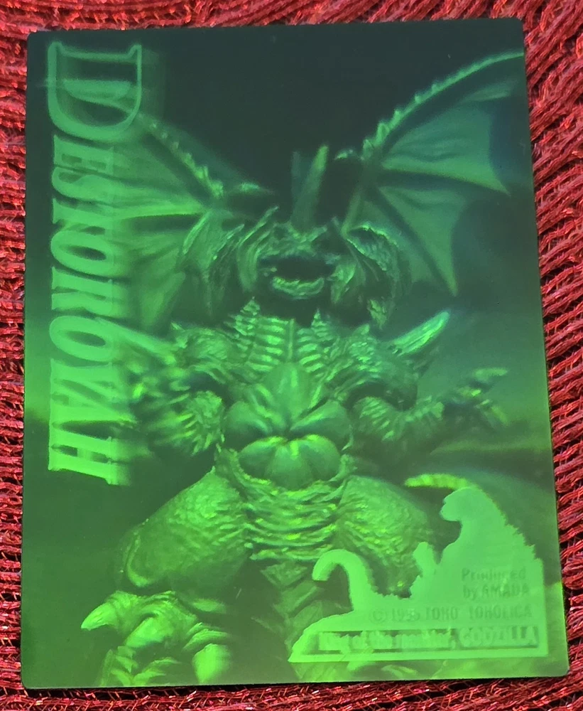 💥💥GEM MINT CONDITION💥💥 This collectible non-sport trading card features DESTOROYAH, from the 1995 Amada Godzilla Story Holograms set. The card is an original, licensed reprint from Amada Printing Mfg. Co., Ltd. and is in mint condition. The card showcases a stunning hologram of the King of the Monster, Godzilla, and is made of high-quality card stock. It is a must-have for fans of the action, sci-fi, and adventure genre, as well as collectors of non-sport trading cards. Add this rare piece to your collection today!