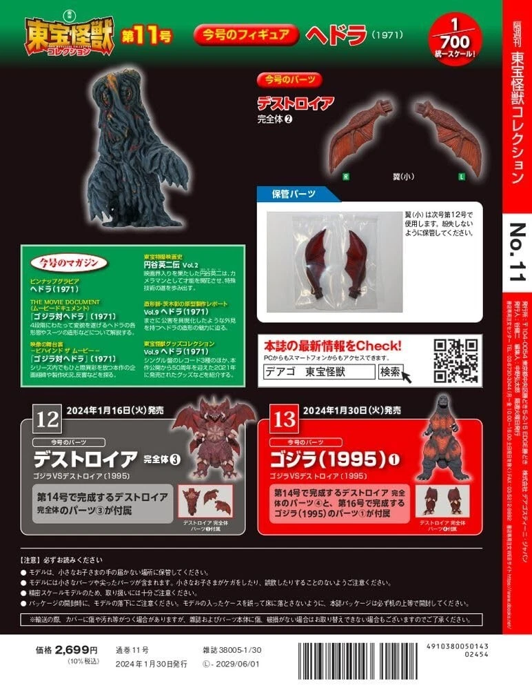 DeAgostini TOHO KAIJU COLLECTION Vol. 11 : HEDORAH 1971 Bi-weekly magazine featuring collector's edition 1/700 scale real-type Toho monster figures! DeAgostini's bi-weekly TOHO MONSTERS Collection Vol. 11, including 12-page magazine with pull-out poster and 1/700 scale real-type Hedorah 1971 figure, plus the parts to continue building the Destroyah (Perfect Form) figure. Released exclusively in Japan on January 4, 2024. NOTE : Because some customers have asked for clarification, this listing is for the SEALED retail edition, and not the subscriber version which doesn't include any outer packaging. The Hedorah 1971 figure stands approximately 3- ¼ " tall and comes fully assembled and painted . Also included are the small wings of the Destroyah (Perfect Form) figure. Additional parts from vols. 10, 12, 13 & 14 are required to complete the Destroyah (Perfect Form) figure, which stands approximately 7" tall and is over 12" in length when fully assembled. In BRAND NEW condition, in sealed near mint condition box. FREE SHIPPING within the USA from a US Seller! If wishing to purchase more than one issue from this series, please contact us for a discounted price! Photos of the completed Destroyah (Perfect Form) figure are for illustrative purposes only.