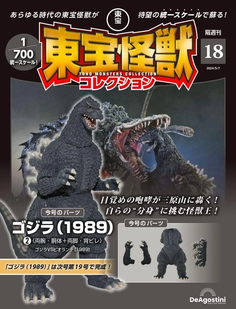 DeAgostini TOHO KAIJU COLLECTION Vol. 18 : GODZILLA 1989 Bi-weekly magazine featuring collector's edition 1/700 scale real-type Toho monster figures! DeAgostini's bi-weekly TOHO MONSTERS Collection Vol. 18, including 12-page magazine with pull-out poster, plus the parts for a 1/700 scale real-type Godzilla 1989 ( vs. Biollante version) figure. Released exclusively in Japan on April 9, 2024. NOTE : Because some customers have asked for clarification, this listing is for the SEALED retail edition, and not the subscriber version which doesn't include any outer packaging. Photos of the completed Godzilla 1989 figure are for illustrative purposes only. Godzilla 1989 parts included with this issue are the torso, legs, dorsal plates and arms. Additional parts from vols. 17 and 19 are required to complete the figure, which stands approximately 4-½" tall when fully assembled. In BRAND NEW condition, in sealed near mint condition box. FREE SHIPPING within the USA from a US Seller! If wishing to purchase more than one issue from this series, please contact us for a discounted price!