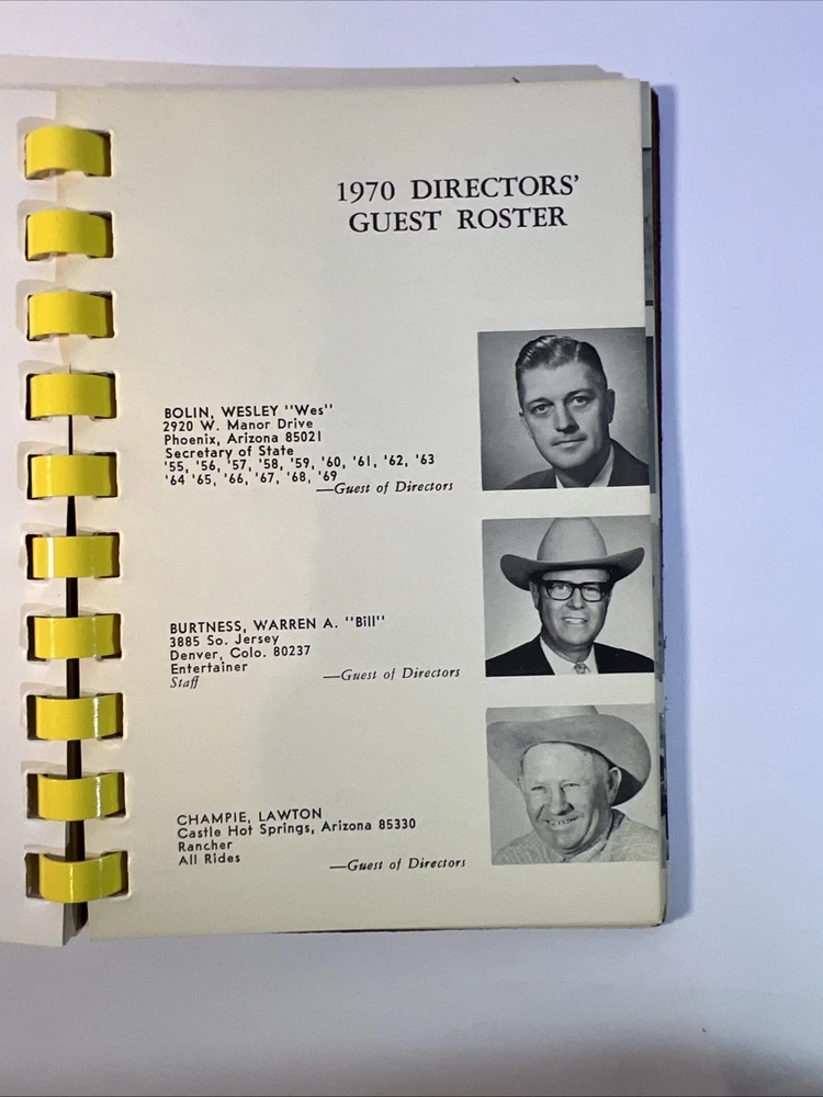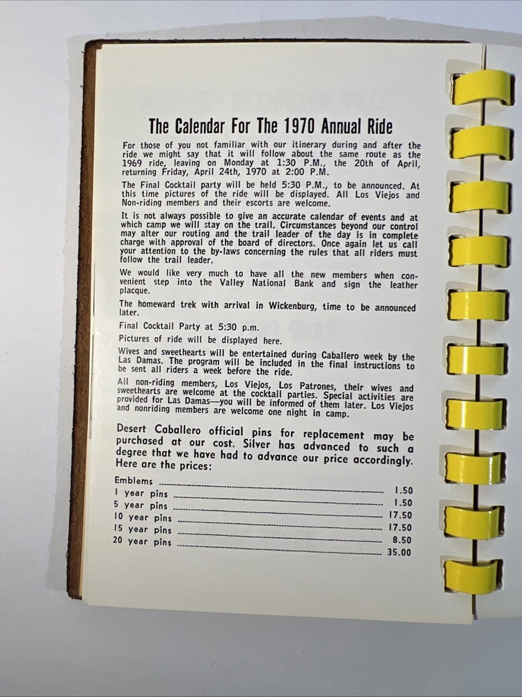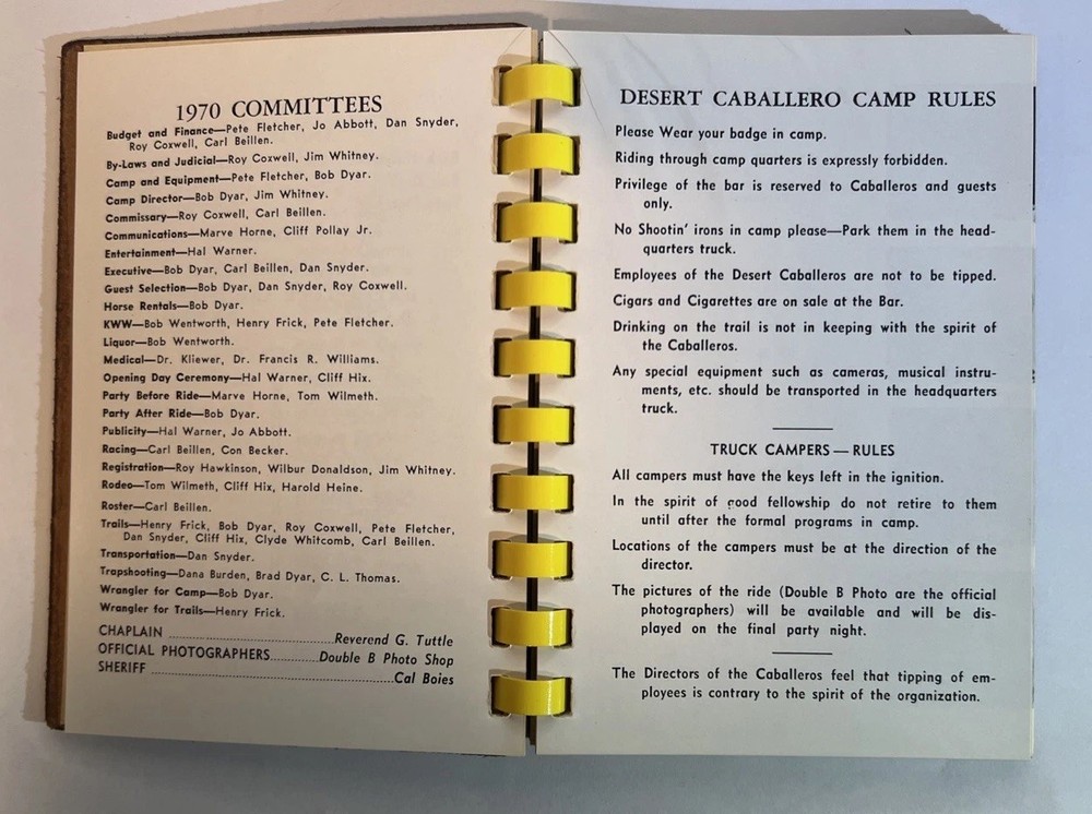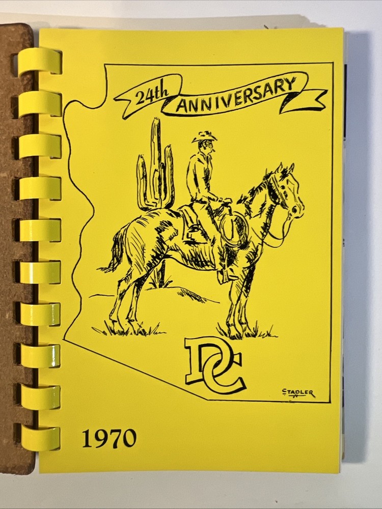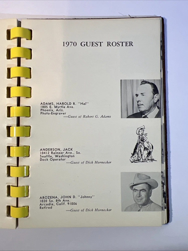 This is a rare and original journal written by Hal Warner in 1970, featuring a roster of members of the Desert Caballeros, a group based in Wickenburg, Arizona. The binding is made of leather and the language used is English. The journal provides a unique insight into the history of the group, making it a valuable item for collectors and enthusiasts.