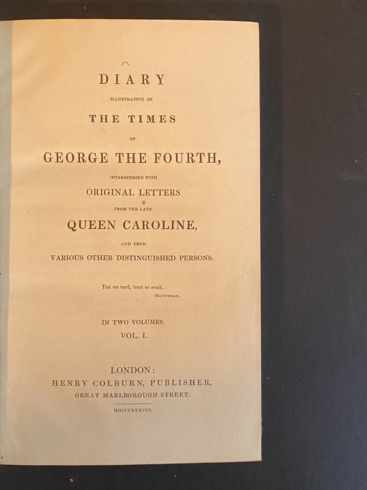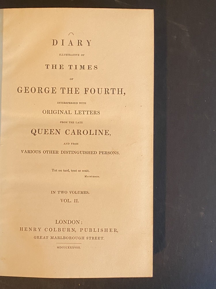 Diary Illustrative of the Times of George the Fourth, Interspersed with Original Letters from the Late Queen Caroline and from Various Other Distinguished Persons. In Two Henry Colburn, Publisher. London, 1838. 2V bound in full calf. A Very Good set.