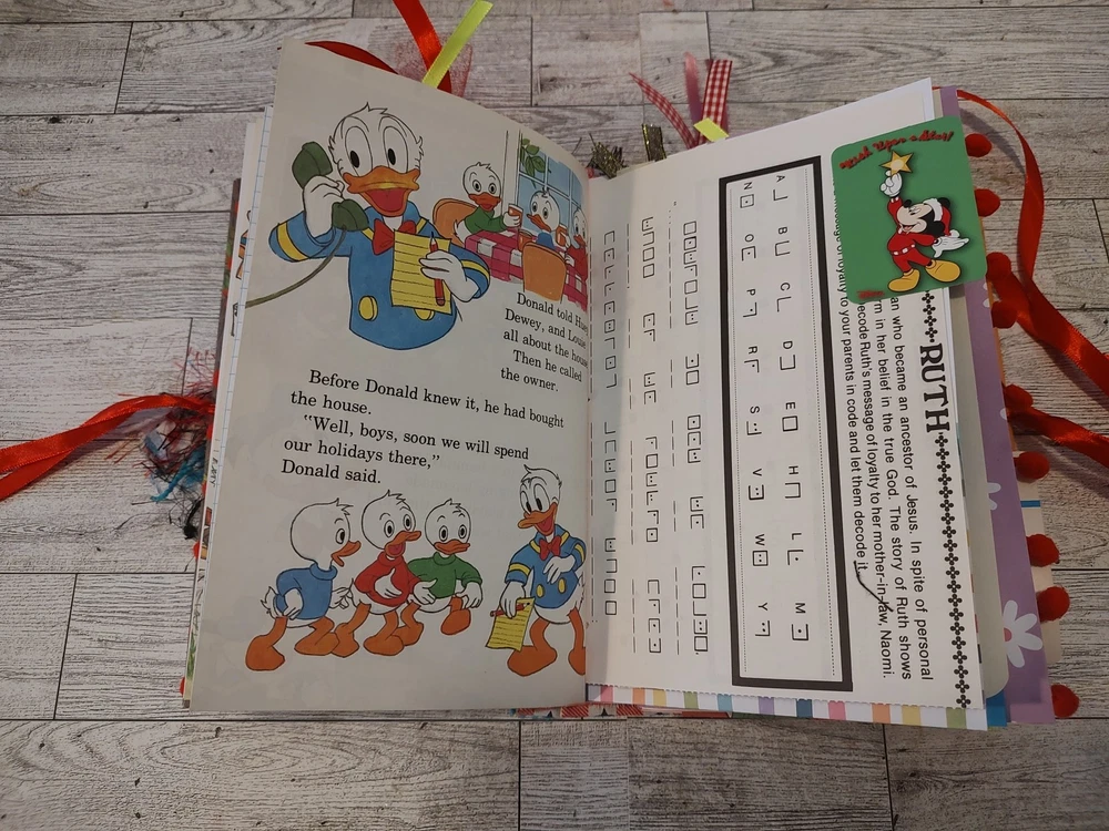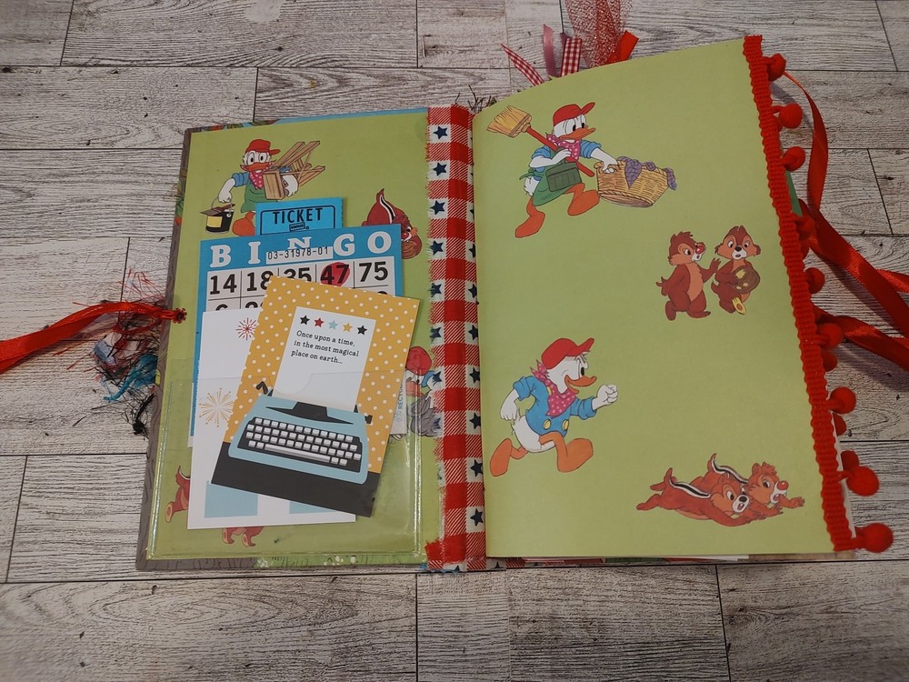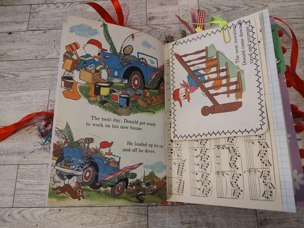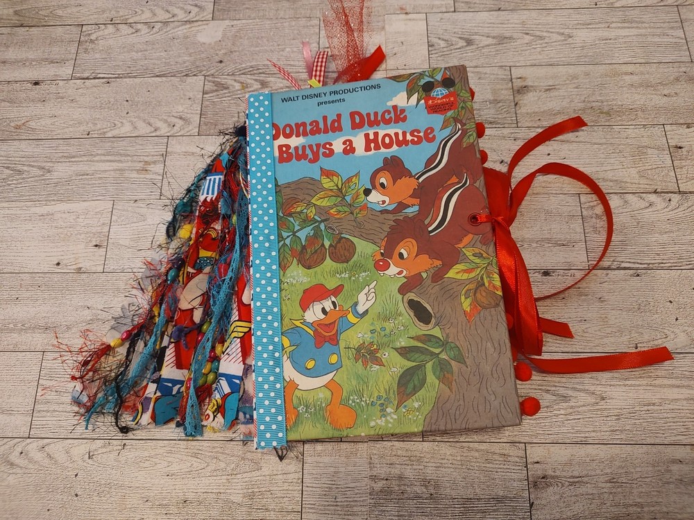 This journal is handmade from a vintage Disney Donald duck hardcover book, the pages are from scrapbook paper and papers that I have thrifted. It is also packed with lots of handmade ephemera and the pages from the original book as well as vintage ephemera. This journal is approximately 5 3/4 inches wide, it is about 8 3/4 in tall, it has a 1 1/2 inch spine and 2 signatures. It has approximately 40 pages or 80 surfaces for you to use as you wish. Thank you! I always combine shipping in case you want something else from my shop, thank you! You can just make your purchases and then I will refund any postal overage.